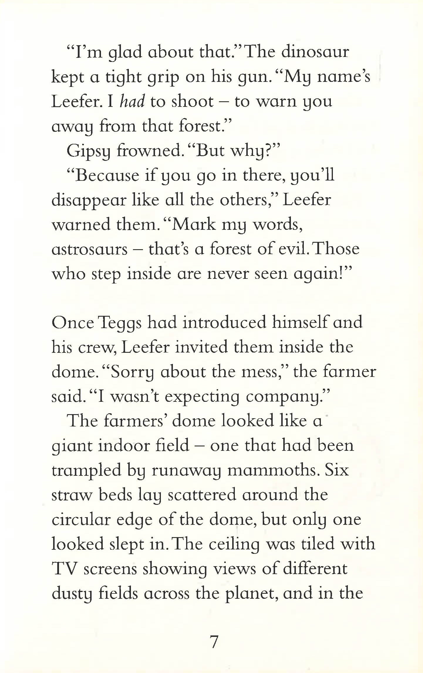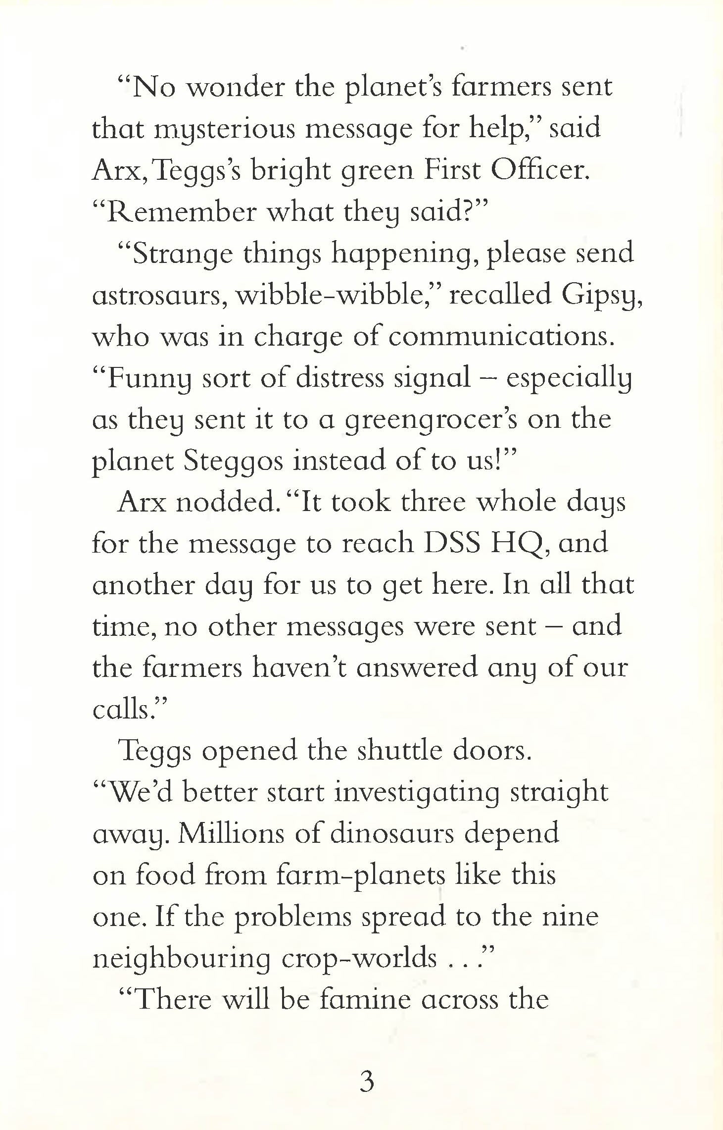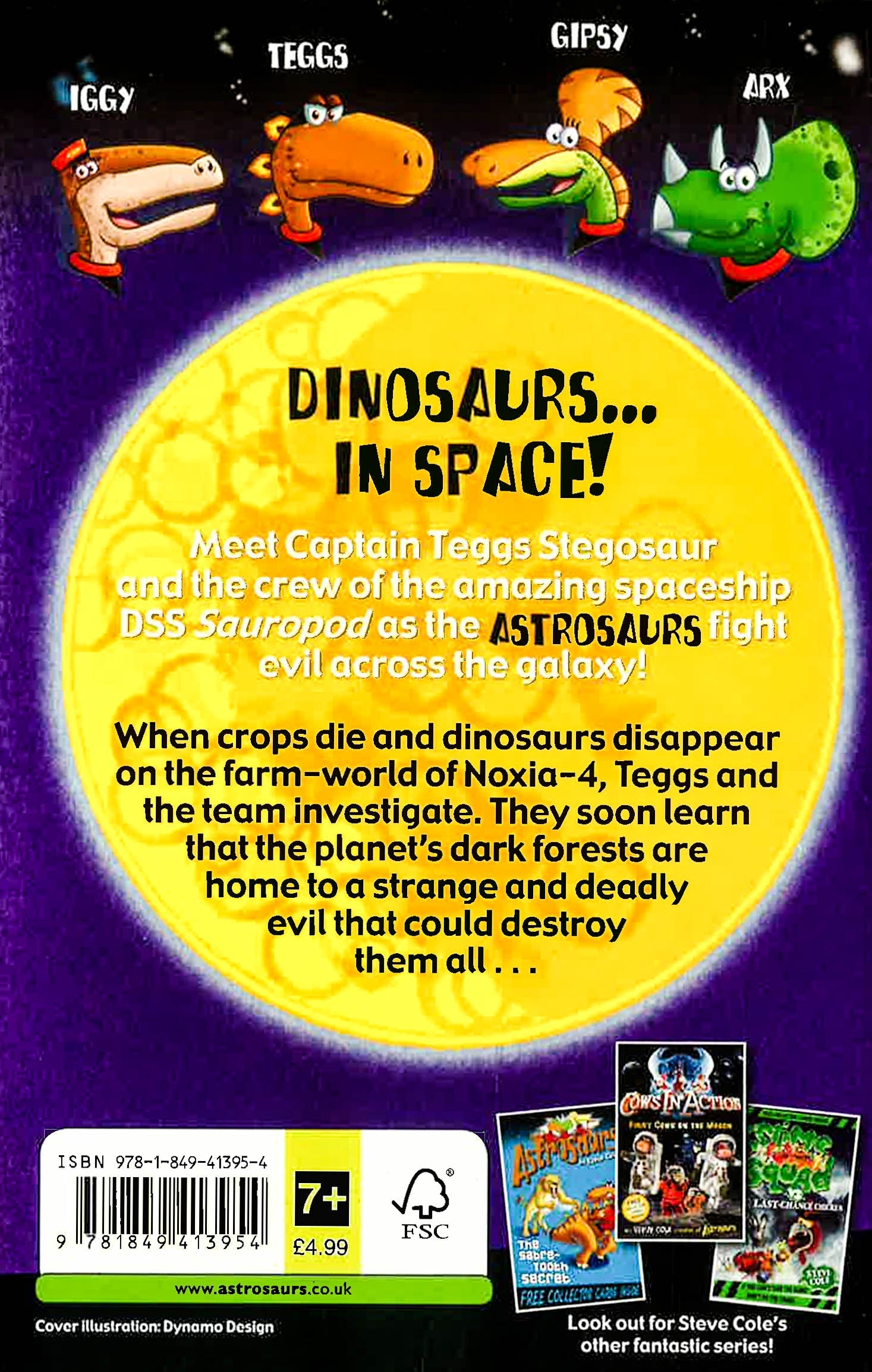 Another action-packed adventure from the astro-nomically popular Steve Cole. Meet Captain Teggs Stegosaur and the crew of the amazing spaceship DSS Sauropod as the ASTROSAURS fight evil across the galaxy! Noxia-4 is a farm-planet; a world of plants that feeds billions of hungry dinos. But when the harvest fails and the farmers are attacked, Teggs and the team investigate - and soon learn that the Noxia-4's dark forests are home to a strange and deadly evil that could destroy them all . . .