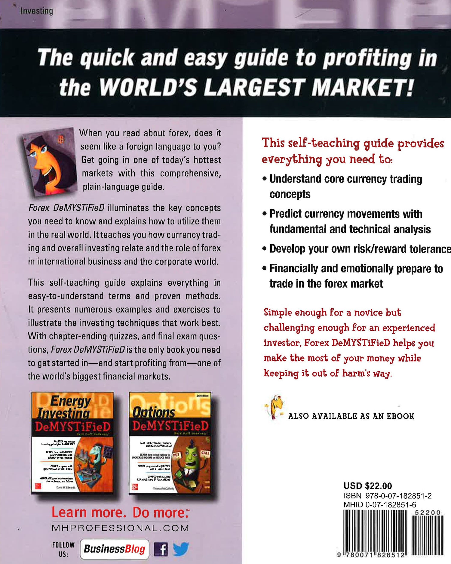 The quick and easy guide to profiting in the WORLD'S LARGEST MARKET!When you read about forex, does it seem like a foreign language to you? Get going in one of today's hottest markets with this comprehensive, plain-language guide. Forex DeMYSTiFieD illuminates the key conceptsyou need to know and explains how to utilize them in the real world. It teaches you how currency trading and overall investing relate and the role of forex in international business and the corporate world. This self-teaching guide explains everything in easy-to-understand terms and proven methods. It presents numerous examples and exercises to illustrate the investing techniques that work best. With chapter-ending quizzes, and final exam questions, Forex DeMYSTiFieD is the only book you need to get started in--and start profiting from--one of the world's biggest financial markets. This self-teaching guide provides everything you need to: Understand core currency trading conceptsPredict currency movements with fundamental and technical analysisDevelop your own risk/reward tolerance Financially and emotionally prepare to trade in the forex market. Simple enough for a novice but challenging enough for an experienced investor, Forex DeMYSTiFieD helps youmake the most of your money while keeping it out of harm's way.