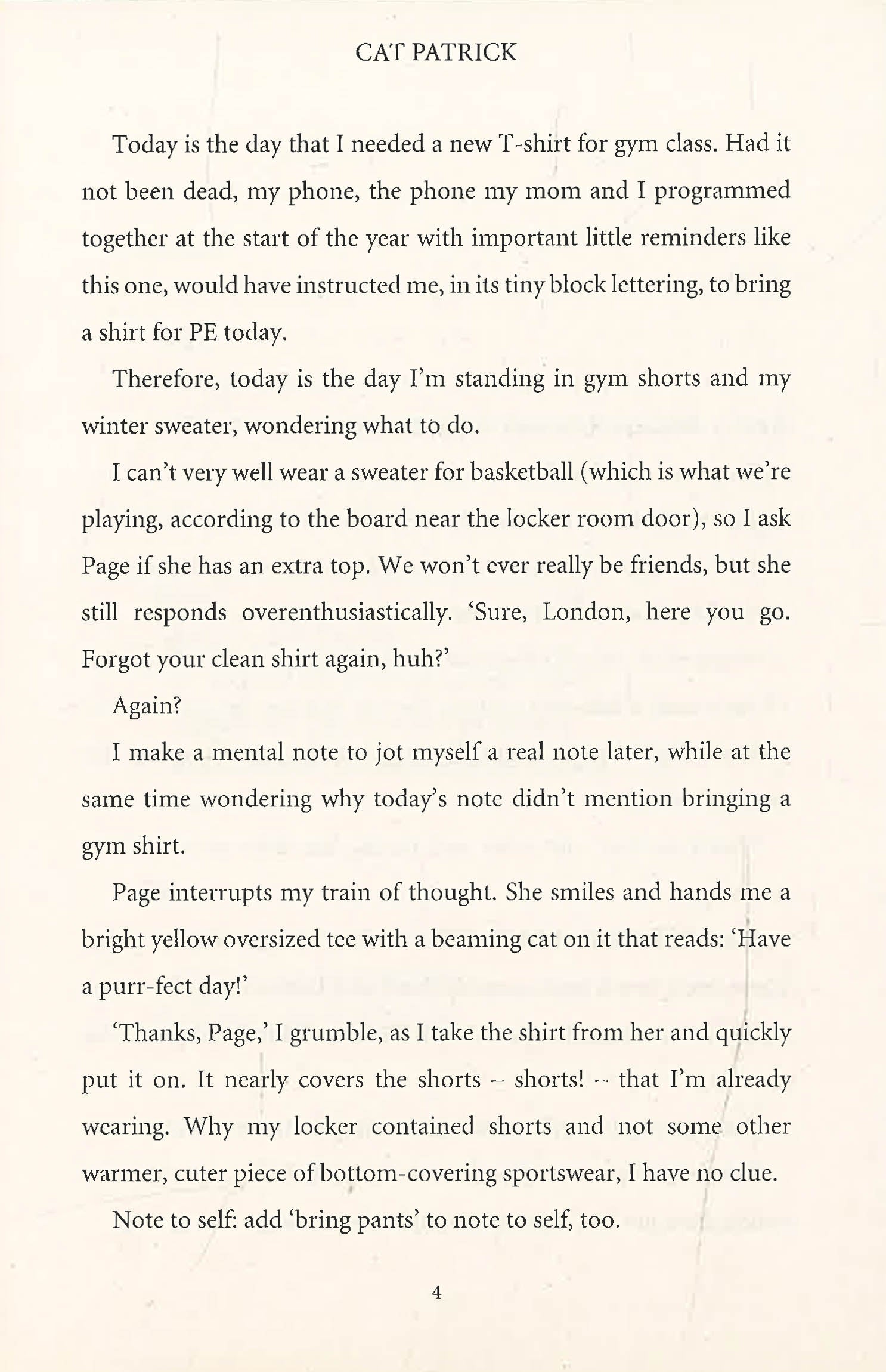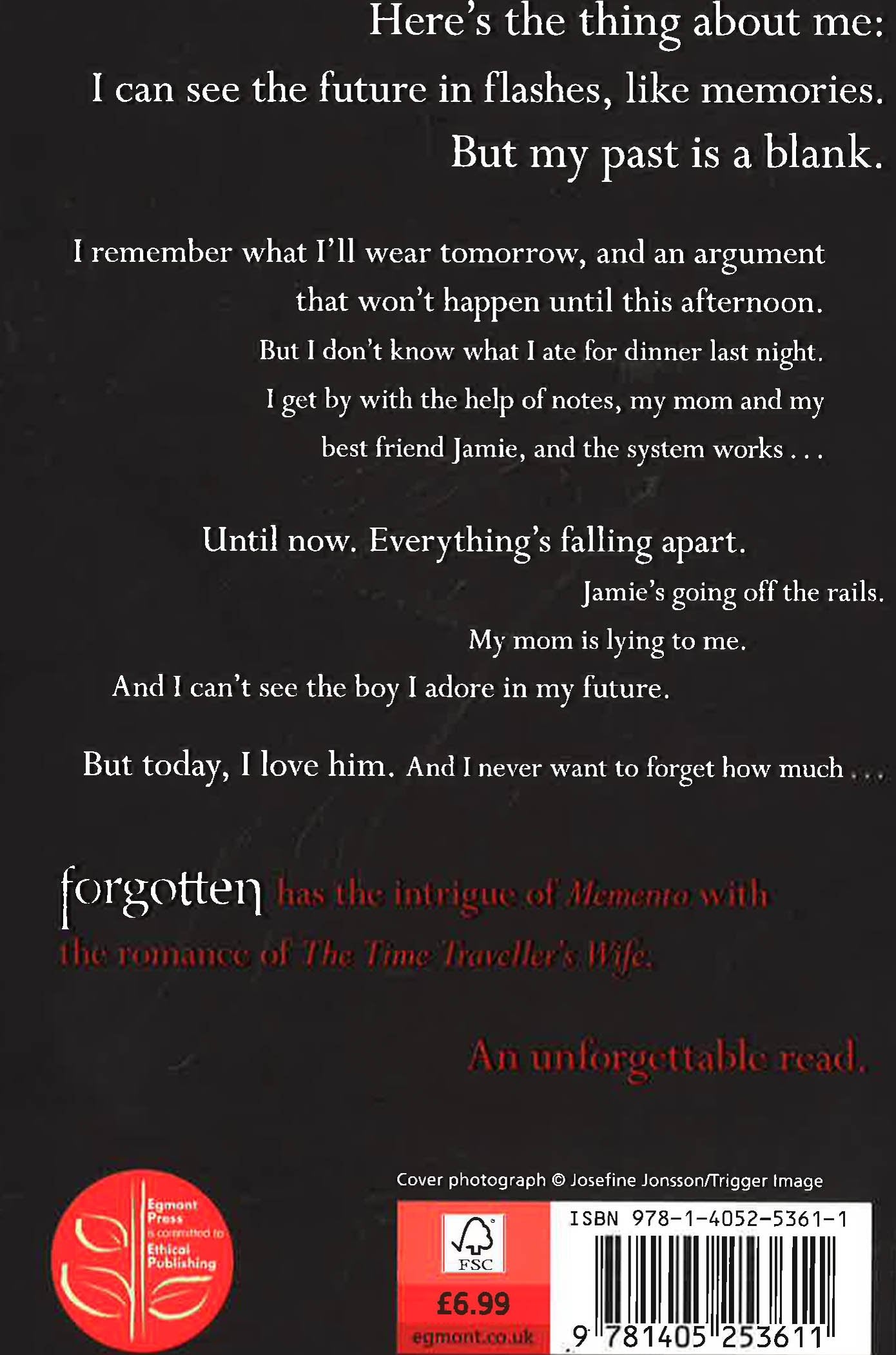 Here's the thing about me: I can see the future in flashes, like memories. But my past is a blank. I remember what I'll wear tomorrow, and an argument that won't happen until this afternoon. But I don't know what I ate for dinner last night. I get by with the help of notes, my mom and my best friend Jamie, and the system works . . . Until now. Everything's falling apart. Jamie's going of the rails. My mom is lying to me. And I can't see the boy I adore in my future. But today, I love him. And I never want to forget how much . . . Forgotten is a dark, against-the-odds romance like no other. Cat Patrick's debut novel for young adults is the perfect read for everyone who loved Rachel Ward's Numbers or Teri Terry's Slated trilogy. This is teen fiction at its most absorbing. Look out for Cat's other books: Just Like Fate (with Suzanne Young), Revived and The Originals. `A fantastic, absorbing debut that will have you reading in every spare second' - Thirst for Fiction, YA blogger.