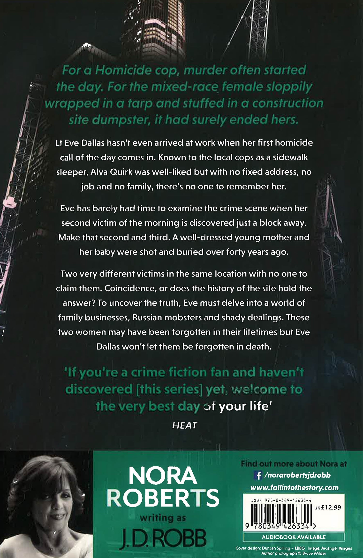 Two very different victims in the same location with no-one to claim them. Coincidence or does the history of the site hold the answer? To uncover the truth Eve must delve into a world of family businesses, Russian mobsters and shady dealings. These two women may have been forgotten in their lifetimes but Eve Dallas won't let them be forgotten in death