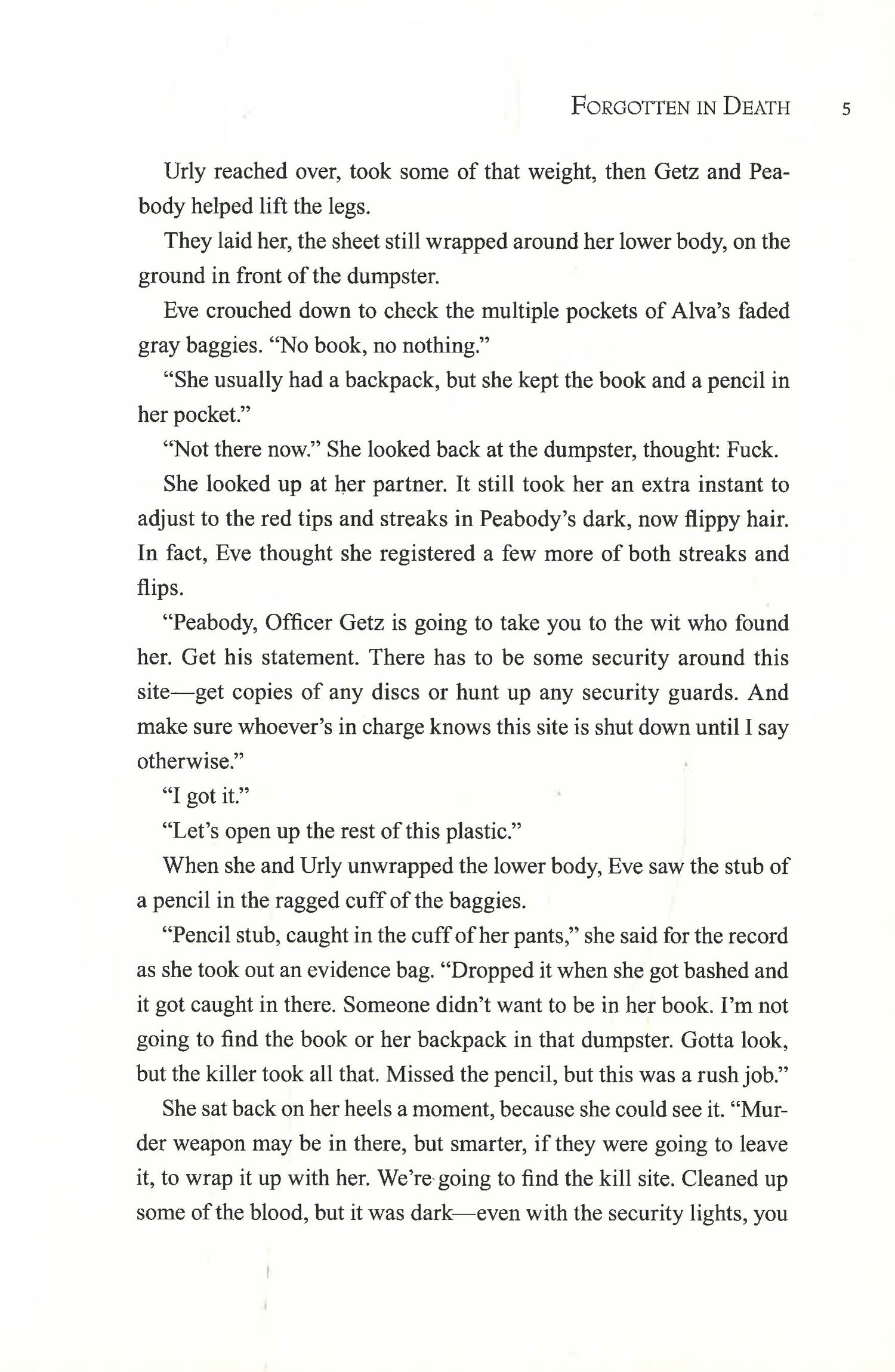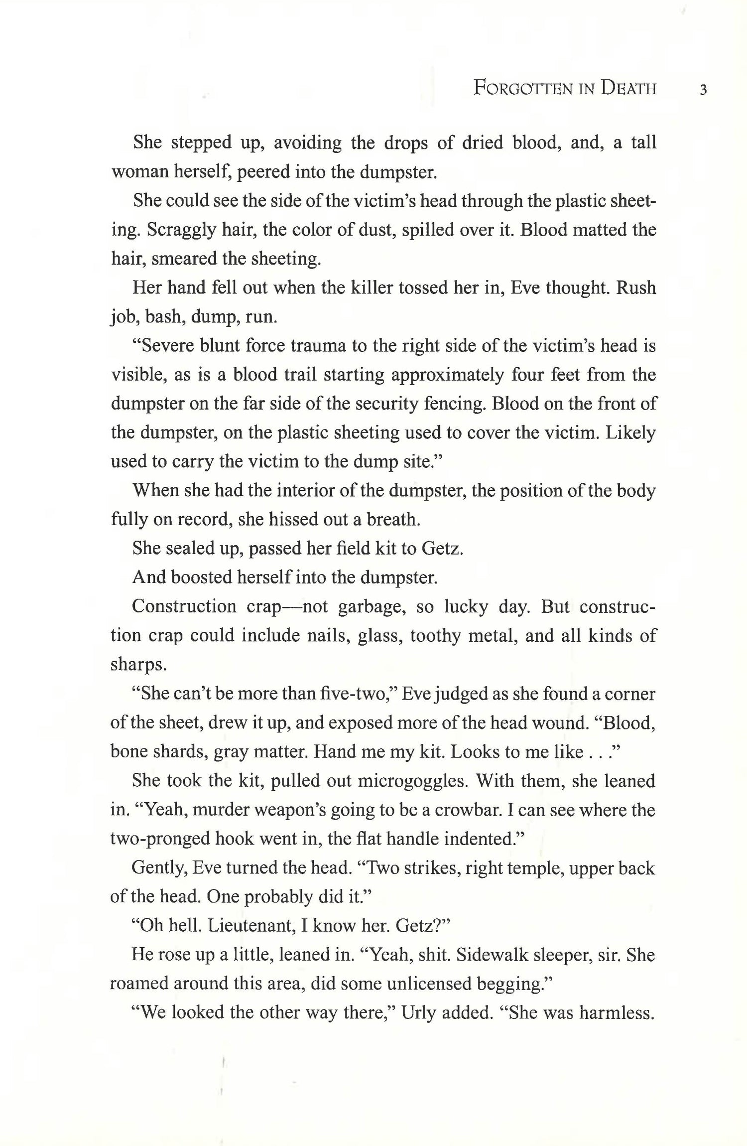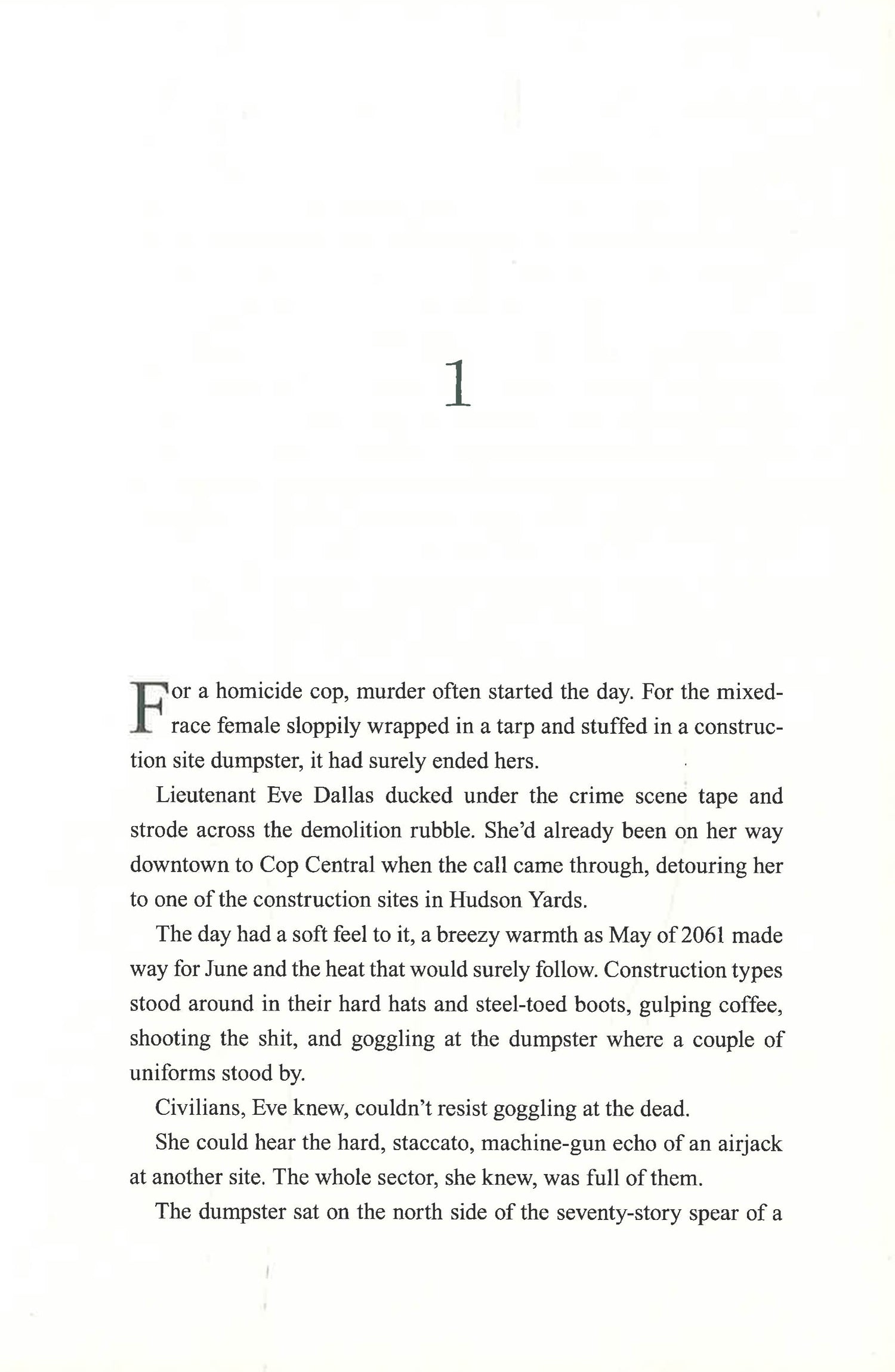 Lt. Eve Dallas hasn't even arrived at work when her first call of the day comes in. Alva Quirk - forty-six years old, sidewalk sleeper - was beaten to death with a crowbar. Known to the local cops for handing out origami flowers to anyone who gives her change, Alva was well-liked but with no fixed address, no job and no family, there's noone to remember her.