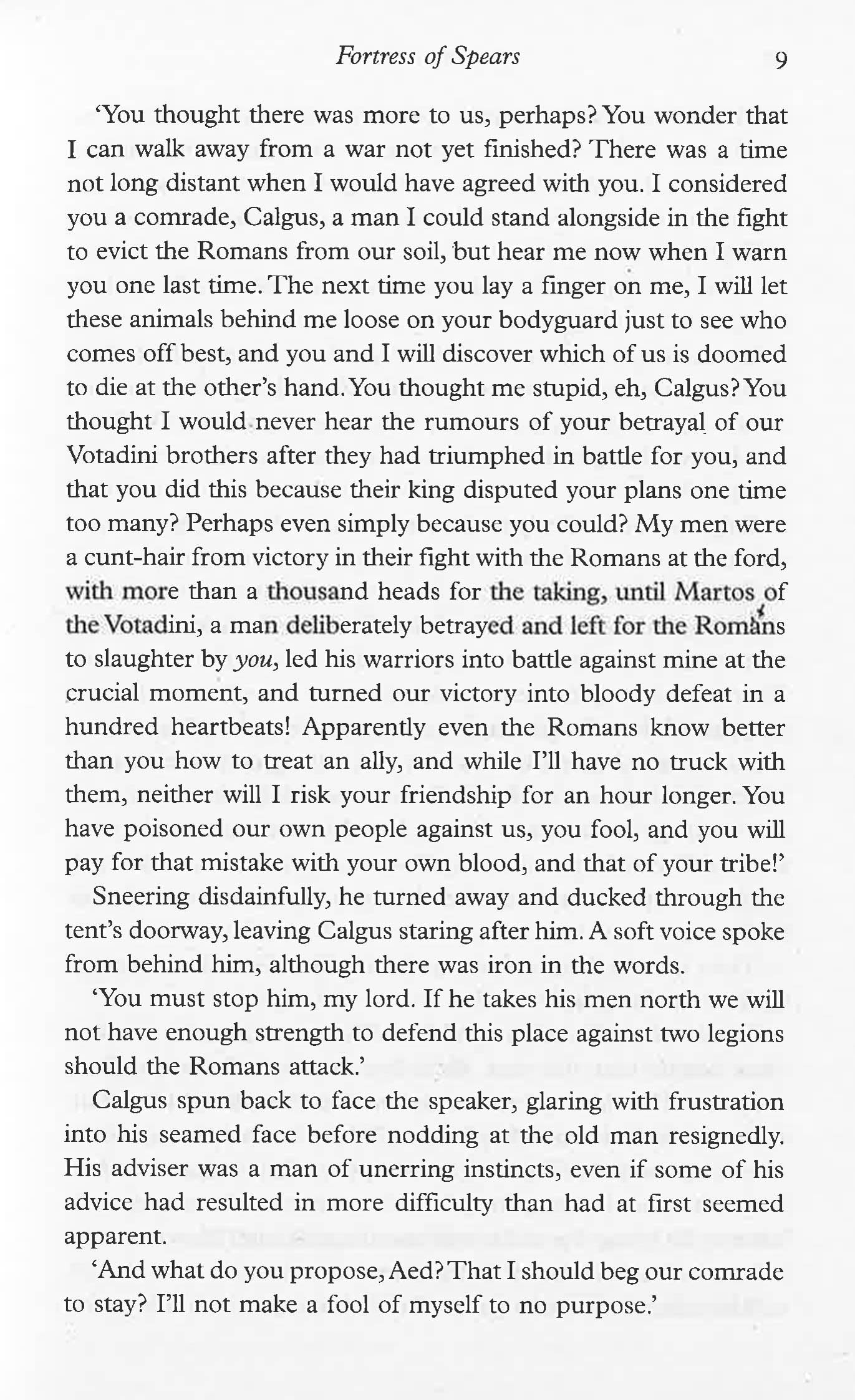 The Romans have vanquished the rebel alliance; Calgus, Lord of the Northern Tribes, is the prisoner of the chieftains he once led. And the Roman leader has an audacious plan to capture Dinpaladyr, the barbarians' fortress of spears.