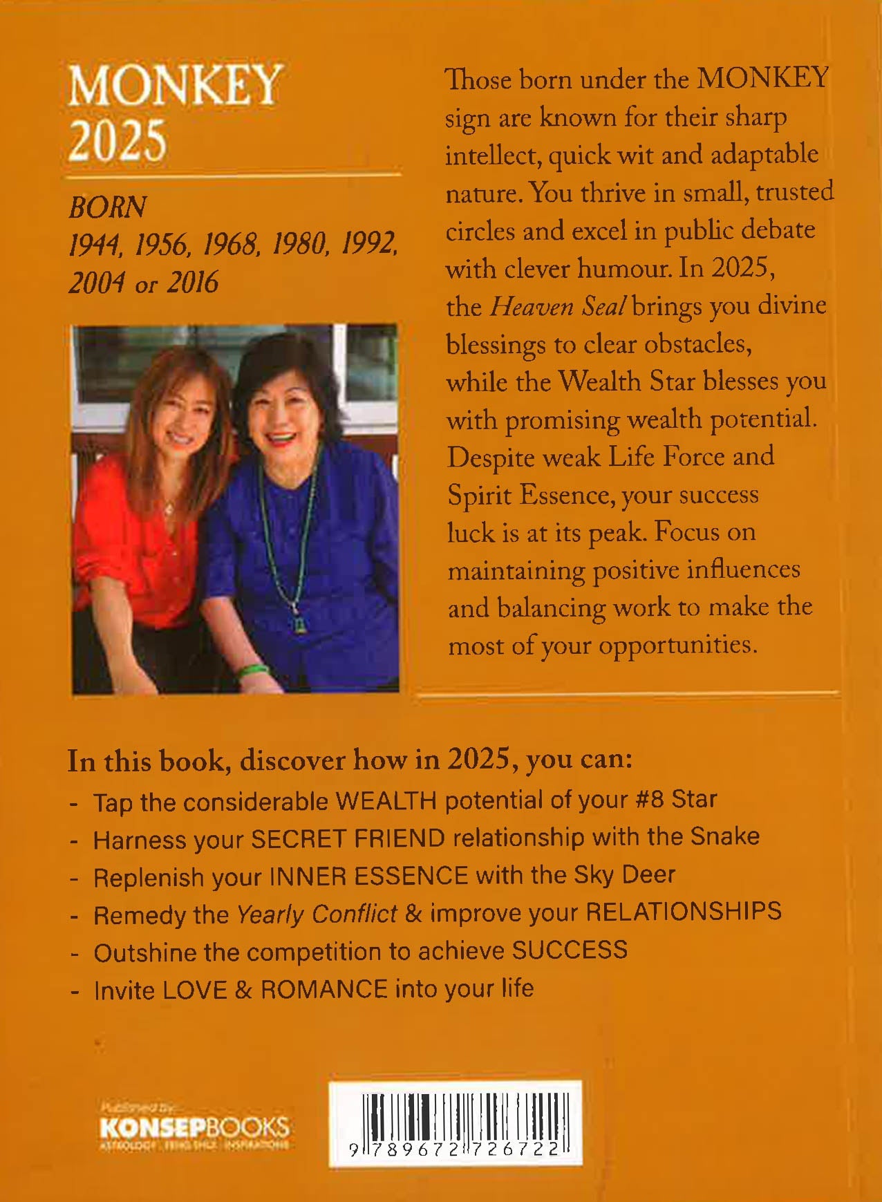 Those born under the MONKEY sign are known for their sharp intellect, quick wit and adaptable nature. You thrive in small, trusted circles and excel in public debate with clever humour. In 2025, the Heaven Seal brings you divine blessings to clear obstacles, while the Wealth Star blesses you with promising wealth potential. Despite weak Life Force and Spirit Essence, your success luck is at its peak. Focus on maintaining positive influences and balancing work to make the most of your opportunities.