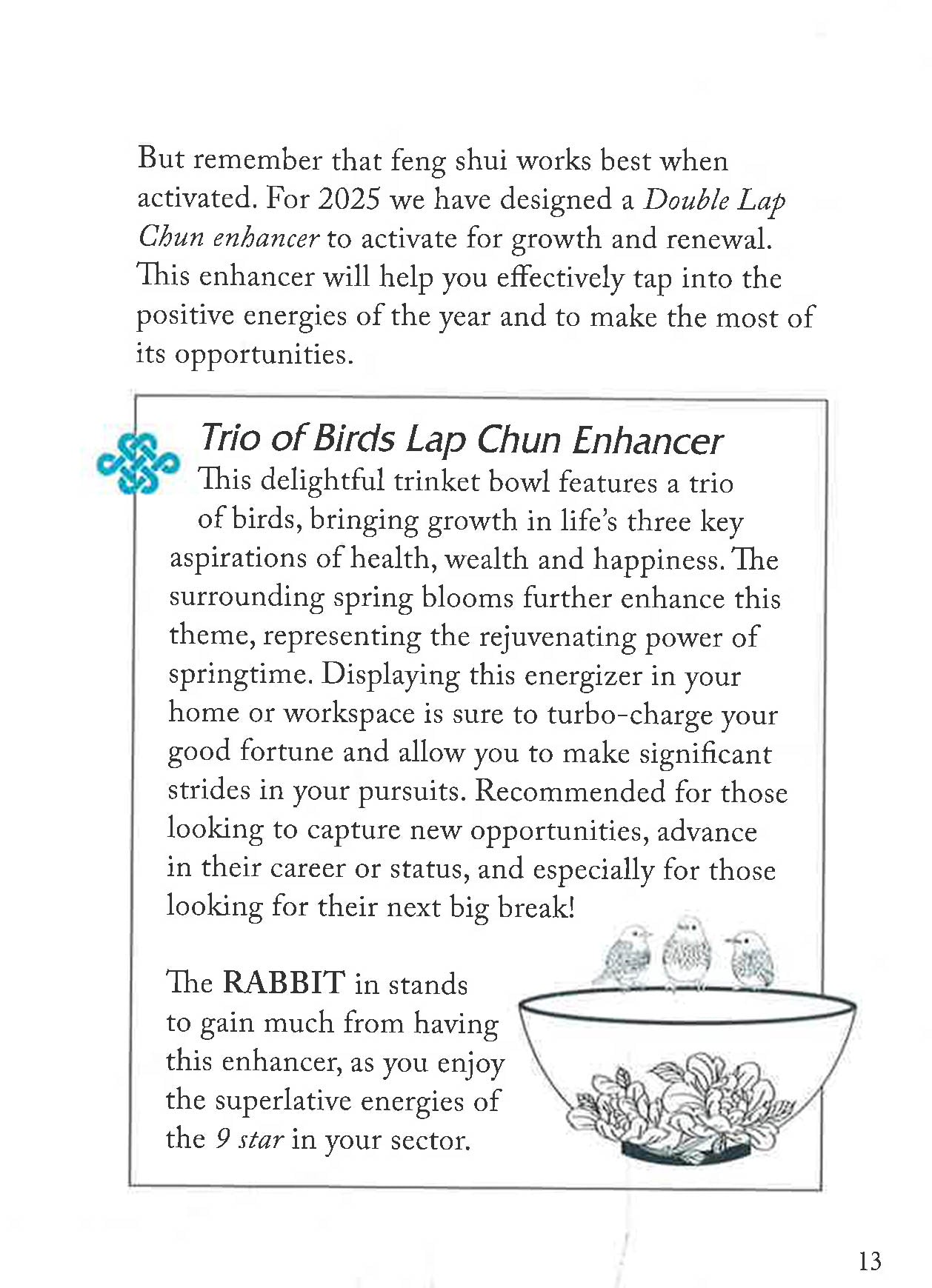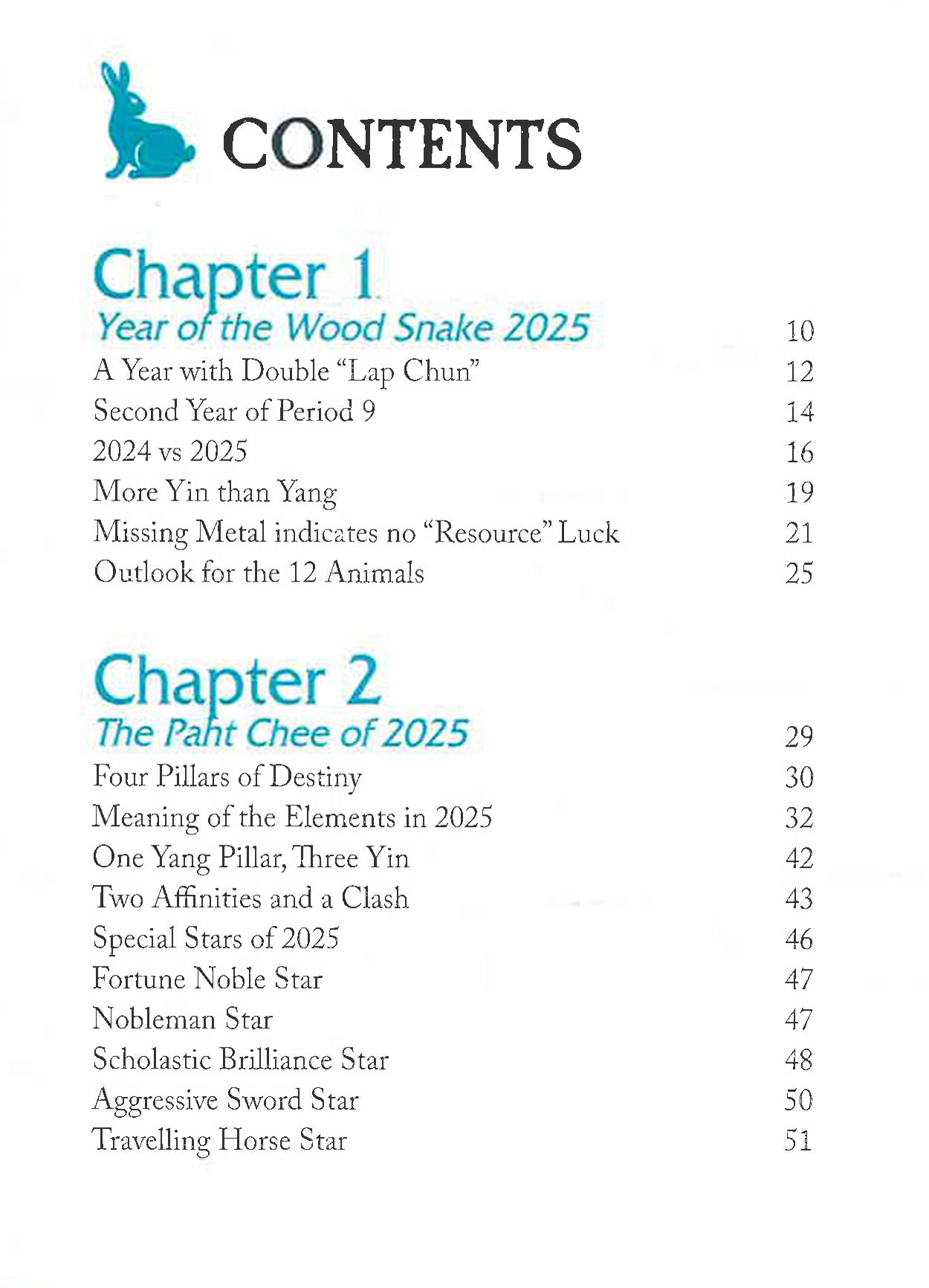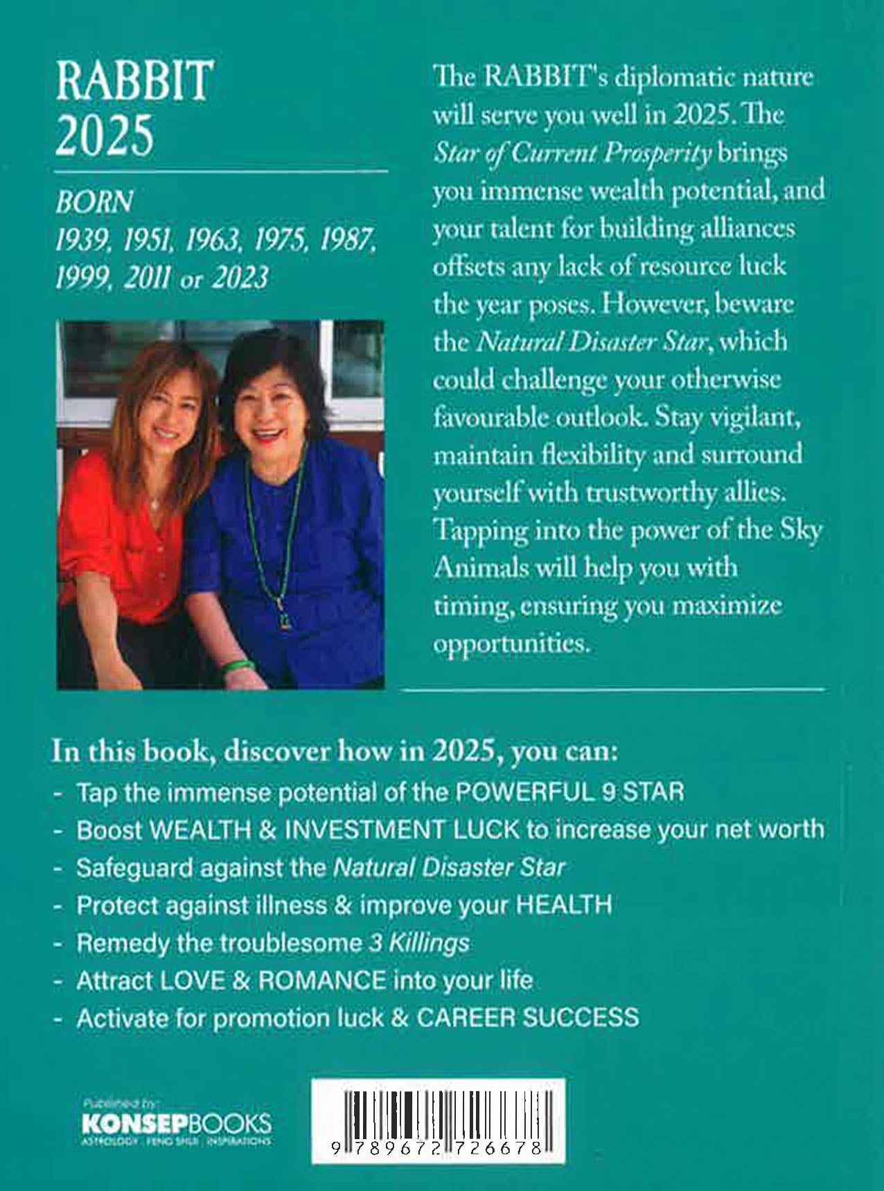 The RABBIT's diplomatic nature will serve you well in 2025. The Star of Current Prosperity brings you immense wealth potential, and your talent for building alliances offsets any lack of resource luck the year poses. However, beware the Natural Disaster Star, which could challenge your otherwise favourable outlook. Stay vigilant, maintain flexibility and surround yourself with trustworthy allies. Tapping into the power of the Sky Animals will help you with timing, ensuring you maximize opportunities.