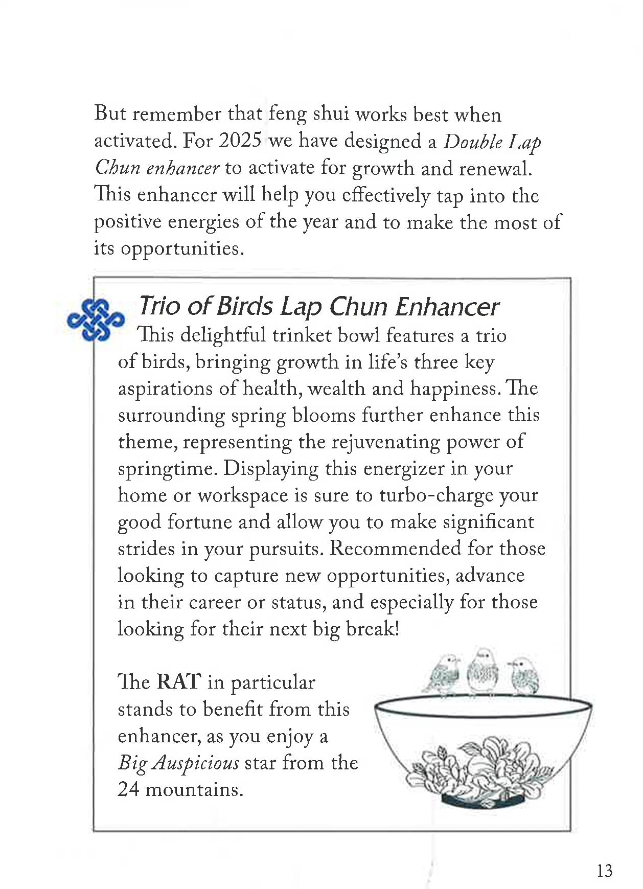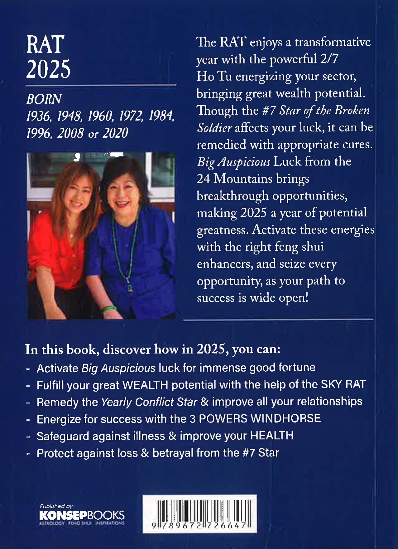The RAT enjoys a transformative year with the powerful 2/7 Ho Tu energizing your sector, bringing great wealth potential. Though the #7 Star of the Broken Soldier affects your luck, it can be remedied with appropriate cures. Big Auspicious Luck from the 24 Mountains brings breakthrough opportunities, making 2025 a year of potential greatness. Activate these energies with the right feng shui enhancers, and seize every opportunity, as your path to success is wide open!