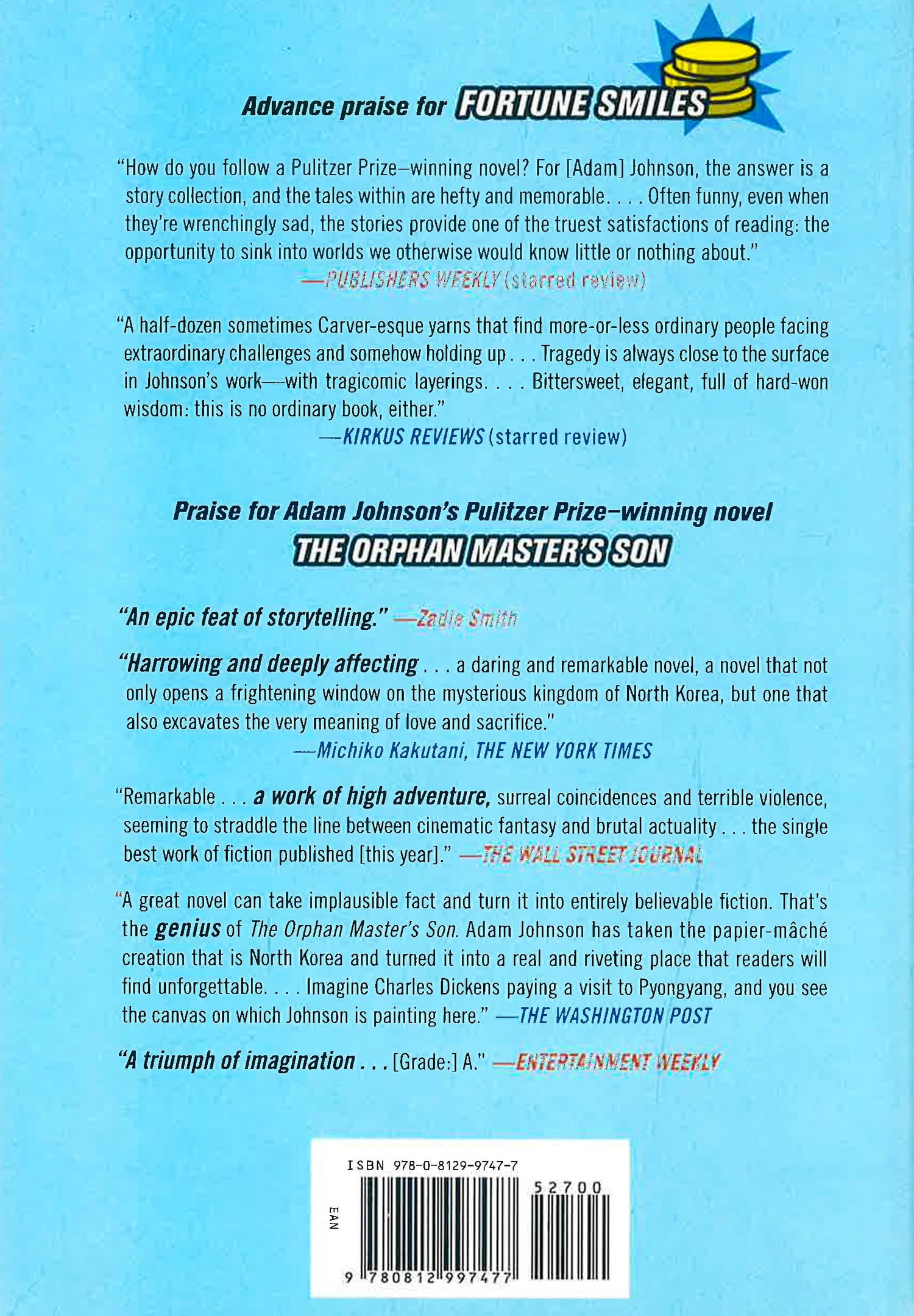 The National Book Award-winning story collection from the author of The Orphan Master's Son offers something rare in fiction: a new way of looking at the world. "MASTERFUL."--The Washington Post "ENTRANCING."--O: The Oprah Magazine "PERCEPTIVE AND BRAVE."--The New York Times Throughout these six stories, Pulitzer Prize winner Adam Johnson delves deep into love and loss, natural disasters, the influence of technology, and how the political shapes the personal, giving voice to the perspectives we don't often hear. In "Nirvana," a programmer whose wife has a rare disease finds solace in a digital simulacrum of the president of the United States. In "Hurricanes Anonymous," a young man searches for the mother of his son in a Louisiana devastated by Hurricanes Katrina and Rita. "George Orwell Was a Friend of Mine" follows a former warden of a Stasi prison in East Germany who vehemently denies his past, even as pieces of it are delivered in packages to his door. And in the unforgettable title story, Johnson returns to his signature subject, North Korea, depicting two defectors from Pyongyang who are trying to adapt to their new lives in Seoul, while one cannot forget the woman he left behind. WINNER OF THE STORY PRIZE - A NEW YORK TIMES NOTABLE BOOK NAMED ONE OF THE TEN BEST BOOKS OF THE YEAR BY The Miami Herald - San Francisco Chronicle - USA Today AND ONE OF THE BEST BOOKS OF THE YEAR BY The Washington Post - NPR - Marie Claire - St. Louis Post-Dispatch - BuzzFeed - The Daily Beast - Los Angeles Magazine - The Independent - BookPage - Kirkus Reviews "Remarkable . . . Adam Johnson is one of America's greatest living writers."--The Huffington Post "Haunting, harrowing . . . Johnson's writing is as rich in compassion as it is in invention, and that rare combination makes Fortune Smiles worth treasuring."--USA Today "Fortune Smiles [blends] exotic scenarios, morally compromised characters, high-wire action, rigorously limber prose, dense thickets of emotion, and, most critically, our current techno-moment."--The Boston Globe "Johnson's boundary-pushing stories make for exhilarating reading."--San Francisco Chronicle