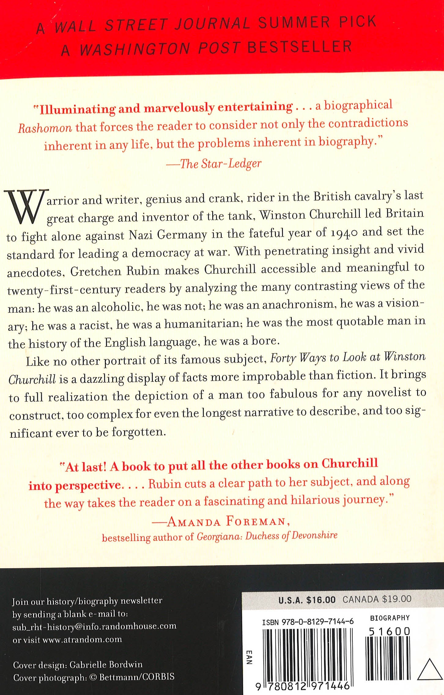 A WALL STREET JOURNAL SUMMER PICKA WASHINGTON POST BESTSELLER Warrior and writer, genius and crank, rider in the British cavalry's last great charge and inventor of the tank, Winston Churchill led Britain to fight alone against Nazi Germany in the fateful year of 1940 and set the standard for leading a democracy at war. With penetrating insight and vivid anecdotes, Gretchen Rubin makes Churchill accessible and meaningful to twenty-first-century readers by analyzing the many contrasting views of the man: he was an alcoholic, he was not; he was an anachronism, he was a visionary; he was a racist, he was a humanitarian; he was the most quotable man in the history of the English language, he was a bore. Like no other portrait of its famous subject, Forty Ways to Look at Winston Churchill is a dazzling display of facts more improbable than fiction. It brings to full realization the depiction of a man too fabulous for any novelist to construct, too complex for even the longest narrative to describe, and too significant ever to be forgotten.