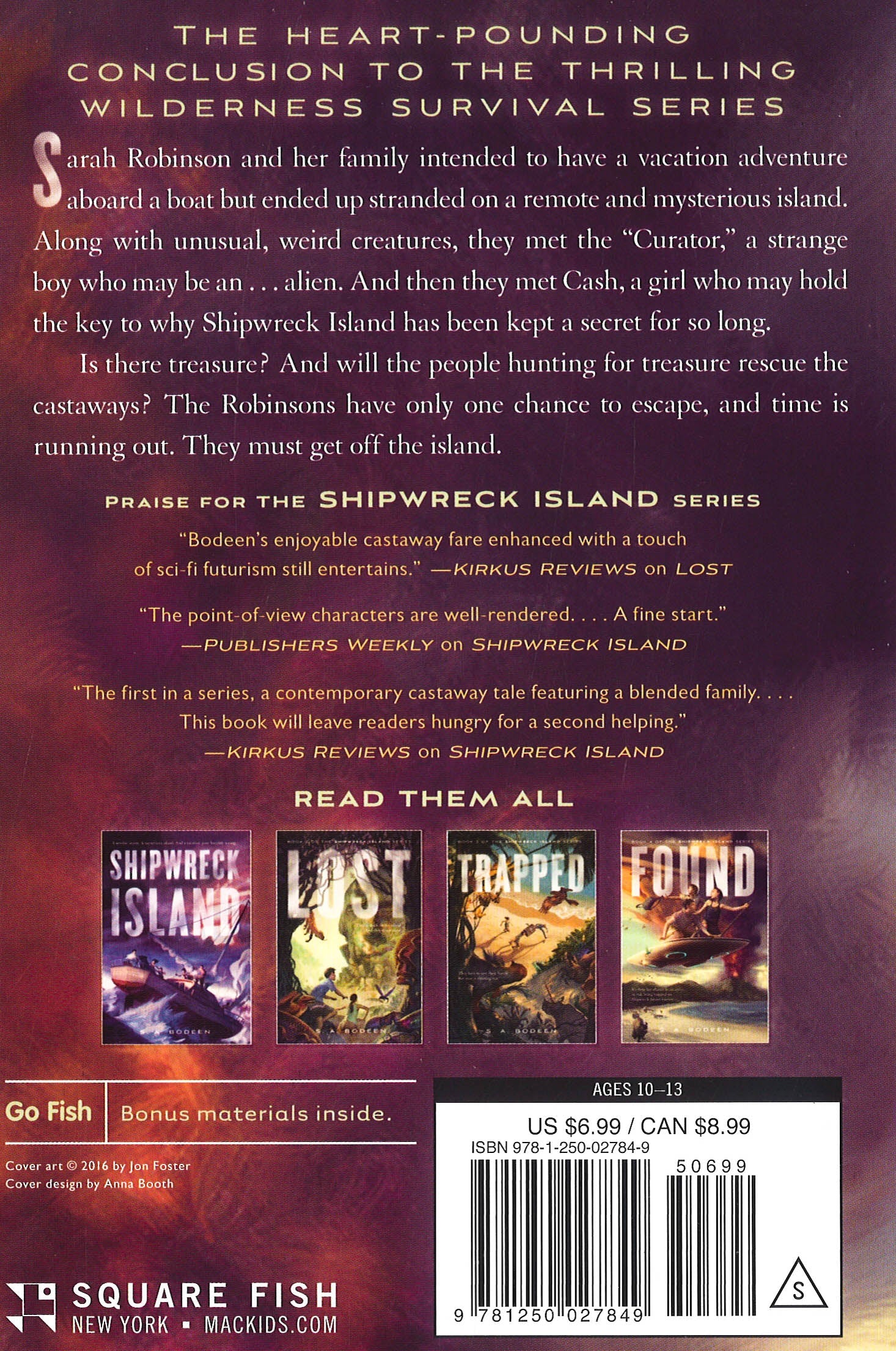 In the thrilling final book of S.A. Bodeen's middle-grade Shipwreck Island series, it's up to a young girl to save her shipwrecked family from a time-traveling curator of souls and a treasure-hunting criminal--and get them off the island! Sarah Robinson and her family are shipwrecked on a remote and mysterious island. Their food is scarce and there's no sign of rescue. They have seen strange creatures, rescued a mysterious girl, and found the Curator, who has captured Sarah's father and stepbrother to use in a bizarre time travel experiment. And then the only man who knows about their island comes back--he's looking for buried treasure, and won't leave without it, even if it means leaving the Robinsons stranded. Time is running out. They must get off the island. Praise for the Shipwreck Island series: "Exciting series debut . . . Intensely readable and will be excellent for reluctant readers." --School Library Journal on Shipwreck Island "Will leave readers hungry for a second helping." --Kirkus Reviews on Shipwreck Island Read them all!Shipwreck IslandLostTrappedFound