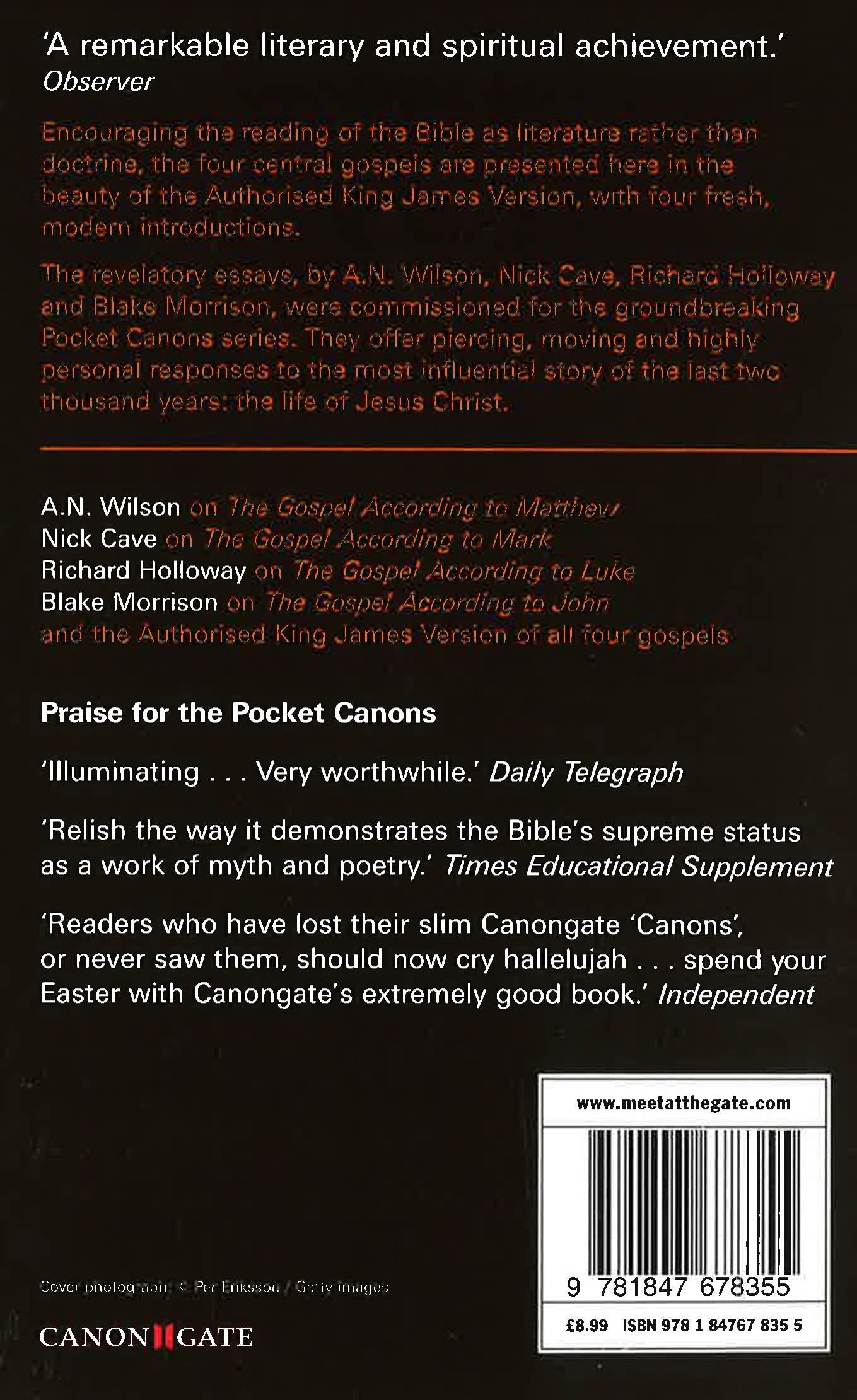 Encouraging the reading of the Bible as literature rather than doctrine, the four central gospels are presented here in the beauty of the Authorised King James Version, with four fresh, modern introductions. The revelatory essays, by A.N. Wilson, Nick Cave, Richard Holloway and Blake Morrison, were commissioned for the groundbreaking Pocket Canons series. They offer piercing, moving and highly personal responses to the most influential story of the last two thousand years: the life of Jesus Christ. Including: A.N. Wilson on The Gospel According to Matthew Nick Cave on The Gospel According to Mark Richard Holloway on The Gospel According to Luke Blake Morrison on The Gospel According to John and the Authorised King James Version of all four Gospels