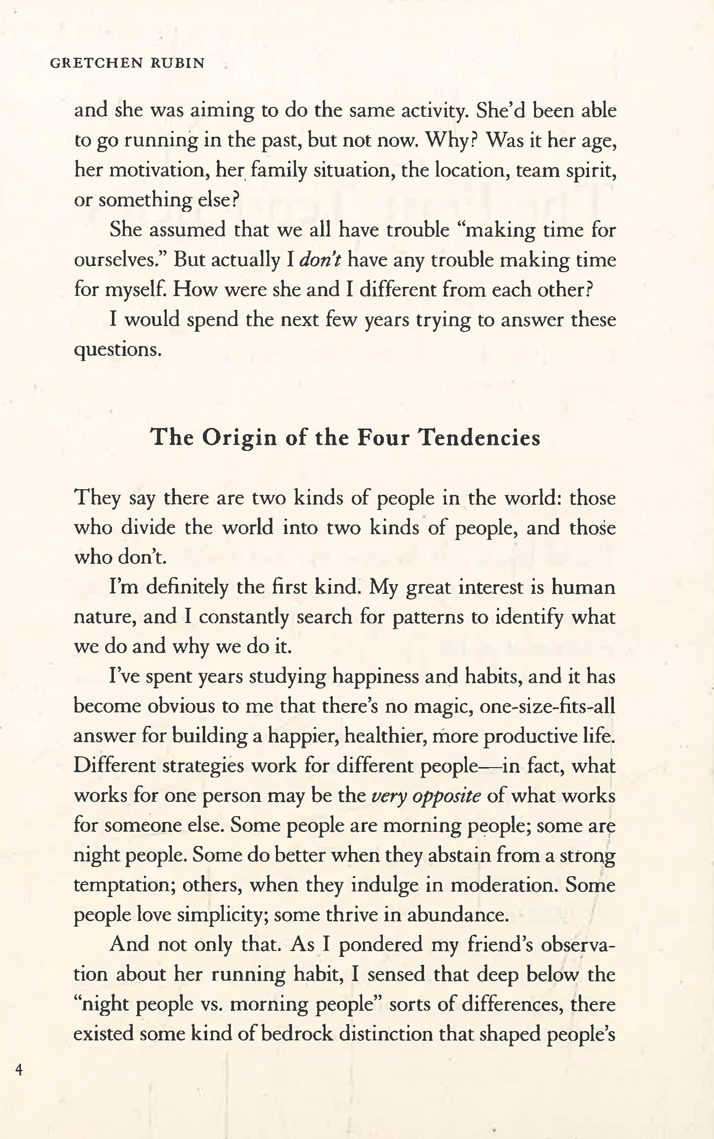 Everyone falls into 1 of 4 personality types and knowing yours could make you happier and more successful. During her investigation to understand human nature, explored most recently in her bestselling Better Than Before, Gretchen Rubin realised that by asking the seemingly dry question 'How do I respond to expectations?' we gain life changing self-knowledge.