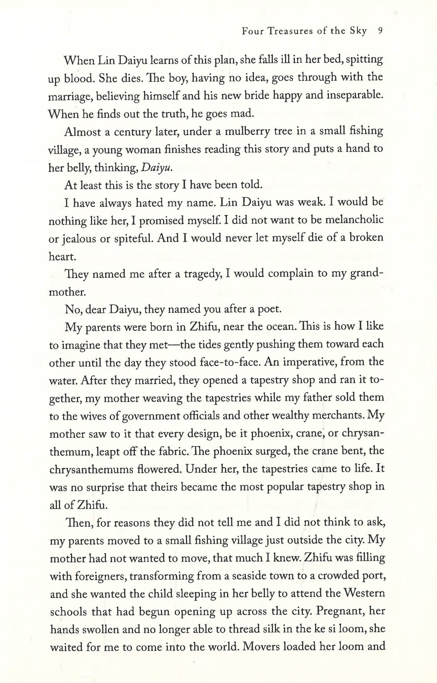 At once a literary tour de force and a groundbreaking work of historical fiction, Four Treasures of the Sky announces Jenny Tinghui Zhang as an indelible new voice. Steeped in untold history and Chinese folklore, this novel is a spellbinding feat.
