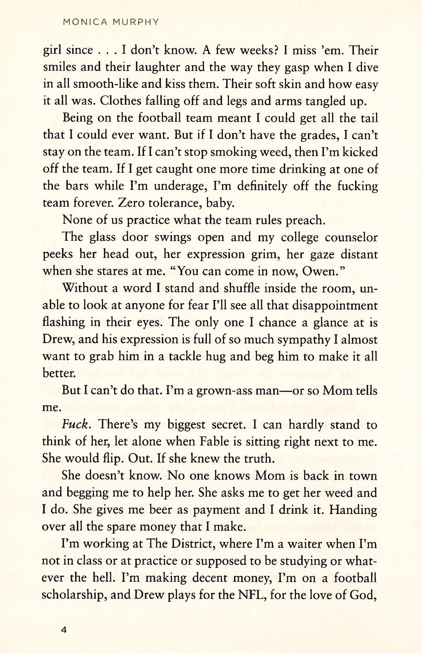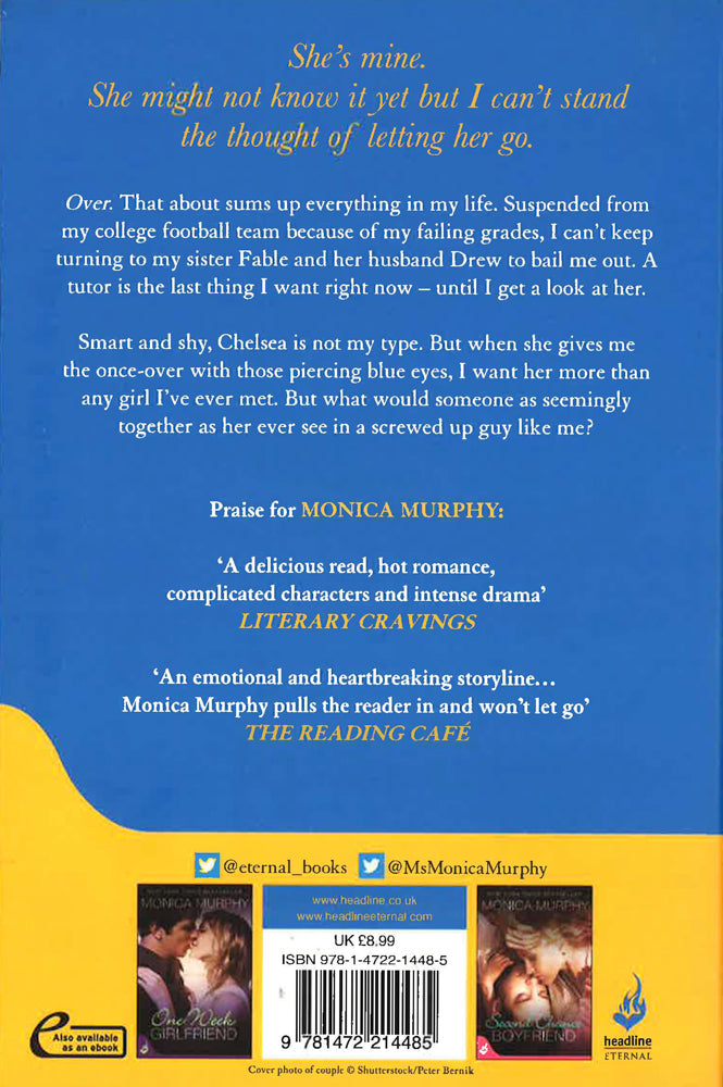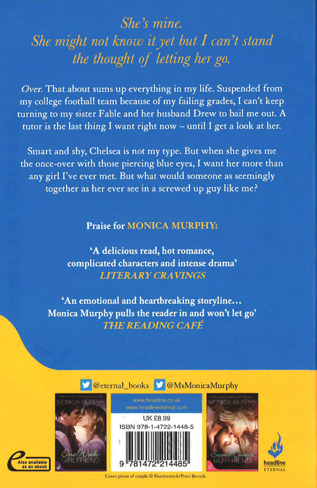 For fans of Jamie McGuire's Beautiful Disaster, Abbi Glines and Jessica Sorenson, New York Times bestselling author Monica Murphy returns with the fourth book in her emotional, addictive and passionate One Week Girlfriend series.Over. That about sums up everything in my life. Suspended from my college football team and forced to cut back my hours at The District bar because of my crappy grades, I can't keep turning to my sister, Fable, and her pro-football playing husband, Drew, to bail me out. I just can't seem to find my own way. Weed and sex are irresistible temptations - and it's messed up that I secretly hand over money to our junkie mom. A tutor is the last thing I want right now - until I get a look at her.Chelsea is not my type at all. She's smart and totally shy. I'm pretty sure she's even a virgin. But when she gives me the once over with those piercing blue eyes, I'm really over. But in a different way. I won't deny her ass is killer, but it's her brain and the way she seems to crave love - like no one's ever given her any - that make me want her more than any girl I've ever met. But what would someone as seemingly together as her ever see in a screwed up guy like me?Don't miss the rest of the intensely passionate One Week Girlfriend series: One Week Girlfriend, Second Chance Boyfriend, Three Broken Promises, Drew + Fable Forever and Four Years Later, as well as Monica's sexy Fowler Sisters trilogy and her breathtaking Reverie Series.