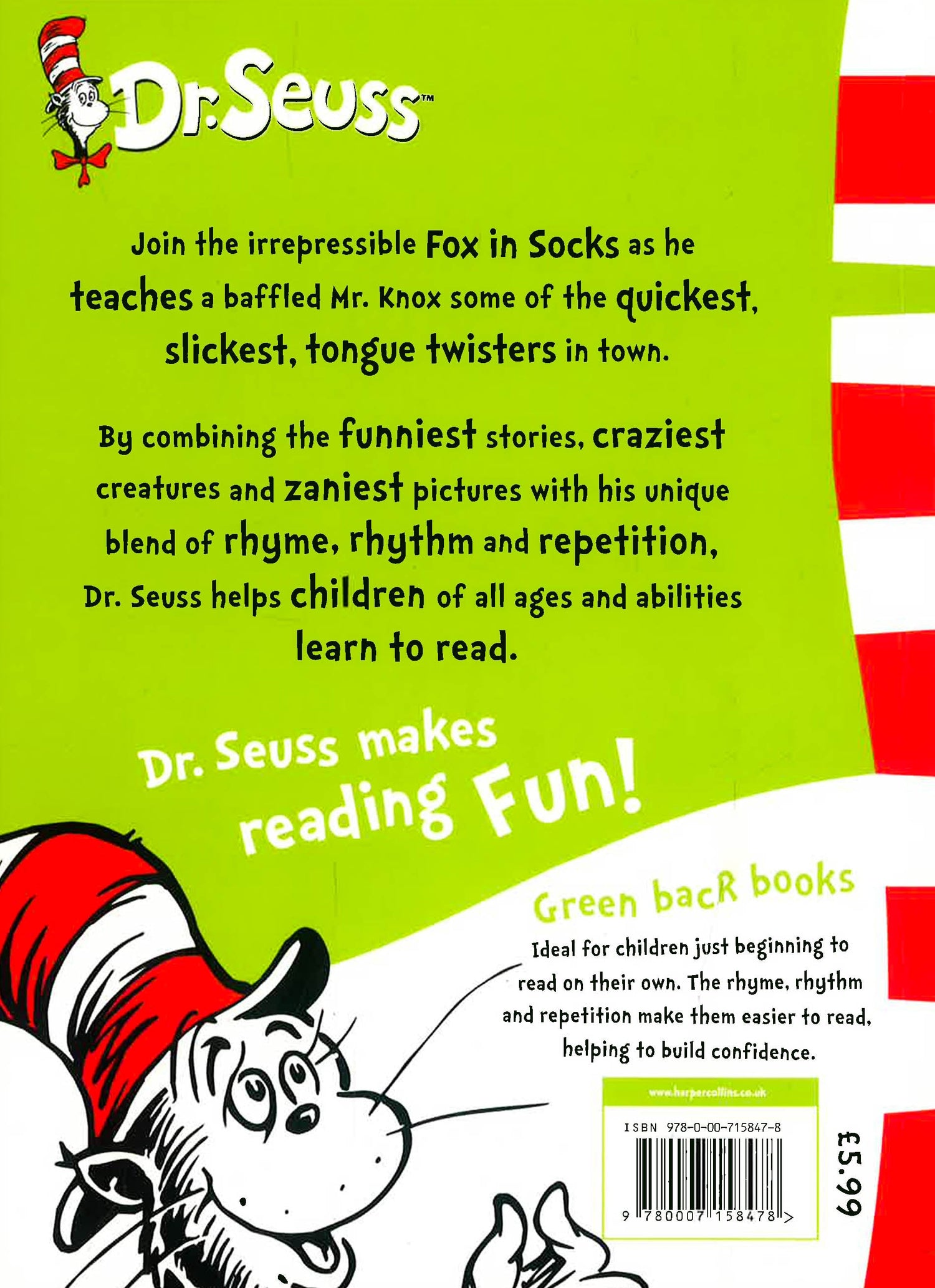 As the first step in a major rebrand programme, HarperCollins is relaunching 17 of Dr. Seuss's best-selling books, including such perennial favourites as 'The Cat in the Hat', 'Green Eggs and Ham' and 'Fox in Socks'. In response to consumer demand, the bright new cover designs incorporate much-needed guidance on reading levels, with the standard paperbacks divided into three reading strands - Blue Back Books for parents to share with young children, Green Back Books for budding readers to tackle on their own, and Yellow Back Books for older, more fluent readers to enjoy. 'Fox in Socks' belongs to the Green Back Book range.