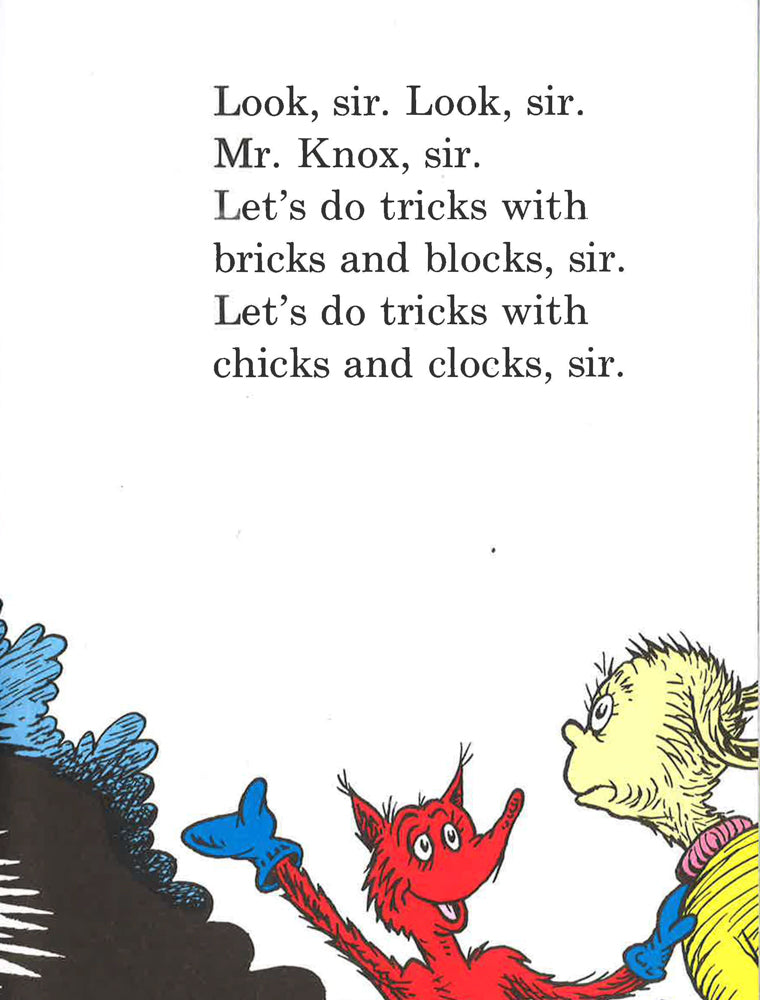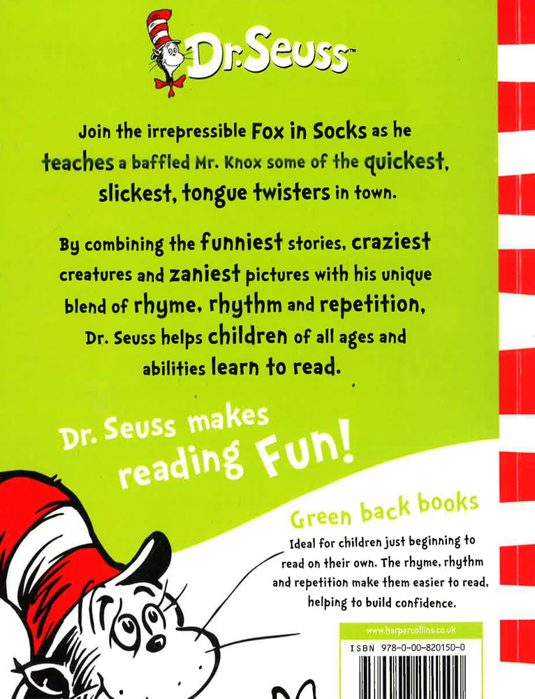 In this hilarious book, the irrepressible Fox in Socks teaches a baffled Mr. Knox some of the slickest, quickest tongue-twisters in town.In this hilarious book, the irrepressible Fox in Socks teaches a baffled Mr. Knox some of the slickest, quickest tongue-twisters in town. Fox in Socks teaches a baffled Mr. Knox some of the slickest, quickest tongue-twisters in town, and you can read along too - if your tongue can manage it! With his unique combination of hilarious stories, zany pictures and riotous rhymes, Dr. Seuss has been delighting young children and helping them learn to read for over fifty years. Creator of the wonderfully anarchic Cat in the Hat, and ranked among the UK's top ten favourite children's authors, Seuss is firmly established as a global best-seller, with nearly half a billion books sold worldwide. As part of a major rebrand programme, HarperCollins is relaunching 17 of Dr. Seuss's best-selling books, including such perennial favourites as The Cat in the Hat, Green Eggs and Ham and Fox in Socks. In response to consumer demand, the bright new cover designs incorporate much needed guidance on reading levels, with the standard paperbacks divided into three reading strands - Blue Back Books for parents to share with young children, Green Back Books for budding readers to tackle on their own, and Yellow Back Books for older, more fluent readers to enjoy. Fox in Socks belongs to the Green Back Book range.