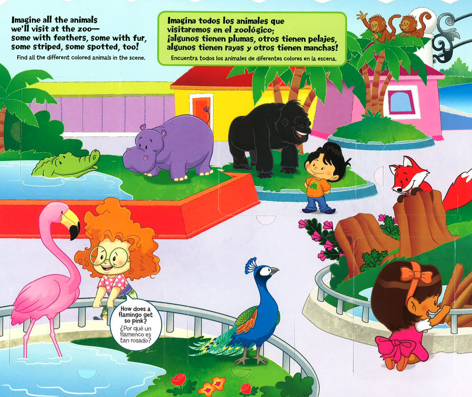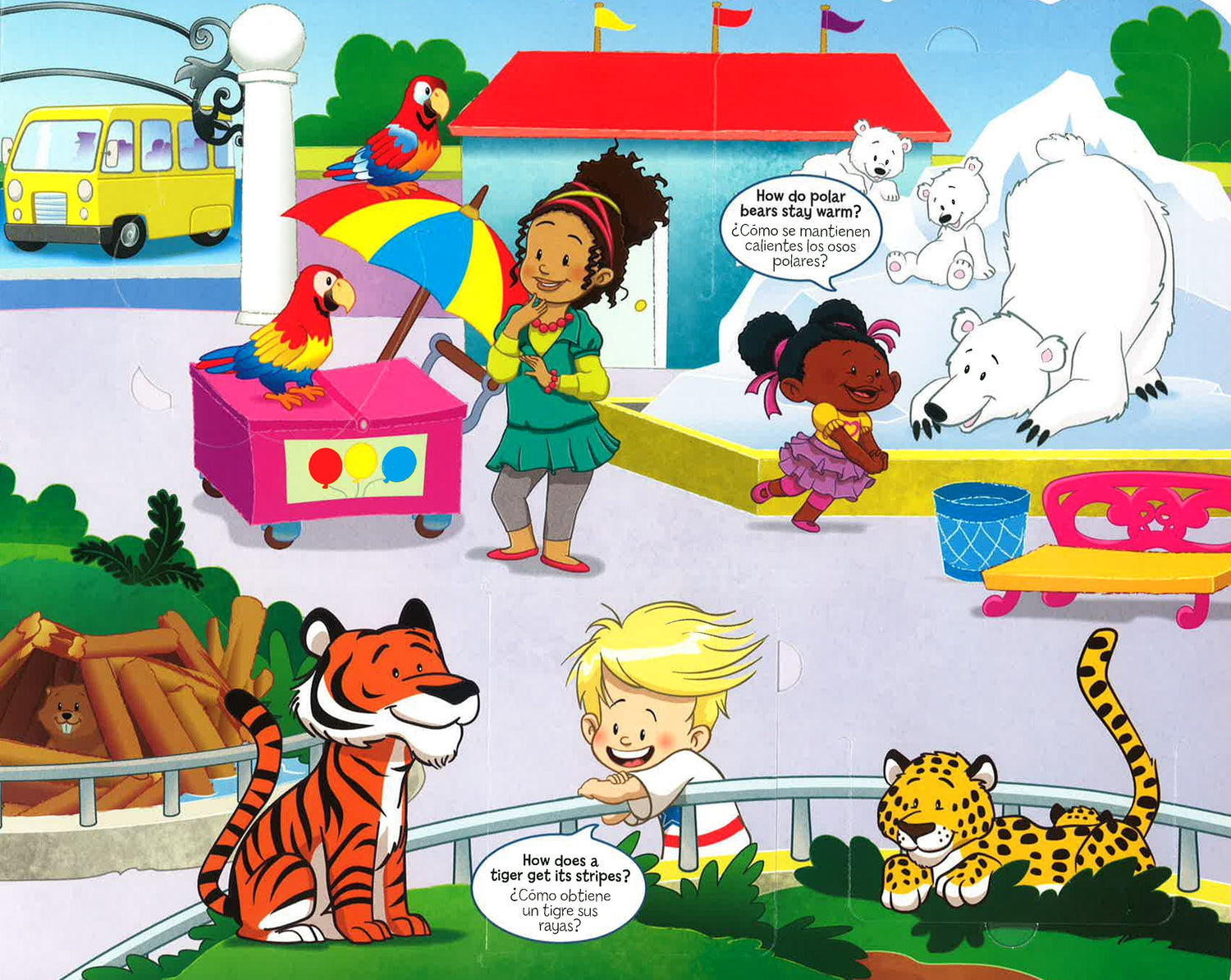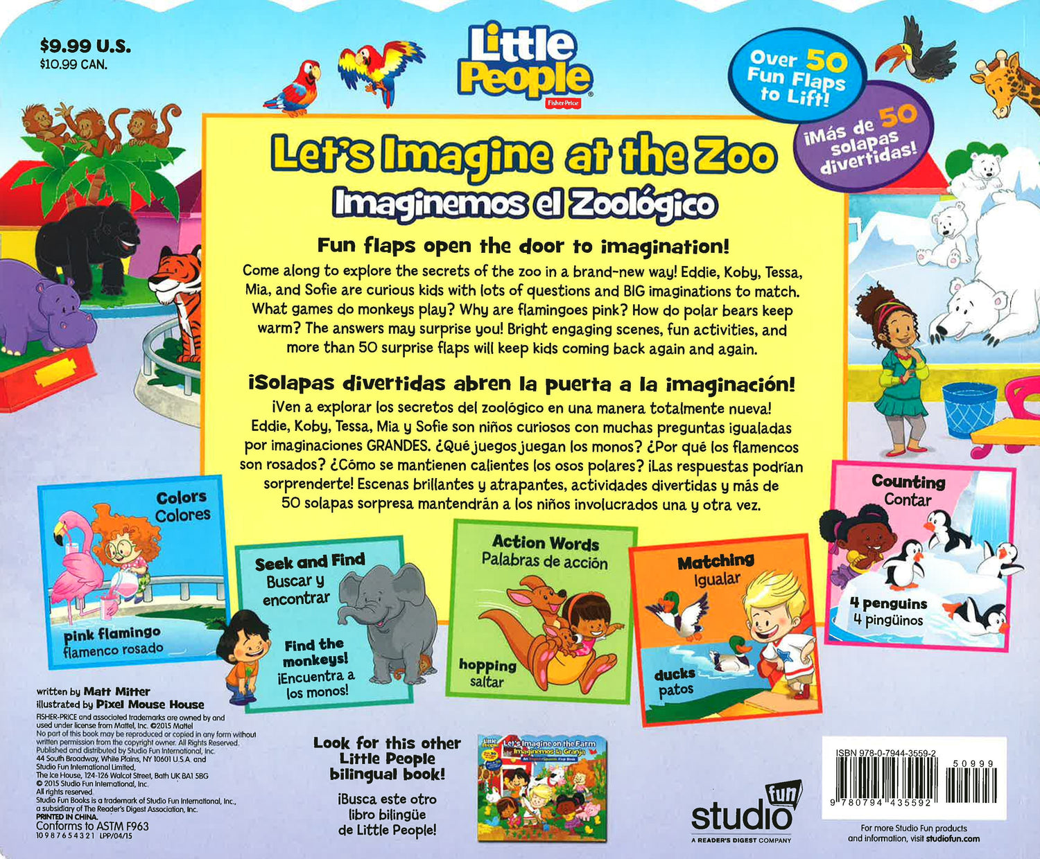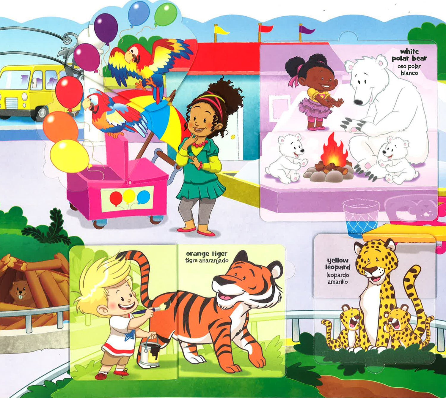 Meet the brand-new Little People characters in this whimsical bilingual flap book about the zoo! Activities on every spread enforce early learning concepts in English and Spanish! Eddie, Koby, Tessa, Mia, and Sofie are curious kids with BIG imaginations and lots of questions. Where does a tiger get his stripes? Why are flamingos pink? Why do hyenas laugh so much? The answers may surprise you! English/Spanish labels, busy scenes, learning activities, and more than 50 surprise flaps will keep kids coming back again and again.