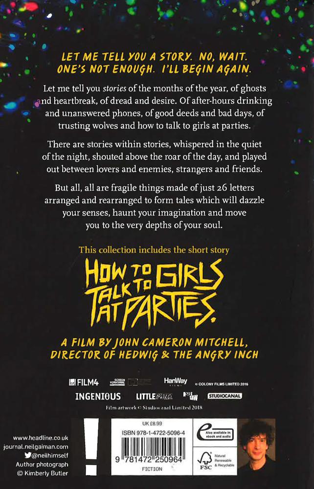 A extraordinary collection of short stories, including How to Talk to Girls at Parties, now a major film starring Nicole Kidman, Elle Fanning and Alex Sharp. Sunday Times No. 1 bestselling author Neil Gaiman's collection of extraordinary short stories featuring How to Talk to Girls at Parties, now a major film starring Nicole Kidman, Elle Fanning and Alex Sharp. From the author American Gods, now a major TV series for Amazon Prime Video, Fragile Things shows one of the world's most gifted storytellers at the height of his powers.Let me tell you stories of the months of the year, of ghosts and heartbreak, of dread and desire. Or after-hours drinking and unanswered phones, of good deeds and bad days, of trusting wolves and how to talk to girls at parties.There are stories within stories, whispered in the quiet of the night, shouted above the roar of the day, and played out between lovers and enemies, strangers and friends. But all, all are fragile things made of just 26 letters arranged and rearranged to form tales and imaginings which will dazzle your senses, haunt your imagination and move you to the very depths of your soul.