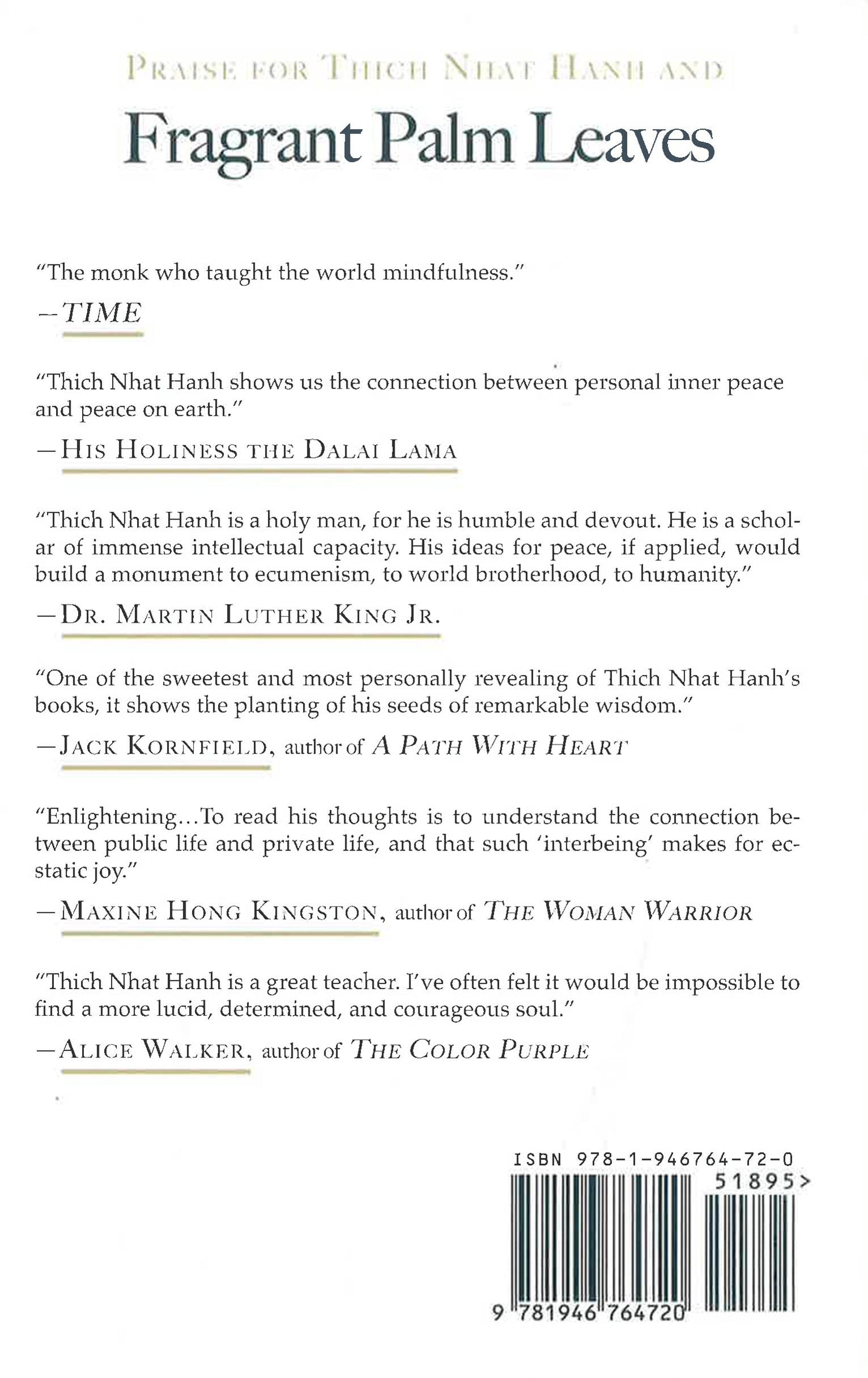 "It isn't likely that this collection of journal entries, which I'm calling Fragrant Palm Leaves, will pass the censors... I'll leave Vietnam tomorrow." Thus Thich Nhat Hanh begins his May 11, 1966 journal entry. After leaving Vietnam, he was exiled for calling for peace, and was unable to visit his homeland again until 2004. In the interim, Thich Nhat Hanh continued to practice and teach in the United States and Europe, and became one of the world's most respected spiritual leaders.