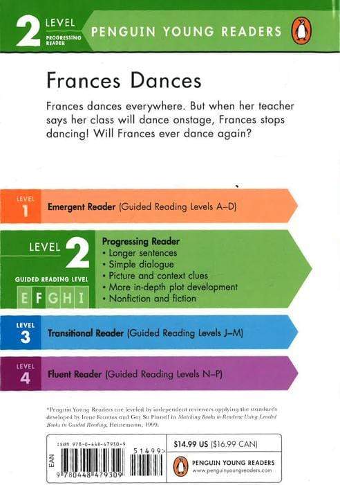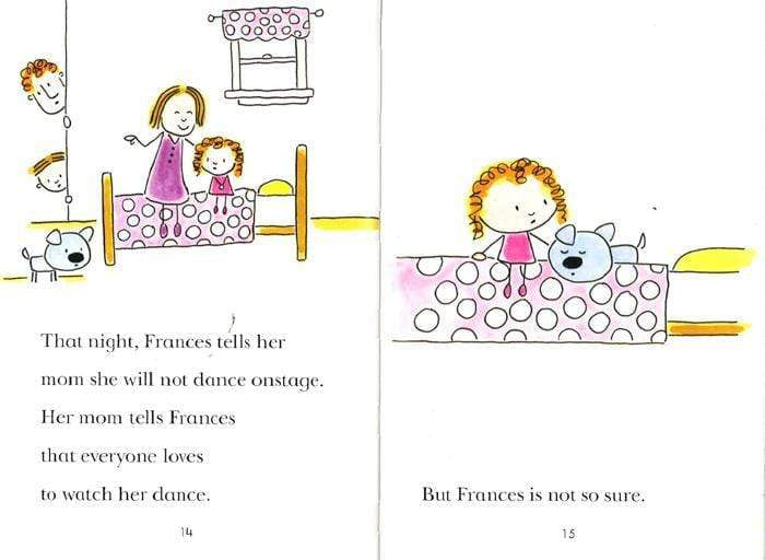 Frances loves to dance. She dances while getting dressed, eating breakfast, and even when brushing her teeth. But she will not dance out the door. When her teacher announces that the class will be dancing on stage in a few days, Frances is terrified. She does not dance in front of people! It's up to her mom, her dad, and her brother to convince Frances that she can dance even on stage.