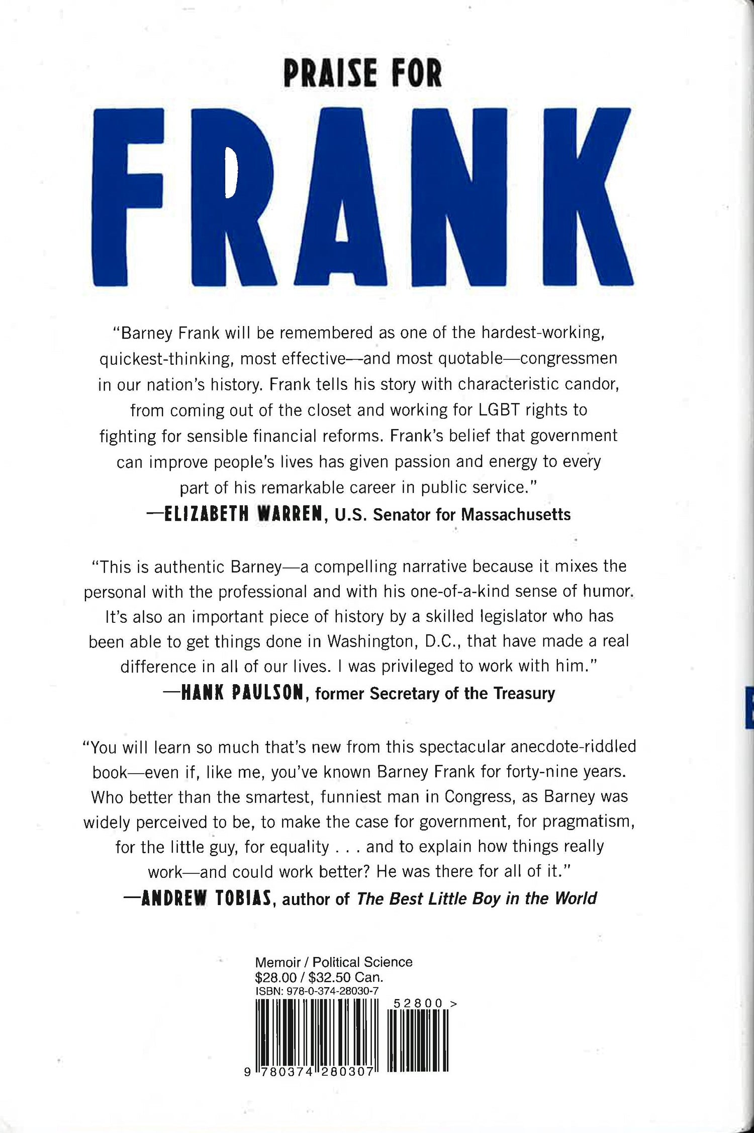How did a disheveled, intellectually combative gay Jew with a thick accent become one of the most effective (and funniest) politicians of our time? Growing up in Bayonne, New Jersey, the fourteen-year-old Barney Frank made two vital discoveries about himself: he was attracted to government, and to men. He resolved to make a career out of the first attraction and to keep the second a secret. Now, sixty years later, his sexual orientation is widely accepted, while his belief in government is embattled. Frank: A Life in Politics from the Great Society to Same-Sex Marriage is one man's account of the country's transformation--and the tale of a truly momentous career. Many Americans recall Frank's lacerating wit, whether it was directed at the Clinton impeachment ("What did the president touch, and when did he touch it?") or the pro-life movement (some people believe "life begins at conception and ends at birth"). But the contours of his private and public lives are less well-known. For more than four decades, he was at the center of the struggle for personal freedom and economic fairness. From the battle over AIDS funding in the 1980s to the debates over "big government" during the Clinton years to the 2008 financial crisis, the congressman from Massachusetts played a key role. In 2010, he coauthored the most far-reaching and controversial Wall Street reform bill since the era of the Great Depression, and helped bring about the repeal of Don't Ask, Don't Tell. In this feisty and often moving memoir, Frank candidly discusses the satisfactions, fears, and grudges that come with elected office. He recalls the emotional toll of living in the closet and how his public crusade against homophobia conflicted with his private accommodation of it. He discusses his painful quarrels with allies; his friendships with public figures, from Tip O'Neill to Sonny Bono; and how he found love with his husband, Jim Ready, becoming the first sitting member of Congress to enter a same-sex marriage. He also demonstrates how he used his rhetorical skills to expose his opponents' hypocrisies and delusions. Through it all, he expertly analyzes the gifts a successful politician must bring to the job, and how even Congress can be made to work. Frank is the story of an extraordinary political life, an original argument for how to rebuild trust in government, and a guide to how political change really happens--composed by a master of the art.