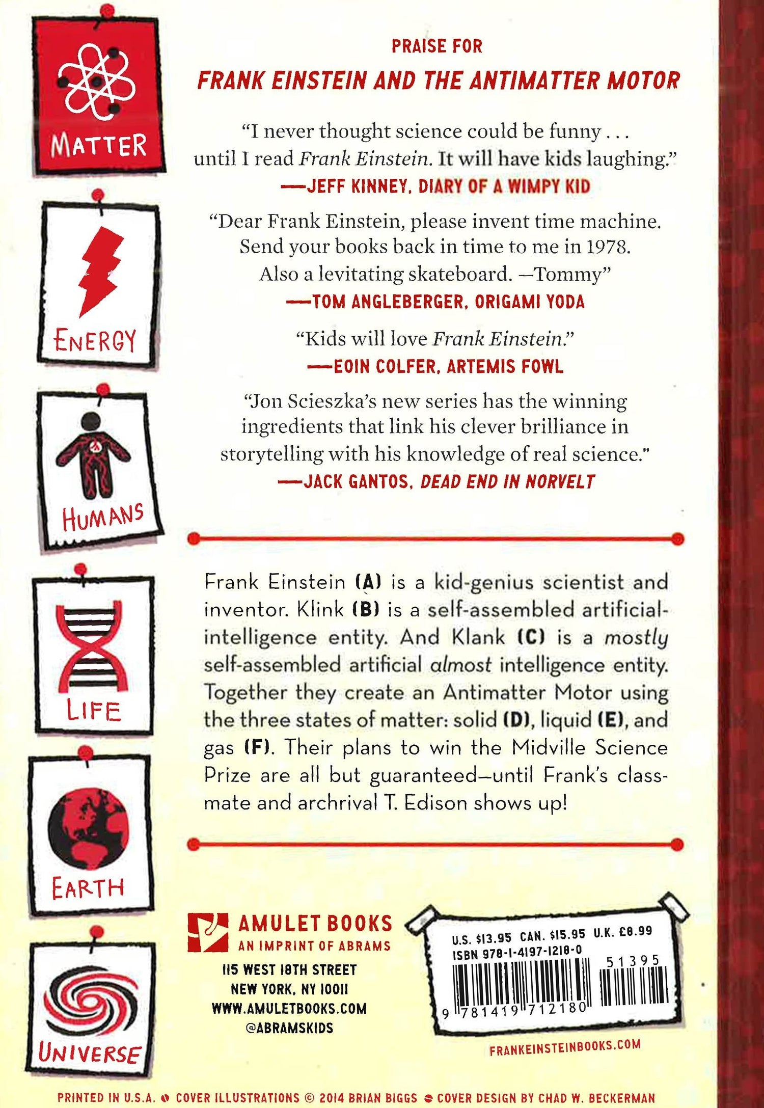 Frank Einstein loves to tinker, build and take things apart. He loves to observe, hypothesise, experiment and invent. Frank Einstein is a kid genius who loves figuring out how the world works by creating household contraptions that are part science, part imagination and definitely unusual. After an uneventful experiment with a garage-lab artificially intelligent RoboBug, a lightning storm and a flash of electricity, Frank's inventions--the robots Klink and Klank--suddenly come to life. Not exactly the ideal lab partners, the wise-cracking Klink and the overly expressive Klank are a help nonetheless as Frank attempts to perfect his Dark Energy Drive ...that is until Frank's arch nemesis, T. Edison, steals Klink and Klank for his evil doomsday plan! With the help of his friends, Frank sets out to rescue the robots and stop T. Edison from carrying out his twisted plans! Using real science and drawing inspiration from the classic pulp stories of Tom Swift, Jon Scieszka has created a unique world of adventure and science fiction.