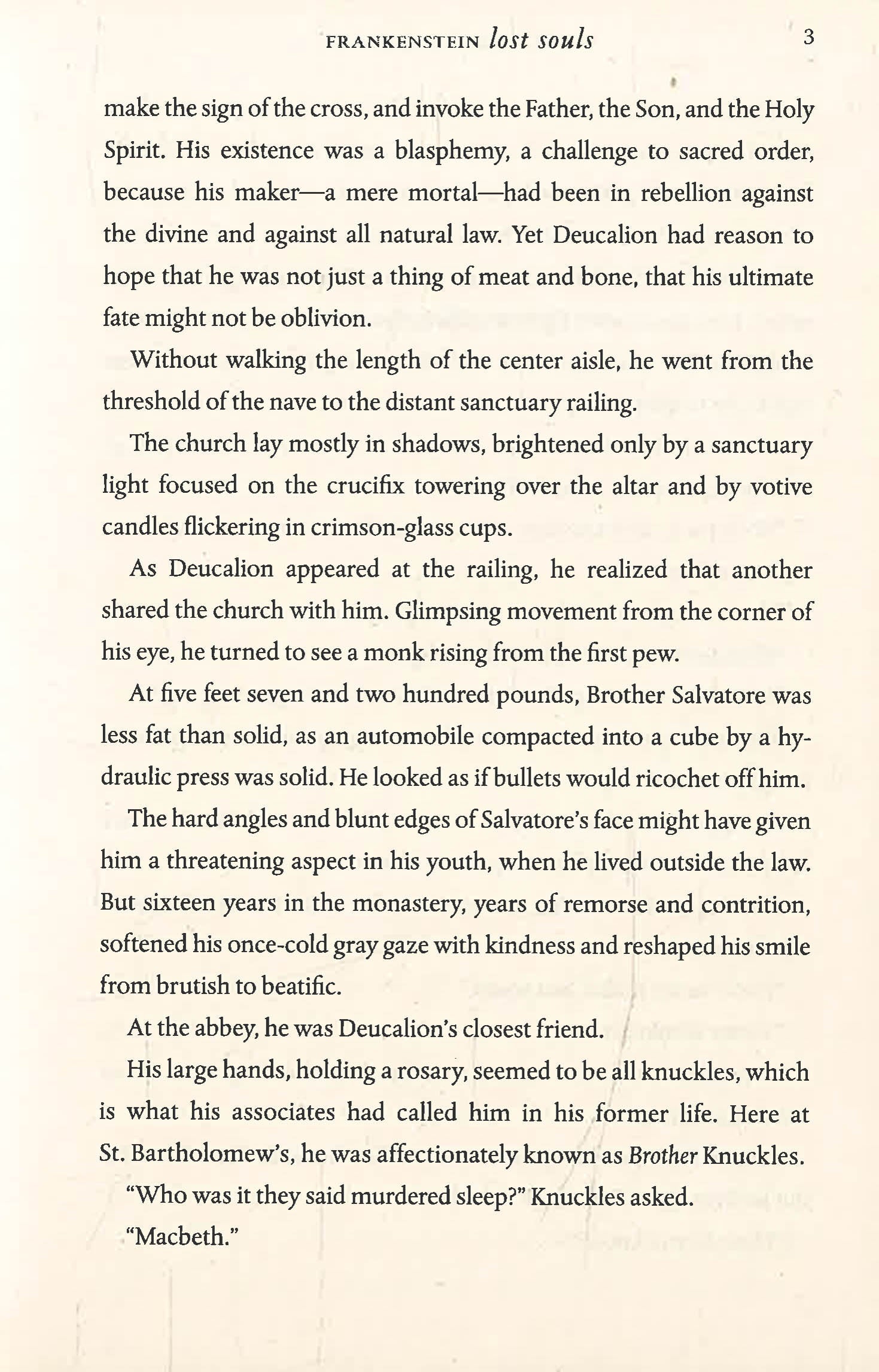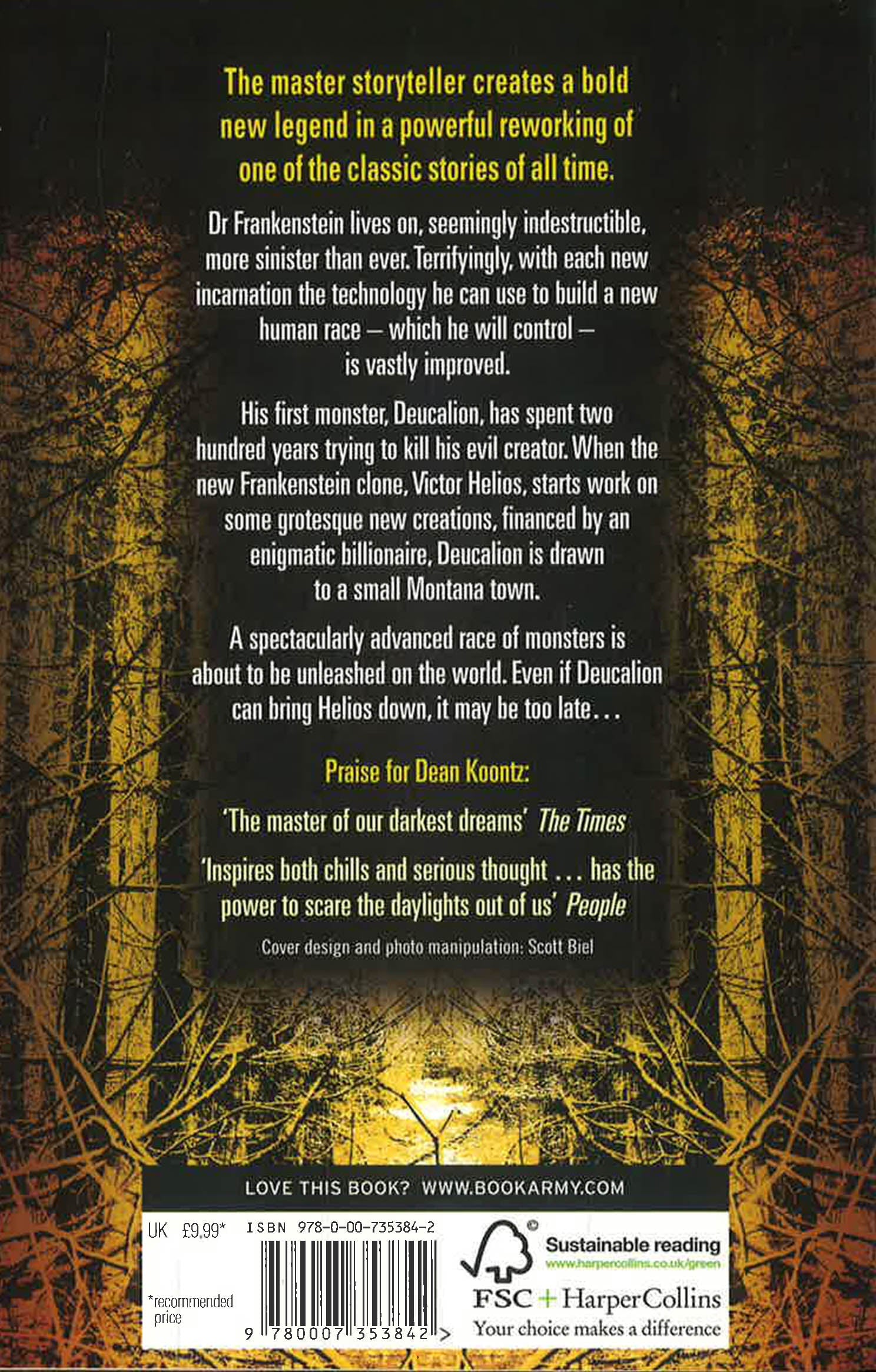SOMEONE NEW IS PLAYING GOD The Frankenstein story updated to the 21st century by the great American storyteller Dean Koontz. In a powerful reworking of one of the classic stories of all time, Dr Frankenstein lives on, seemingly indestructible, more malignant than ever. Frankenstein's first monster, Deucalion, has spent two hundred years trying to put an end to his creator. Now he learns that a new Frankenstein clone, Victor Helios, is out there again, somewhere. Terrifyingly, with each incarnation the sinister doctor draws closer to the possibility of succeeding in his ambition to create a new human race - which he will control. He has found an enigmatic backer and is working in a secret location. Together with the two ex-cops who helped him destroy the previous Victor, Deucalion is drawn to the small Montana town where Victor's grotesque new creations are taking shape. Victor's New Race is spectacularly different, a product of cutting-edge technology and stem-cell circuits, and when things go wrong, they go wrong in very unexpected ways. Frankenstein is unleashing a new menace on the world, whether or not he can control it. It may be too late, even if Deucalion can bring him down.