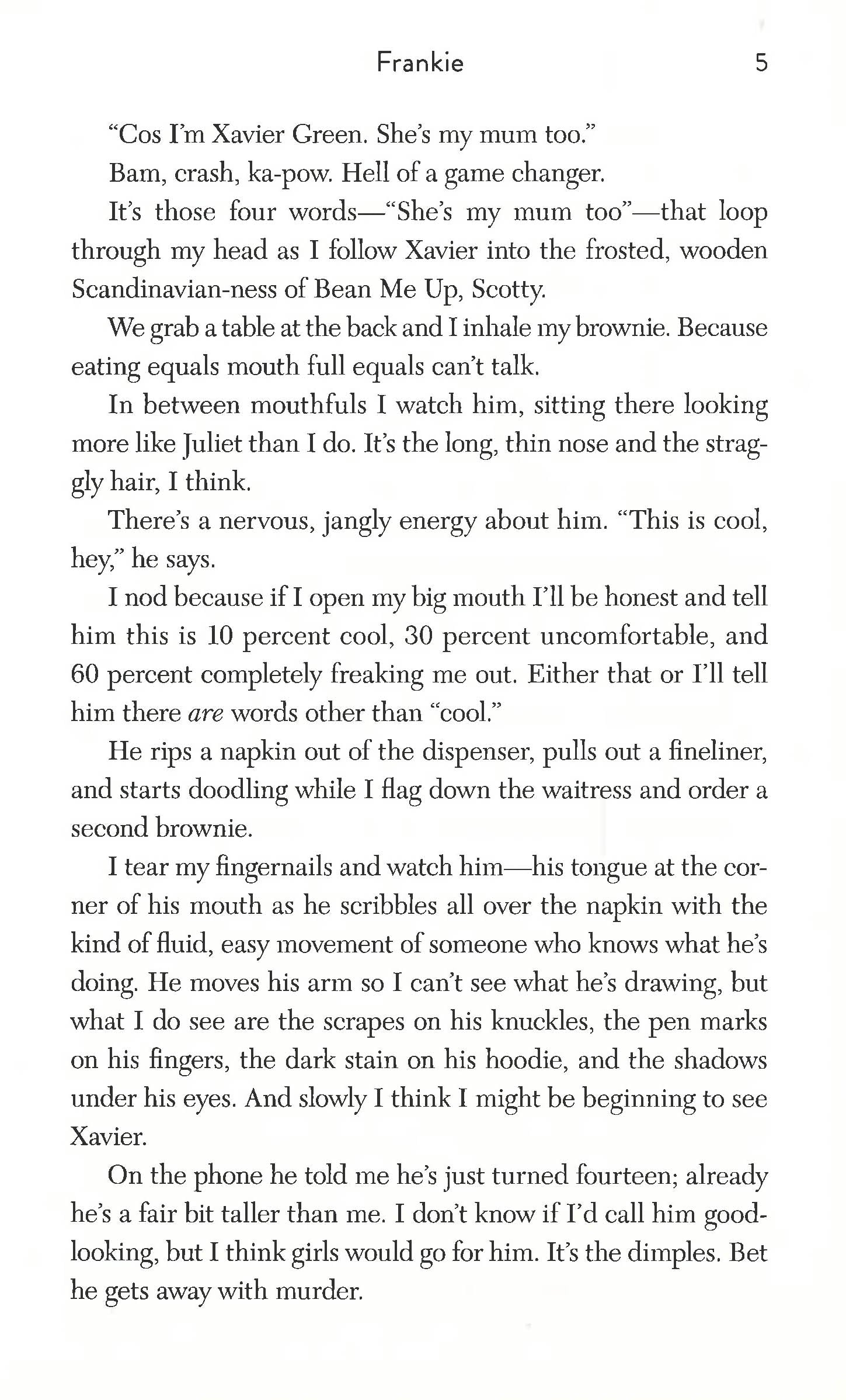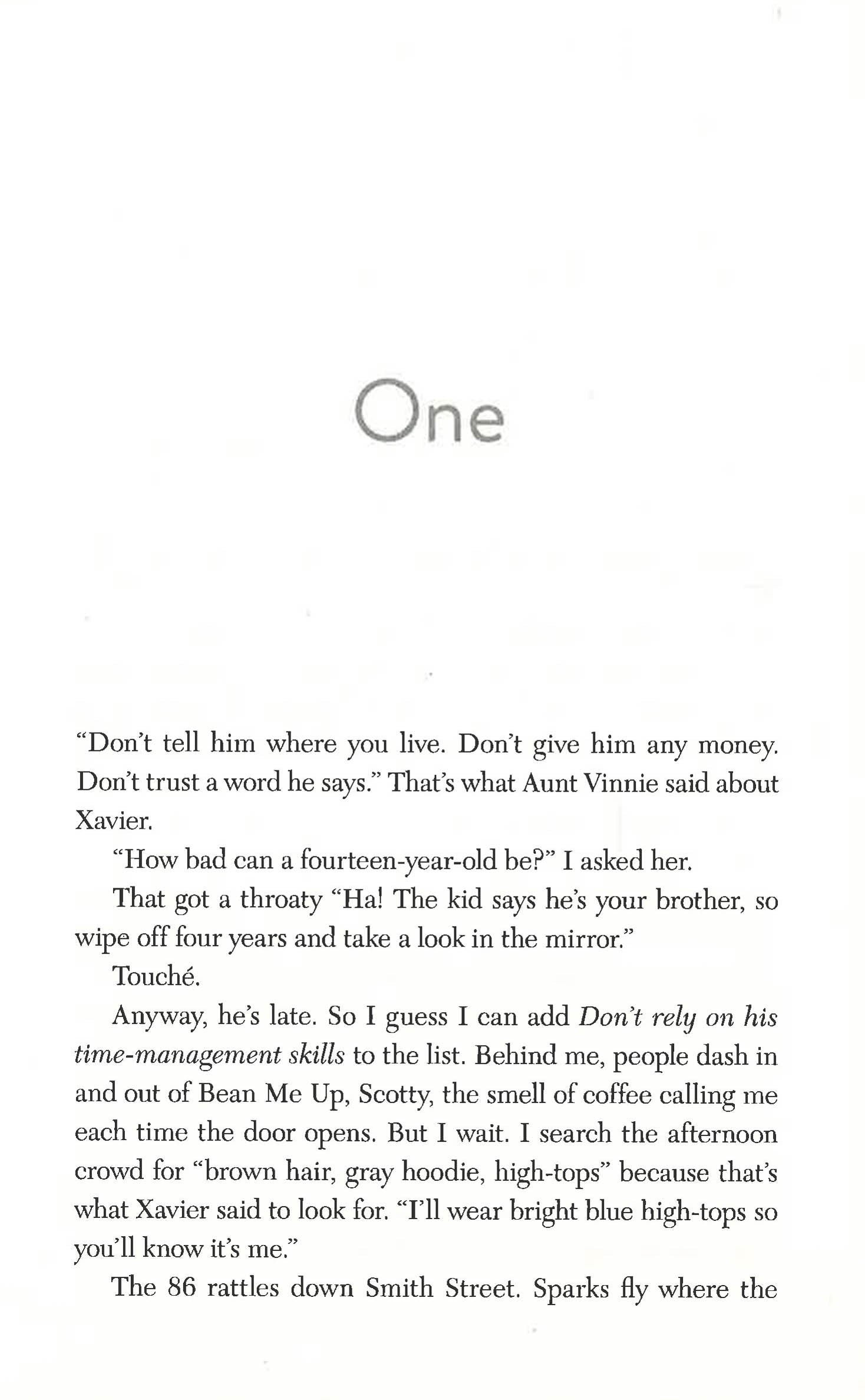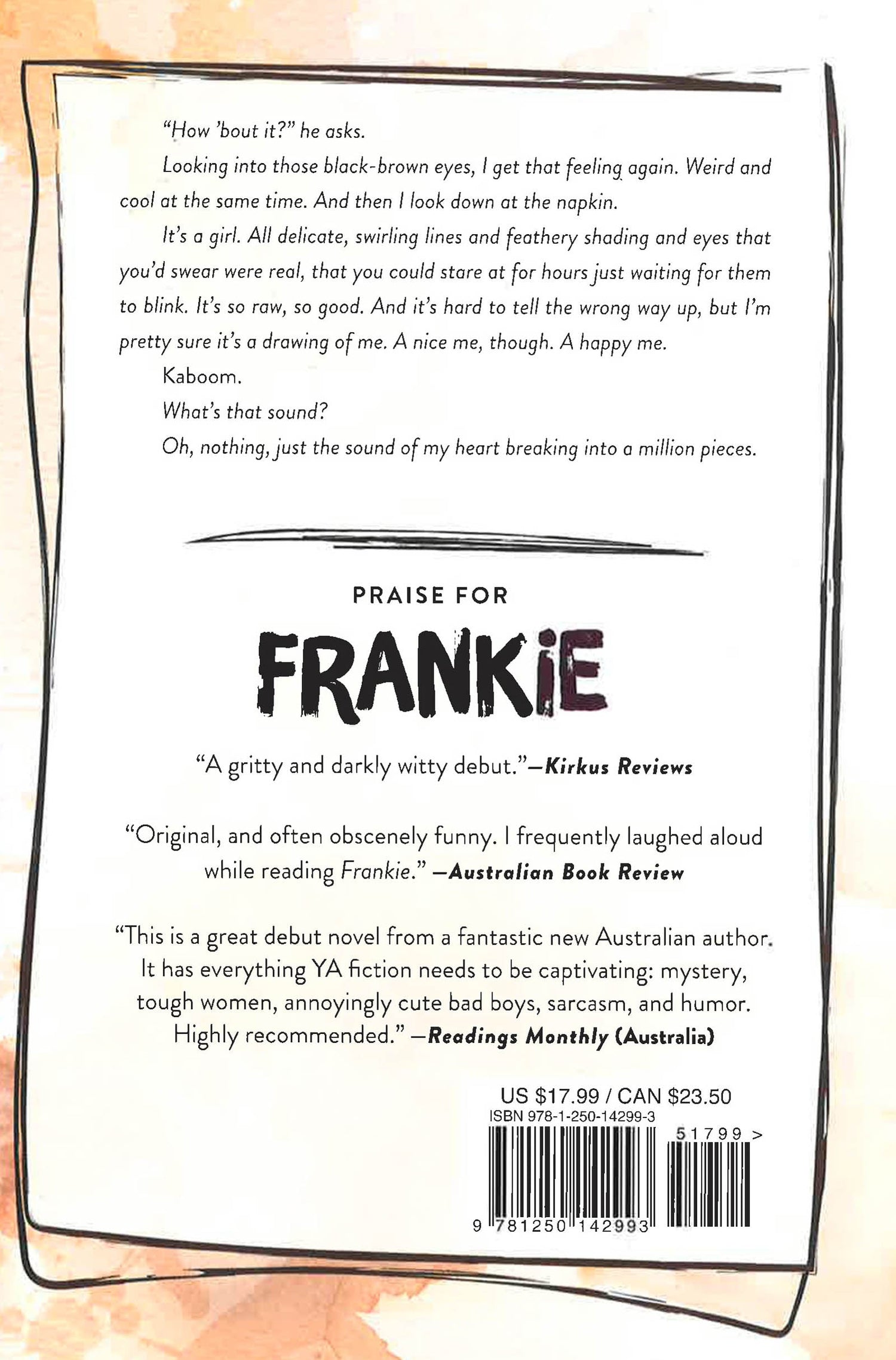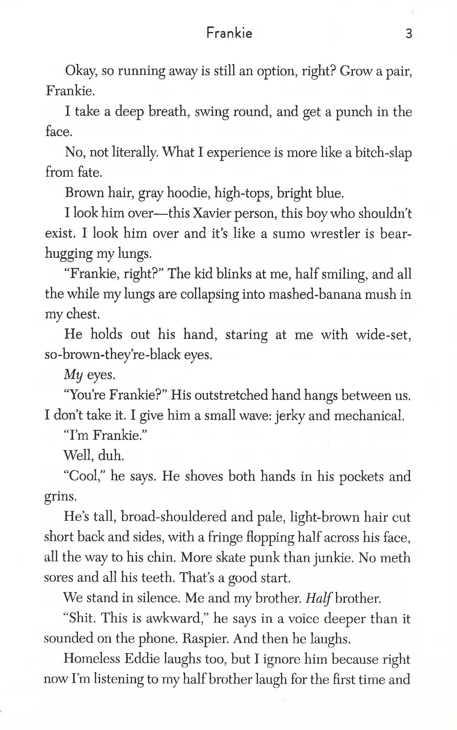 Frankie Vega is angry. Just ask the guy whose nose she broke. Or the cop investigating the burglary she witnessed, or her cheating ex-boyfriend, or her aunt who's tired of giving second chances.When a kid shows up claiming to be Frankie's half brother, it opens the door to a past she doesn't want to remember. And when that kid goes missing, the only person willing to help is a boy with stupidly blue eyes, a criminal record, and secrets of his own.Frankie's search for the truth could change her life, or cost her everything.