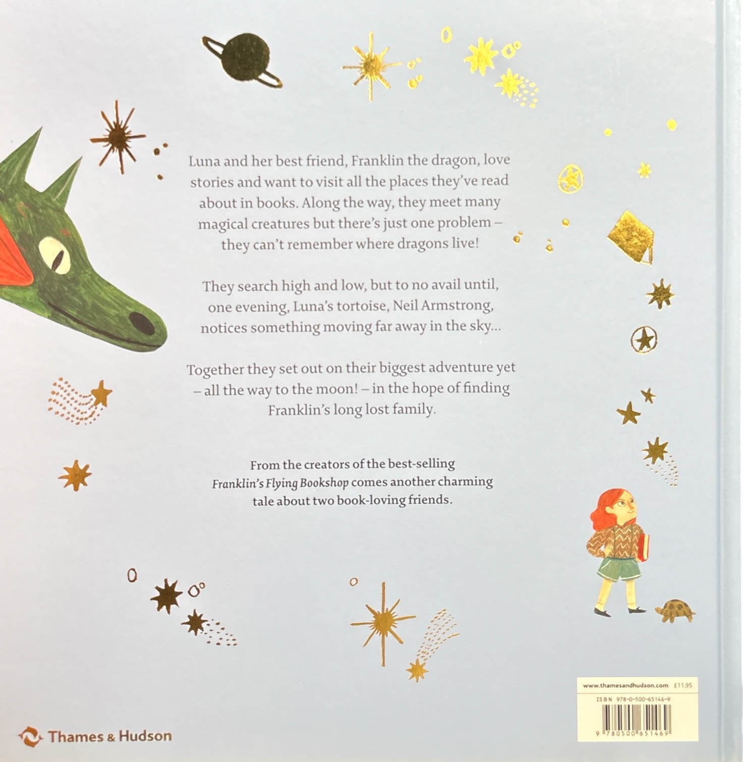 Luna and her best friend, Franklin the dragon, love stories and want to visit all the places they’ve read about in books. But for all their reading they still don’t know where dragons come from. And Franklin is now so old – 605 to be exact – he can’t remember himself! They search high and low, but to no avail. Until one evening, Luna’s tortoise, Neil Armstrong, notices something far away in the sky… The three friends set out on their biggest adventure yet – all the way to the moon – in the hope of reuniting Franklin with his long lost family.