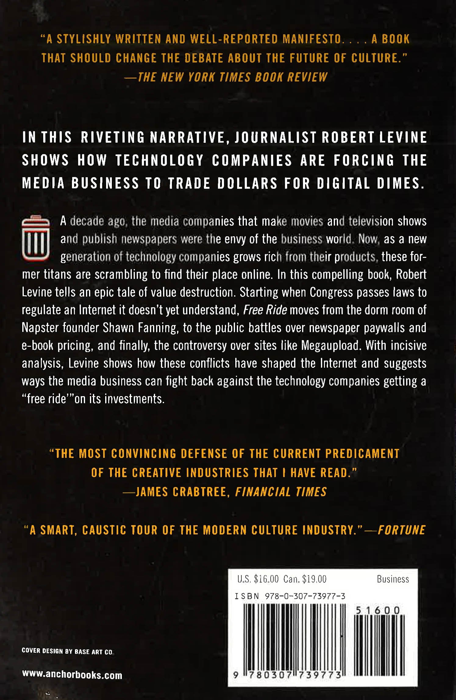 How did the newspaper, music, and film industries go from raking in big bucks to scooping up digital dimes? Their customers were lured away by the free ride of technology. Now, business journalist Robert Levine shows how they can get back on track. On the Internet, "information wants to be free." This memorable phrase shaped the online business model, but it is now driving the media companies on whom the digital industry feeds out of business. Today, newspaper stocks have fallen to all-time lows as papers are pressured to give away content, music sales have fallen by more than half since file sharing became common, TV ratings are plum-meting as viewership migrates online, and publishers face off against Amazon over the price of digital books. In Free Ride, Robert Levine narrates an epic tale of value destruction that moves from the corridors of Congress, where the law was passed that legalized YouTube, to the dorm room of Shawn Fanning, the founder of Napster; from the bargain-pricing dramas involving iTunes and Kindle to Google's fateful decision to digitize first and ask questions later. Levine charts how the media industry lost control of its destiny and suggests innovative ways it can resist the pull of zero. Fearless in its reporting and analysis, Free Ride is the busi-ness history of the decade and a much-needed call to action.