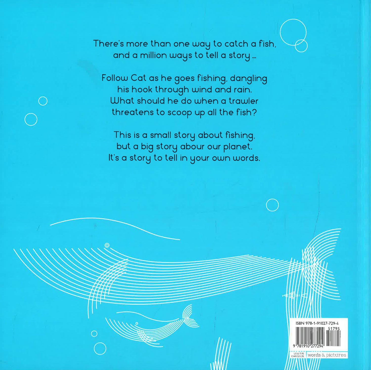 A little sailing boat casts out his line to catch a fish in a busy, healthy ocean. But when a big, smoking trawler casts its mighty net, will any of the fish escape? Does the little sailing boat make the right choice? What do you think? This striking and artistic wordless picture book explores an environmental theme through simple linework, patterns and strong contrasts. A great way to spark conversations between parents and children about conservation and environmental issues.