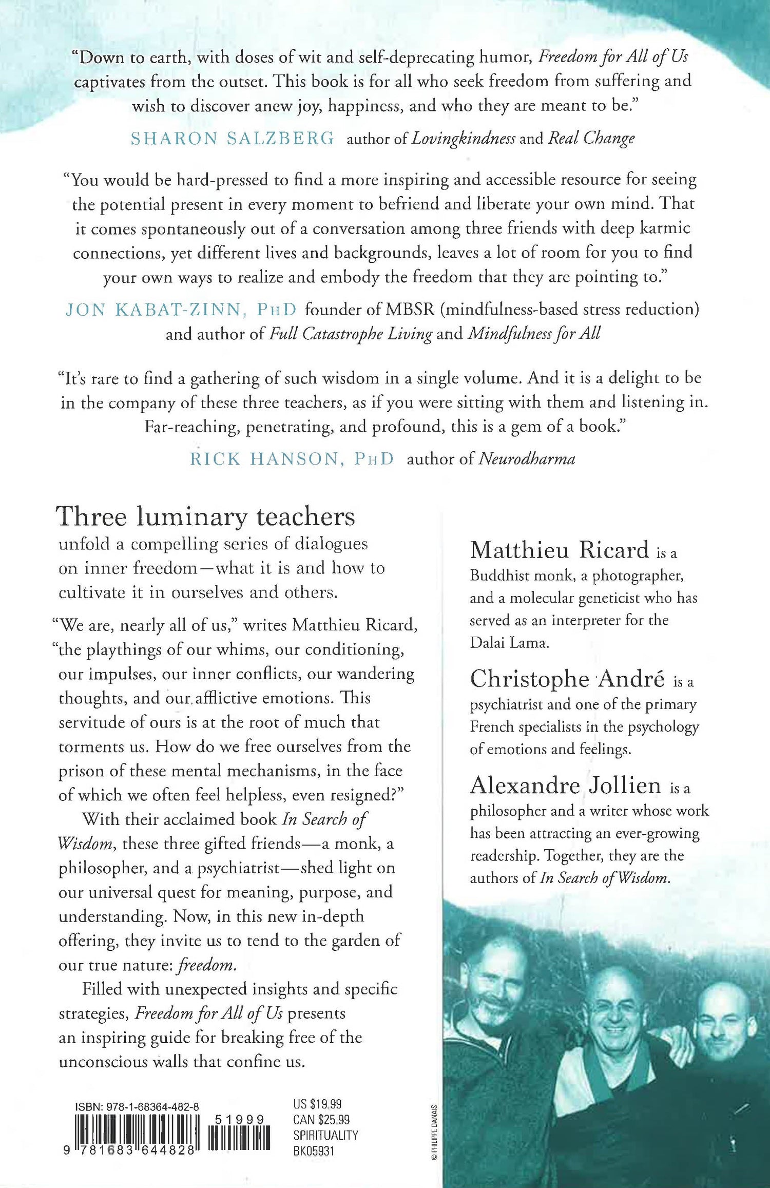 "We are, nearly all of us," writes Matthieu Ricard, "the playthings of our whims, conditioning, impulses, inner conflicts, wandering thoughts, and afflictive emotions. This servitude is at the root of much that torments us. How do we free ourselves from the prison of these mental mechanisms, in the face of which we often feel helpless, even resigned?" With their acclaimed book In Search of Wisdom, these three gifted friends-a monk, a philosopher, and a psychiatrist-shed light on our universal quest for meaning, purpose, and understanding. Now, in this new in-depth offering, they invite us to tend to the garden of our true nature, freedom. Turn by turn, each shares his own unique perspective on the various obstacles to inner freedom, the "ecology" of freedom, the ways to cultivate it, and the harvest that comes out of it. What emerges is a panoramic vision and roadmap for us to overcome the barriers that hinder our liberation. "It is our hope," they write, "that this book will provide clarification of the means for freeing ourselves from the causes of suffering." Filled with unexpected insights and specific strategies, Freedom for All of Us presents an inspiring guide for breaking free of the unconscious walls that confine us.
