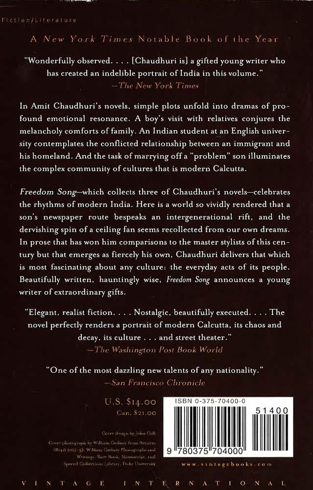"An immensely gifted writer....Crammed with breathtaking sentences, sharp characterizations, comic set pieces, and melancholy grace notes." --The New York Times Book Review Freedom Song--which collects three of Chaudhuri's novels--celebrates the rhythms of modern India. A boy's visit with relatives conjures the melancholy comforts of family. An Indian student at an English university contemplates the conflicted relationship between an immigrant and his homeland. And the task of marrying off a "problem" son illuminates the complex community of cultures that is modern Calcutta. Chaudhuri's novels offer simple plots that unfold into dramas of profound emotional resonance. And in prose that has won Chaudhuri comparisons to the master stylists of this century but that emerges as fiercely his own, Freedom Song announces a young writer of extraordinary gifts.