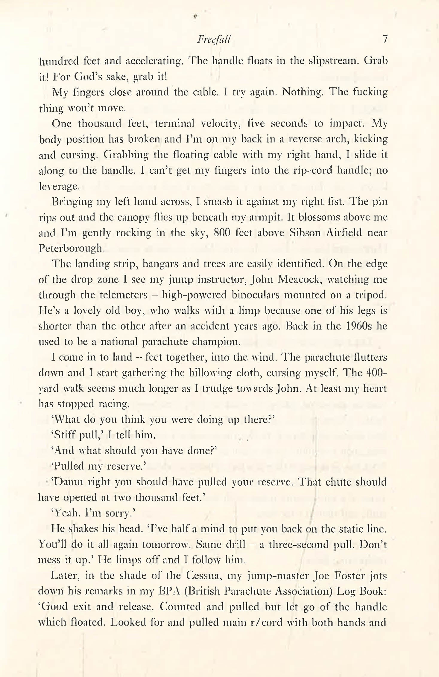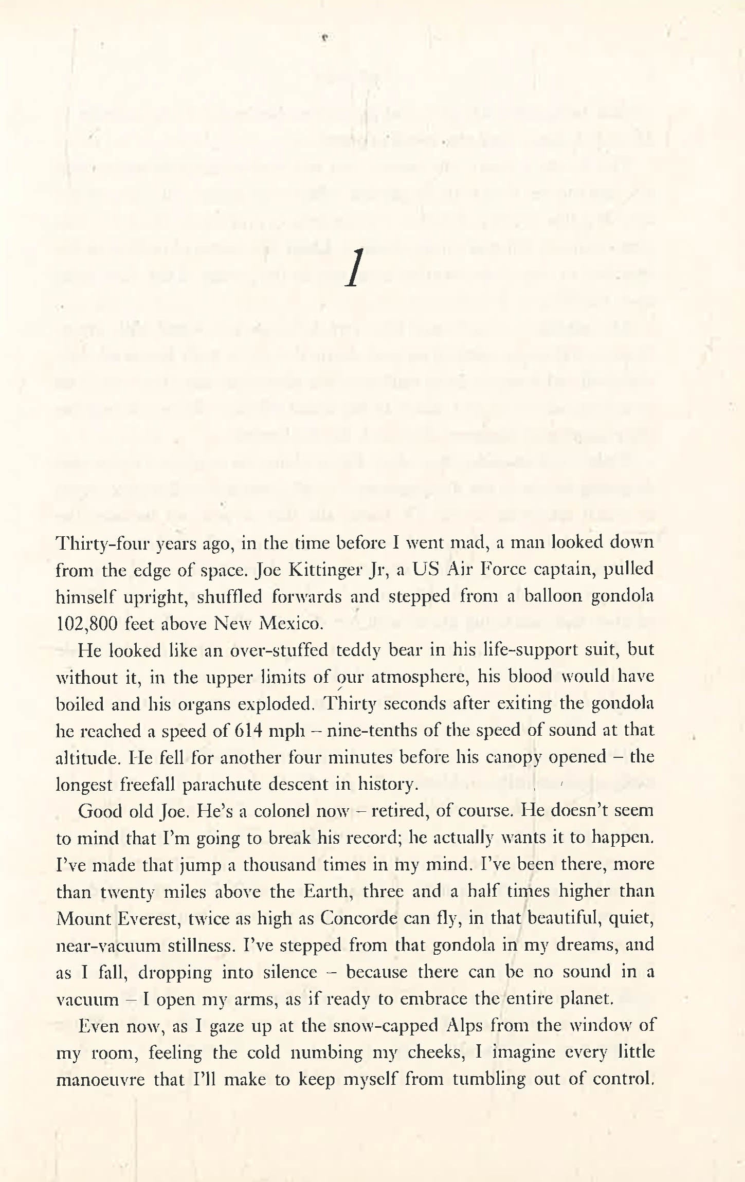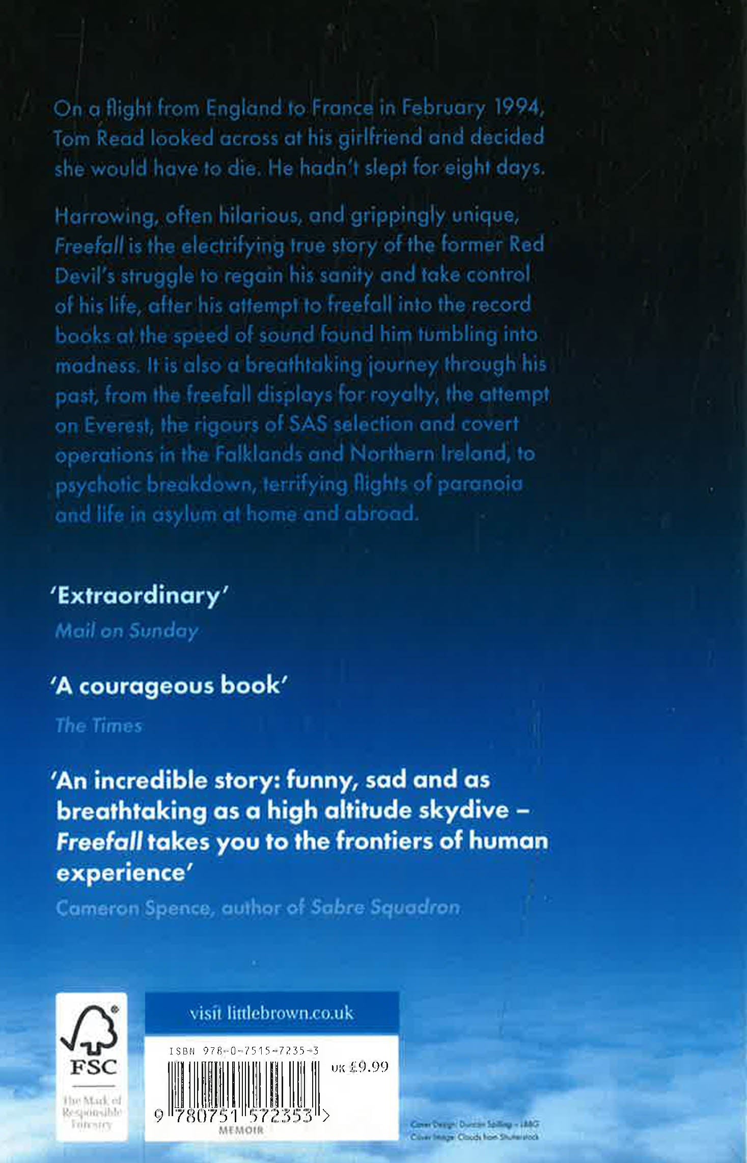A former member of the British Parachute Regiment, Tom Read was preparing to freefall from more than 23 miles above the earth to become the first man to punch a hole through the sound barrier unassisted. It didn't work out that way. From his hospital bed in a French sanatorium, Tom began to review his life in an attempt to trace the roots of his madness: the tough childhood, moving from place to place; joining the Parachute Regiment at seventeen and confronting riots, IRA snipers and booby-traps; doing more than 1,000 jumps with the Red Devils and the first ever Parachute drop onto the Falklands; and the high-altitude work that may have created a chemical imbalance in his brain.
