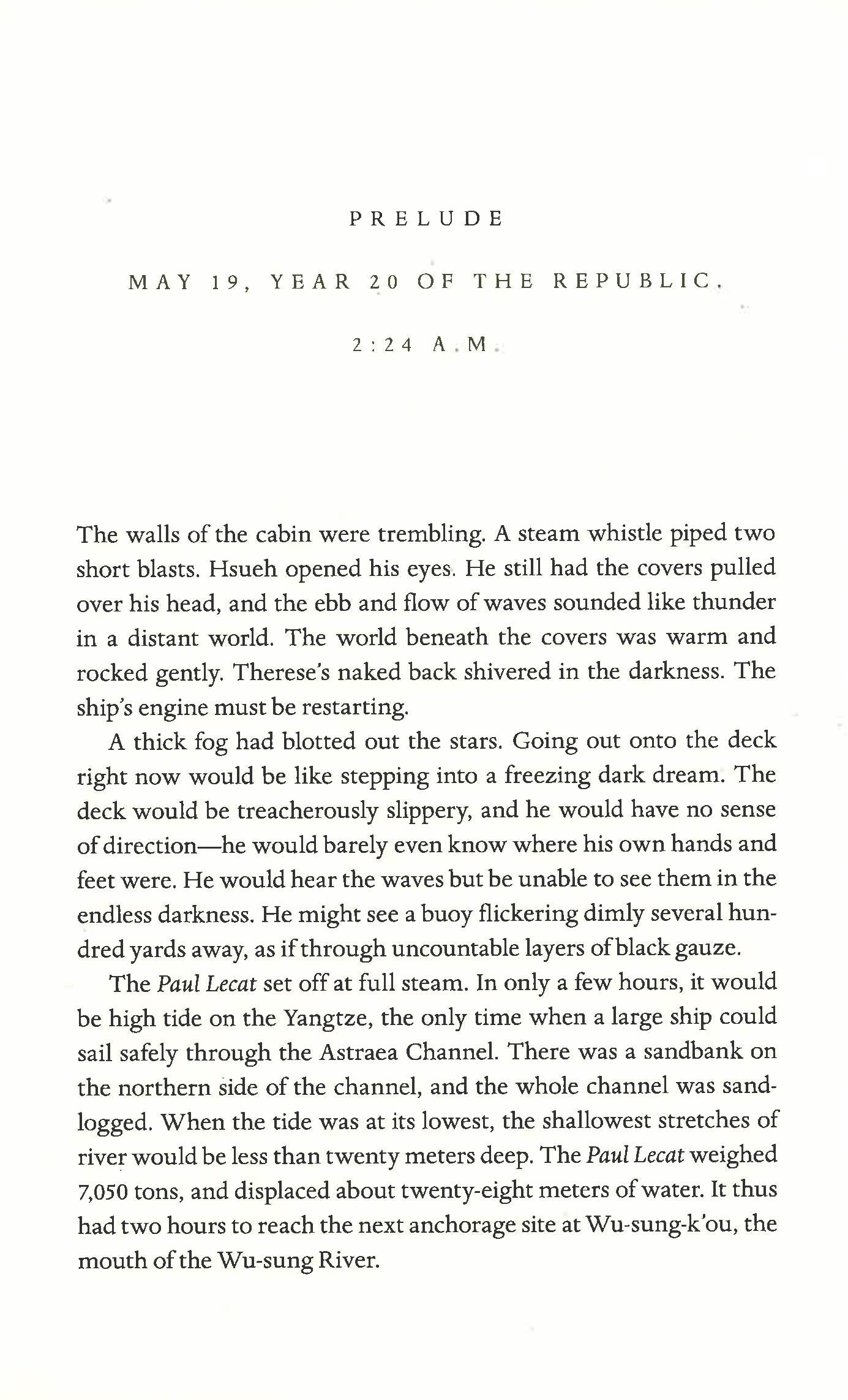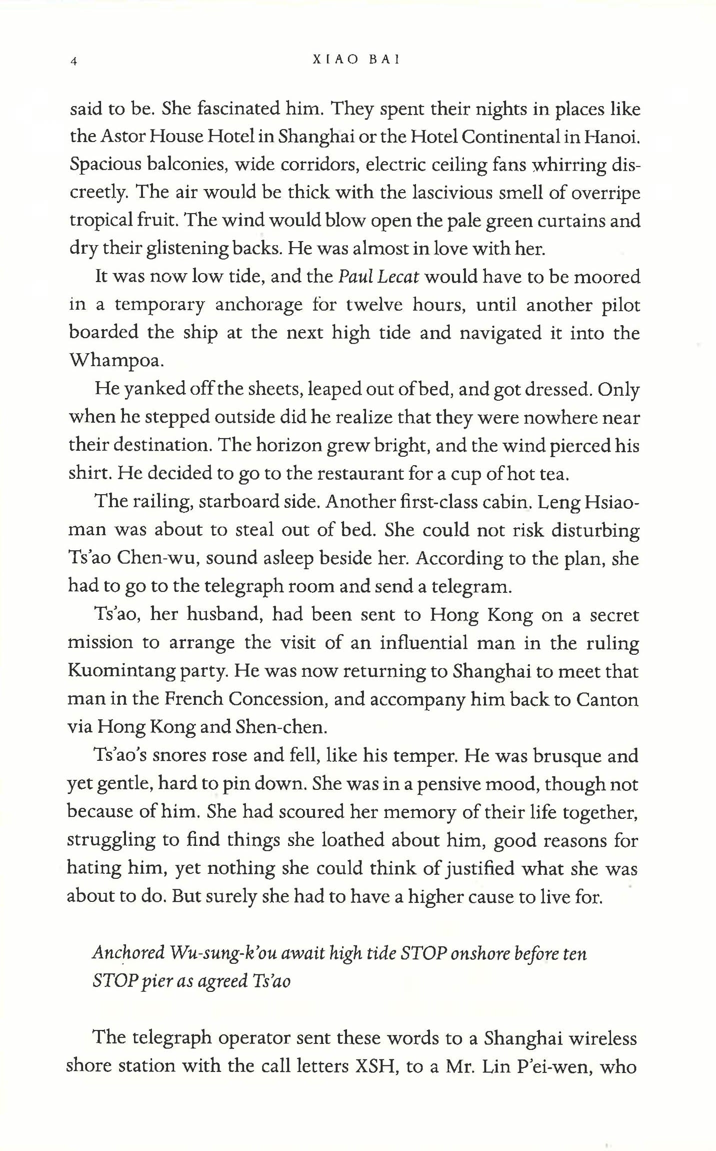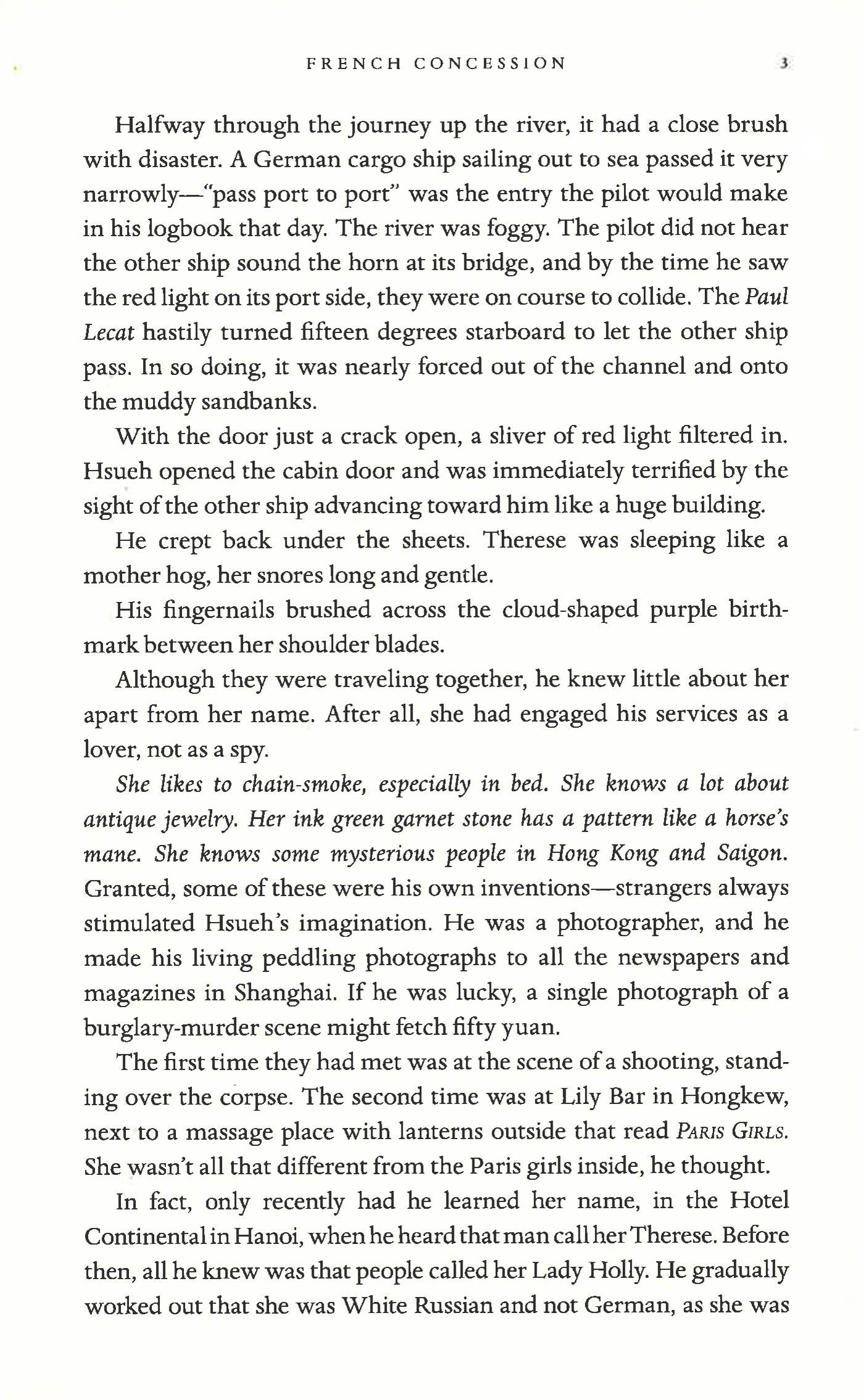 An acclaimed Chinese writer makes his English-language debut with this heart-stopping literary noir, a richly atmospheric tale of espionage and international intrigue, set in Shanghai in 1931-an electrifying, decadent world of love, violence and betrayal filled with femme fatales, criminals, revolutionaries and spies. A boat arrives in Shanghai harbour, carrying an important official in the Nationalist Party and his striking wife, Leng. Amid the raucous sound of firecrackers, gunshots ring out; an assassin has shot the official and then himself. Leng disappears in the chaos. Hsueh, a Franco-Chinese photographer aboard the same boat, became captivated by Leng's beauty and unconcealed misery. Now, she is missing. But Hsueh is plagued by a mystery closer to home: he suspects his White Russian lover, Therese, is unfaithful. Why else would she disappear so often on their recent vacation? When he's arrested for mysterious reasons in the French Concession and forced to become a police collaborator, he realizes that in the seamy, devious world of Shanghai, no one is who they appear to be.