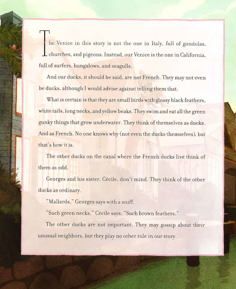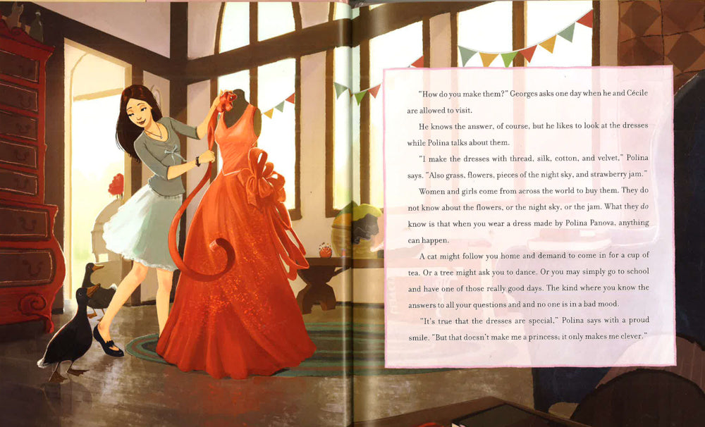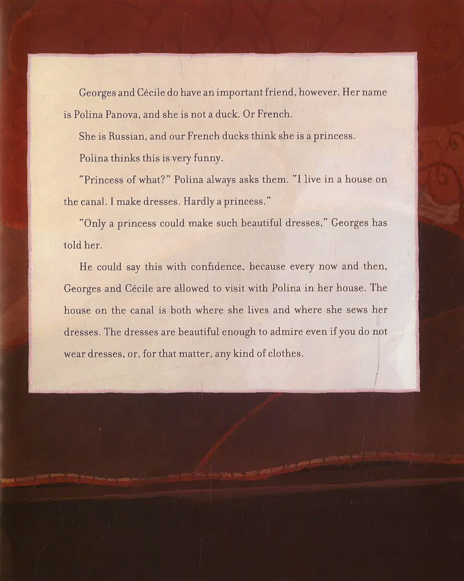 A magical, lyrical, beautifully illustrated tale about friendship and healing--and the joys and risks of staying open to love, even in the face of loss. Siblings George and Cecile live in Venice, California, but think of themselves as French ducks. They have an important friend, Polina Panova, who conjures magical dresses of thread, silk, and velvet . . . of grass, pieces of night sky, and strawberry jam. To the ducks, who delight in her daily visits, Polina is a princess. But when Polina's prince--who makes movies almost as luminous as her dresses--decides to go away, life on the canal changes, and so does Polina. What are two steadfast and affectionate French ducks to do? Save admit that every broken heart mends on its own time, in its own way? From an acclaimed Y A author and a talented debut illustrator comes a storybook classic full of light and hush, wisdom and whimsy, about patient friendship and the healing power of time.