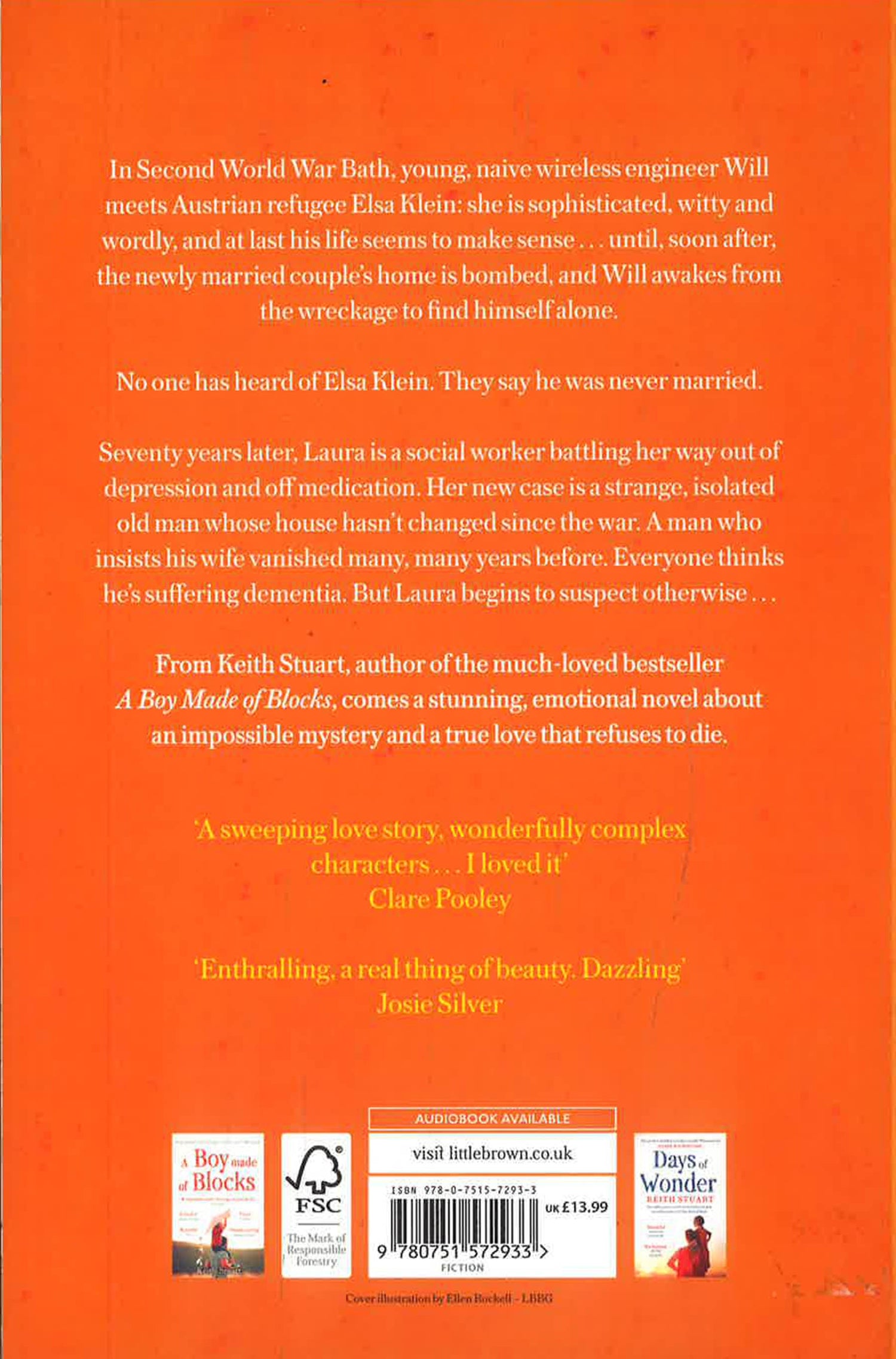 'Enthralling, a real thing of beauty. Dazzling' -- JOSIE SILVER In Second World War Bath, young, naive wireless engineer Will meets German refugee Elsa Klein: she is sophisticated, witty and wordly, and at last his life seems to make sense . . . until, soon after, the newly married couple's home is bombed, and Will awakes from the wreckage to find himself alone. No one has heard of Elsa Klein. They say he was never married. Seventy years later, Laura is a social worker battling her way out of depression and off medication. Her new case is a strange, isolated old man whose house hasn't changed since the war. A man who insists his wife vanished many, many years before. Everyone thinks he's suffering dementia. But Laura begins to suspect otherwise . . . From Keith Stuart, author of the much-loved Richard & Judy bestseller A Boy Made of Blocks, comes a stunning, emotional novel about an impossible mystery and a true love that refuses to die.