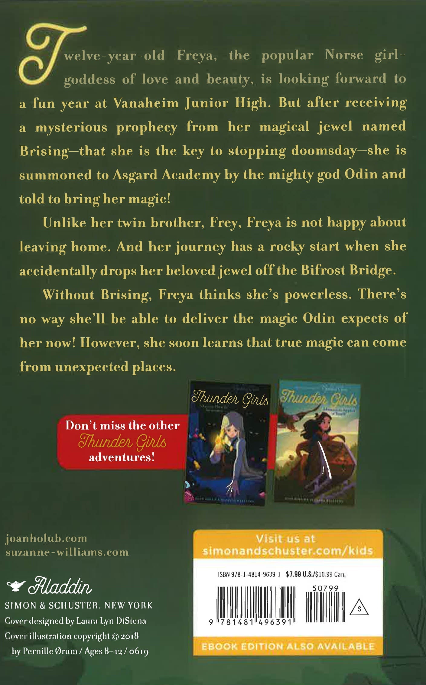 From the authors of the Goddess Girls series comes the first book in a brand-new series steeped in Norse mythology, magic, adventure, and friendship. "Gold and Gullveig I cannot see. But here is a vision that comes to me; Adventure for you is about to start. Near Asgard you must find the heart. A Secret world there hides away, which holds the power to stop doomsday!" When eleven-year-old Freya hears that prophecy from her magical jewel, she isn't sure what to make of it. Doomsday? She will find the key? Mere seconds after that prediction, she receives a mysterious invitation to Asgard Academy from the powerful Odin, who commands her to "bring her magic" to Asgard. With encouragement from her twin, Frey, Freya reluctantly heads out on their new adventure. And Freya's first challenge begins before she even steps foot in Asgard. While trying to navigate the treacherous Bifrost Bridge, she drops her magical jewel off the bridge, and a sneaky pair of dwarves take her jewel down to the world of Midgard! Without that jewel, Freya thinks she is powerless. But with the help of her pod-mates at Asgard, Freya discovers a world that is bigger and more mysterious that she ever imagined! There, she learns the true terror that Ragnarok--the doomsday her jewel warned her about--could mean for Asgard Academy if she and her new friends, the Thunder Girls, don't stop it!