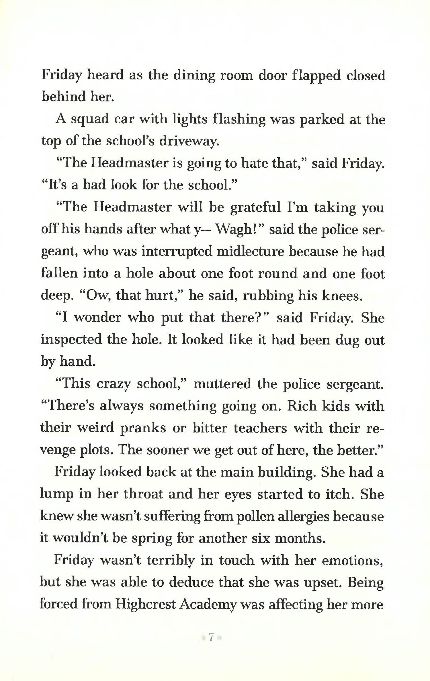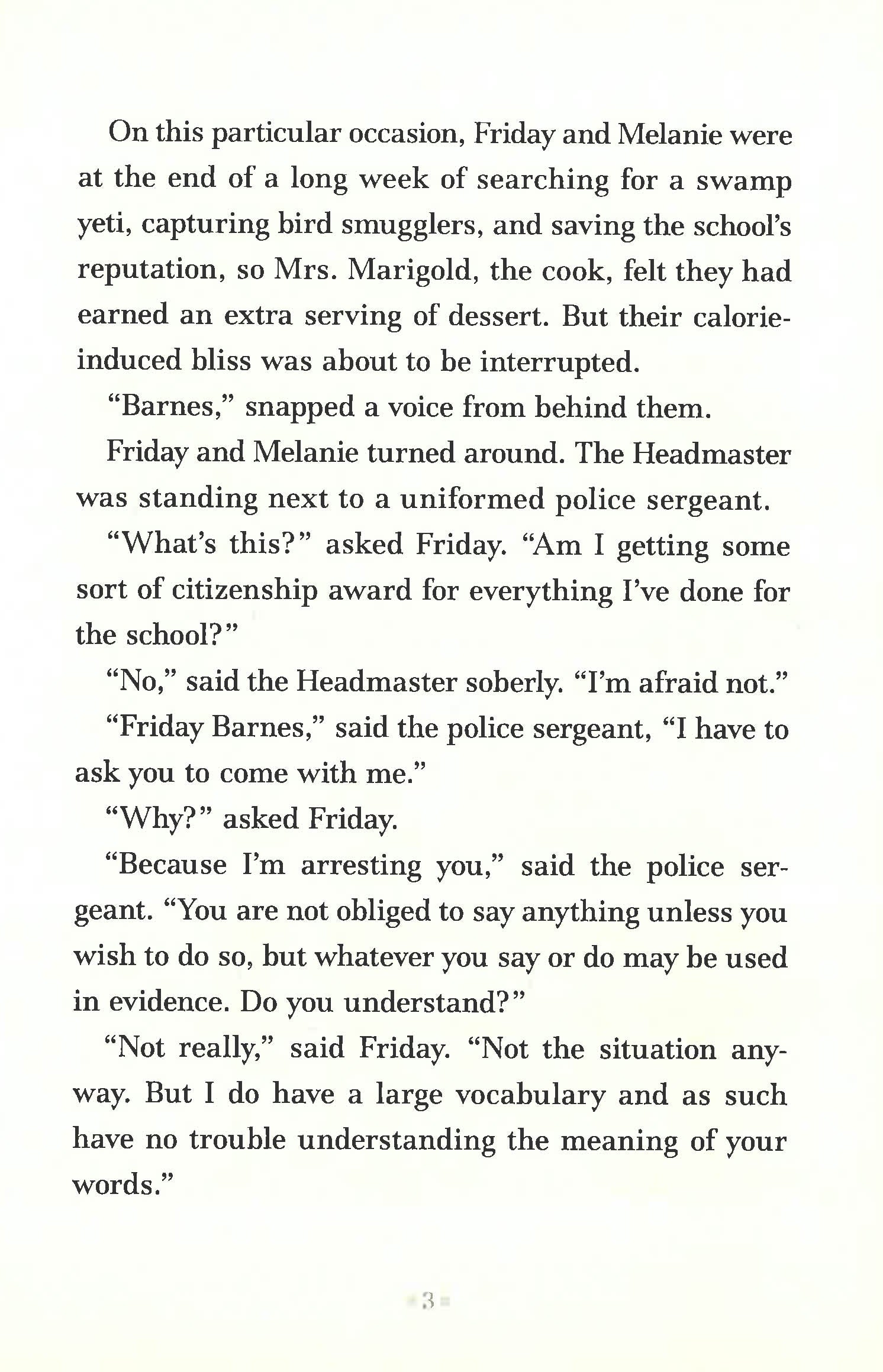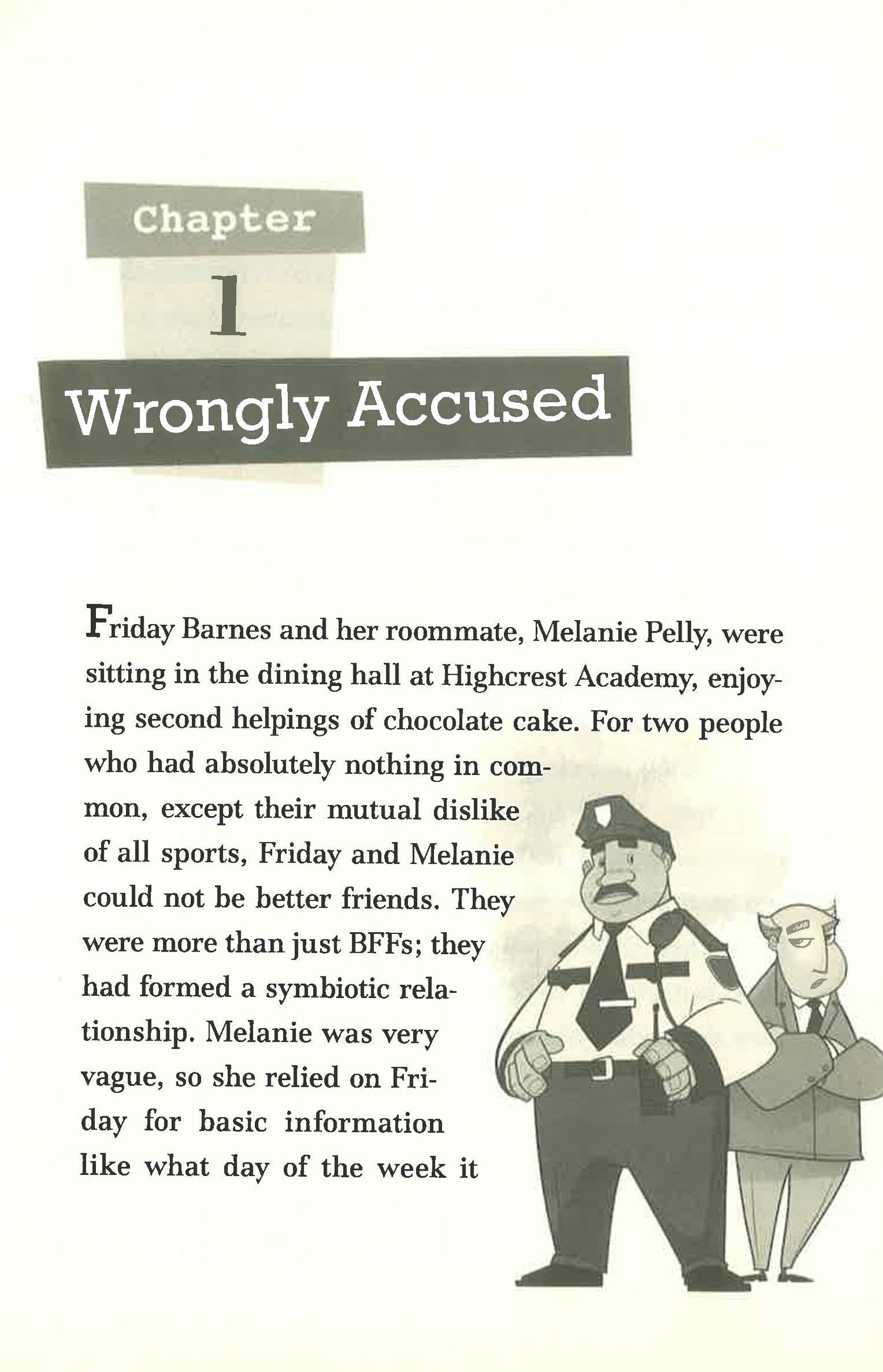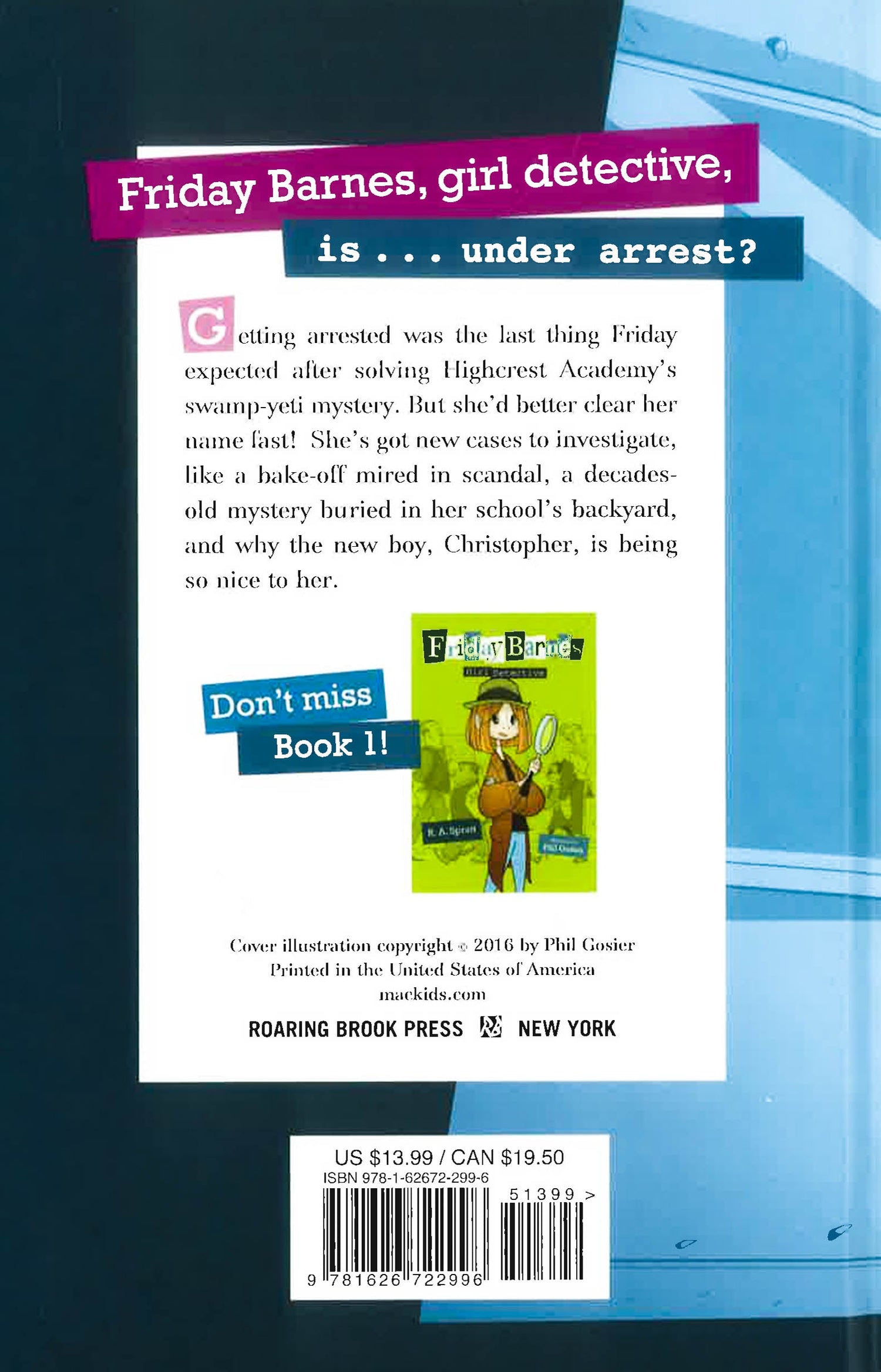 Friday Barnes, girl detective, is . . . under arrest? Getting arrested was the last thing Friday expected after solving Highcrest Academy's swamp-yeti mystery. But she'd better clear her name fast! She's got new cases to investigate, like a bake-off mired in scandal, a decades-old mystery buried in her school's backyard, and why the new boy, Christopher, is being so nice to her.