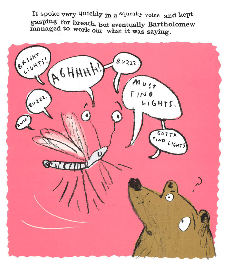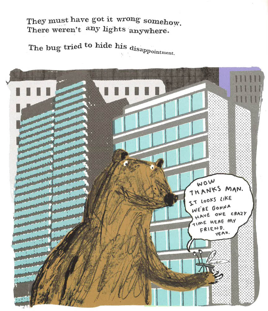 Bartholomew leads a quiet life. But he is a kindly sort of bear, so when his new friend, the Bug, is in a tremendous hurry to find the bright lights, he decides to help him on his way. Bear soon finds himself in the big city, which is like nothing he's ever known before. But why is Bug in such a hurry?