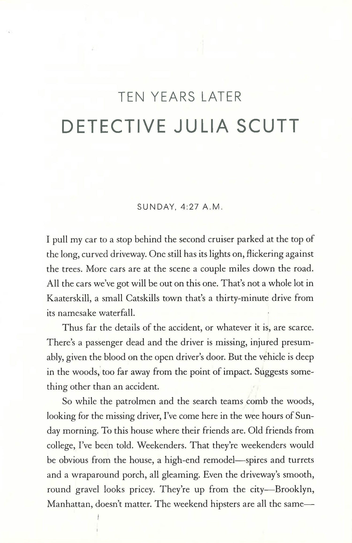 But Keith has unexpectedly brought along his most famous client, Finch, a charismatic trickster who senses the group&;s fault lines and buried secrets and wastes no time exploiting them. By early Sunday morning, it&;s all over&;one friend is dead, another missing. The rest are paralyzed by fear. At least they seem to be. Astute and ambitious, Kaaterskill Detective Julia Sternbach is very good at her job, in spite of the demons from her past that the case has awakened. As Julia digs deeper, she begins to question if the real threat lies outside the mansion&;s imposing walls, or within&;and just how far these friends, forever bonded by love and loyalty, will go to protect one another, and hide the truth.