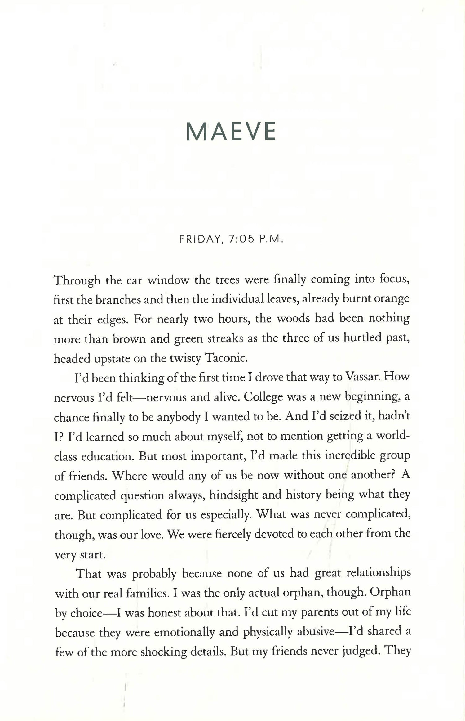 On a Friday evening in September, five college friends arrive at an idyllic manor house in the Catskill Mountains for a bachelor party. At least, that&;s the cover story. Jonathan is marrying Peter, that part is true. But this is not a celebratory reunion; it&;s a staged intervention for Keith, a successful art dealer caught in a harrowing downward spiral of opioid addiction. His friends &;Jonathan, Stephanie, Maeve and Derrick&;have 48 hours to convince him to check into rehab or he will lose his business and much more. Still haunted by the mysterious death of another friend, Alice, during their senior year in college, the group refuses to stand by as Keith destroys himself; deep down, they hope that saving him might make up for having failed Alice. The friends blame themselves for her death. And, the truth is, maybe they should.