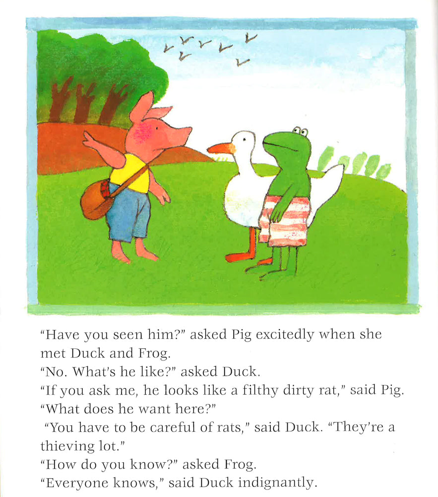 When Rat comes to live at the edge of their wood, the animals decide they don't like having a stranger in their midst. But Frog is friendly by nature, and decides to find out if Rat is really as unpleasant as he is made out to be. As Frog discovers, Rat is intelligent and good hearted, and proves in a series of unexpected emergencies that the other animals have been too quick to condemn him.