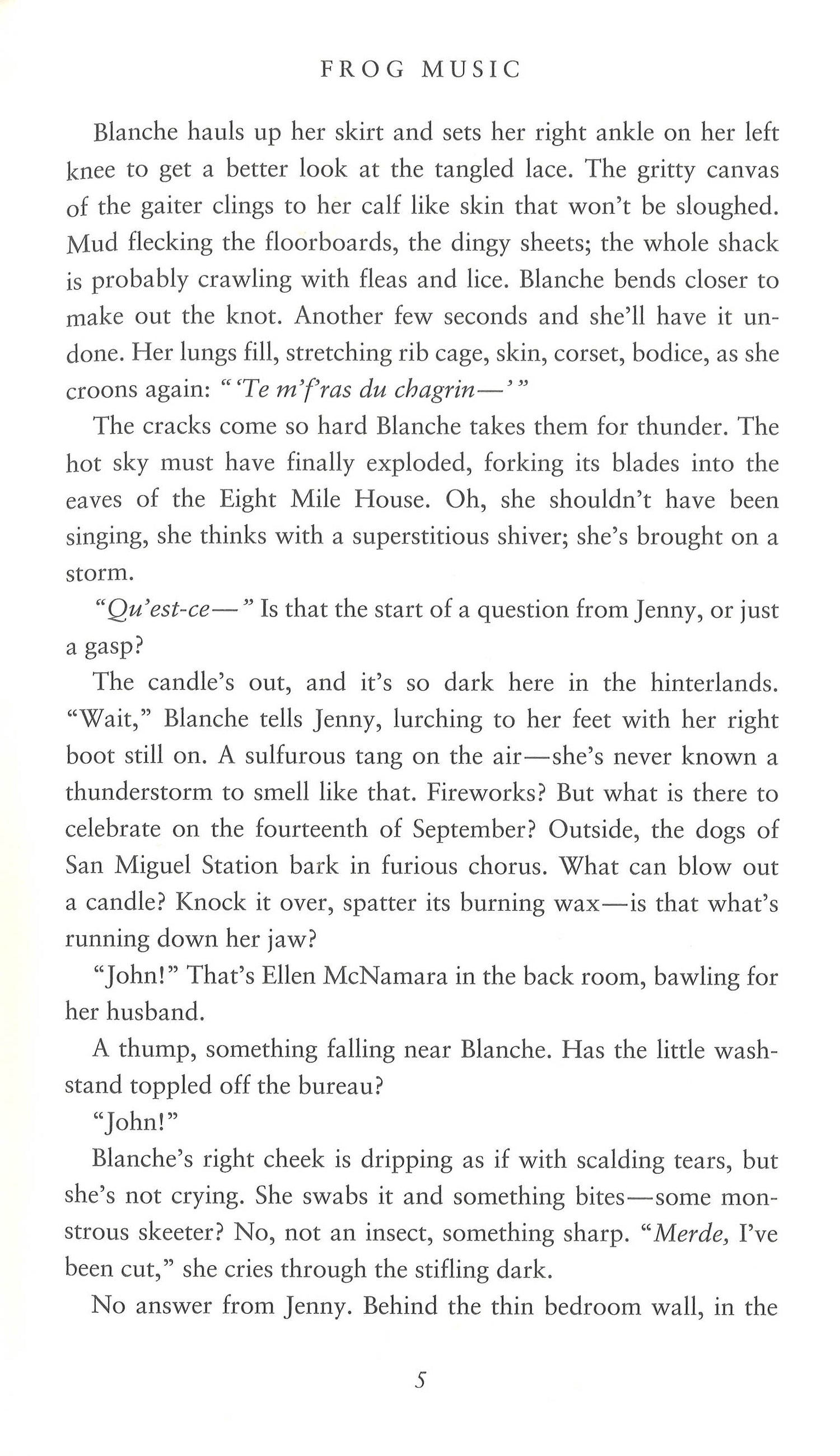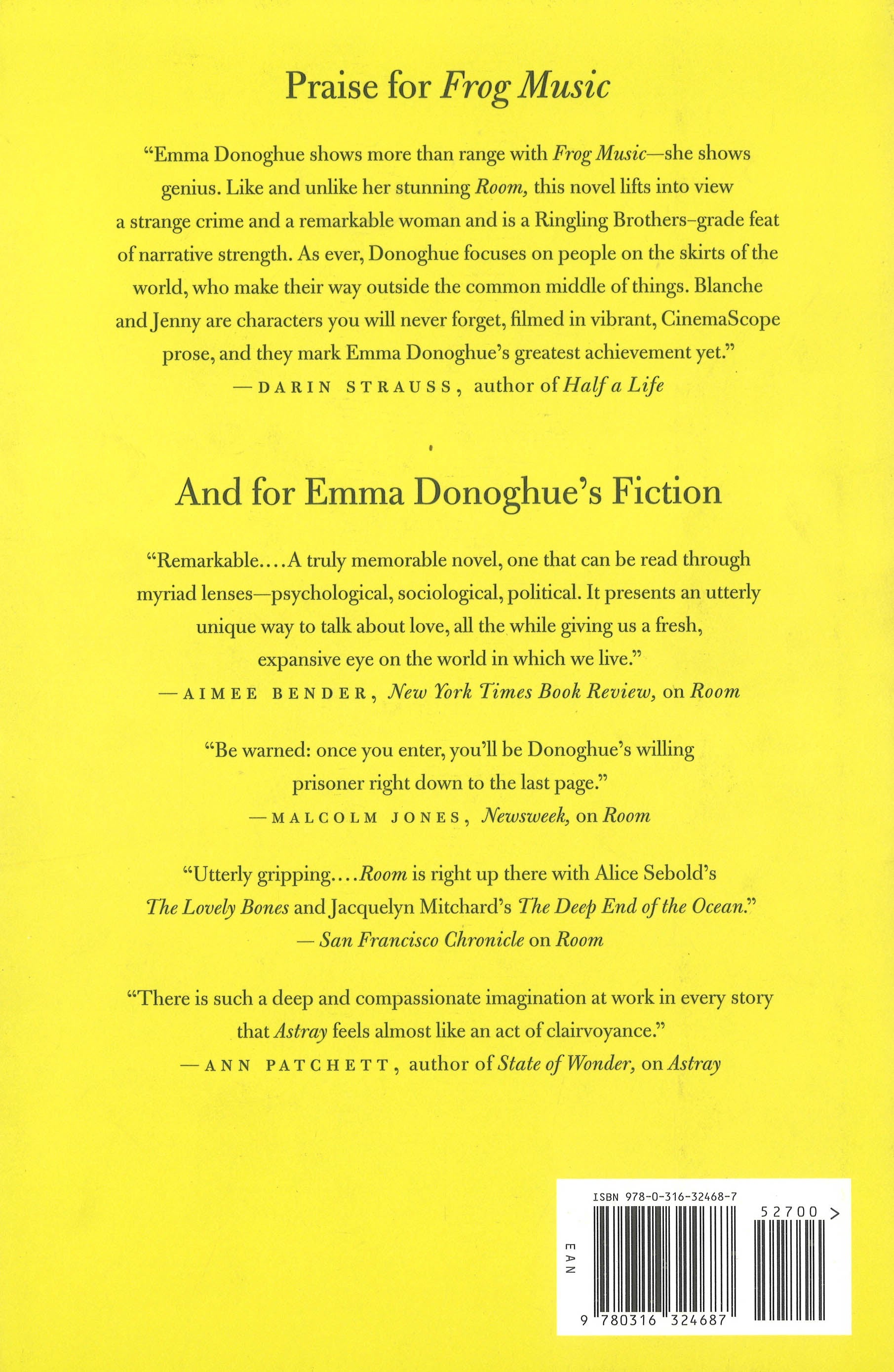From the author of the worldwide bestseller Room "Her greatest achievement yet...Emma Donoghue shows more than range with FROG MUSIC--she shows genius." -- Darin Strauss, author of Half a Life Summer of 1876: San Francisco is in the fierce grip of a record-breaking heat wave and a smallpox epidemic. Through the window of a railroad saloon, a young woman named Jenny Bonnet is shot dead. The survivor, her friend Blanche Beunon, is a French burlesque dancer. Over the next three days, she will risk everything to bring Jenny's murderer to justice--if he doesn't track her down first. The story Blanche struggles to piece together is one of free-love bohemians, desperate paupers, and arrogant millionaires; of jealous men, icy women, and damaged children. It's the secret life of Jenny herself, a notorious character who breaks the law every morning by getting dressed: a charmer as slippery as the frogs she hunts. In thrilling, cinematic style, FROG MUSIC digs up a long-forgotten, never-solved crime. Full of songs that migrated across the world, Emma Donoghue's lyrical tale of love and bloodshed among lowlifes captures the pulse of a boomtown like no other.
