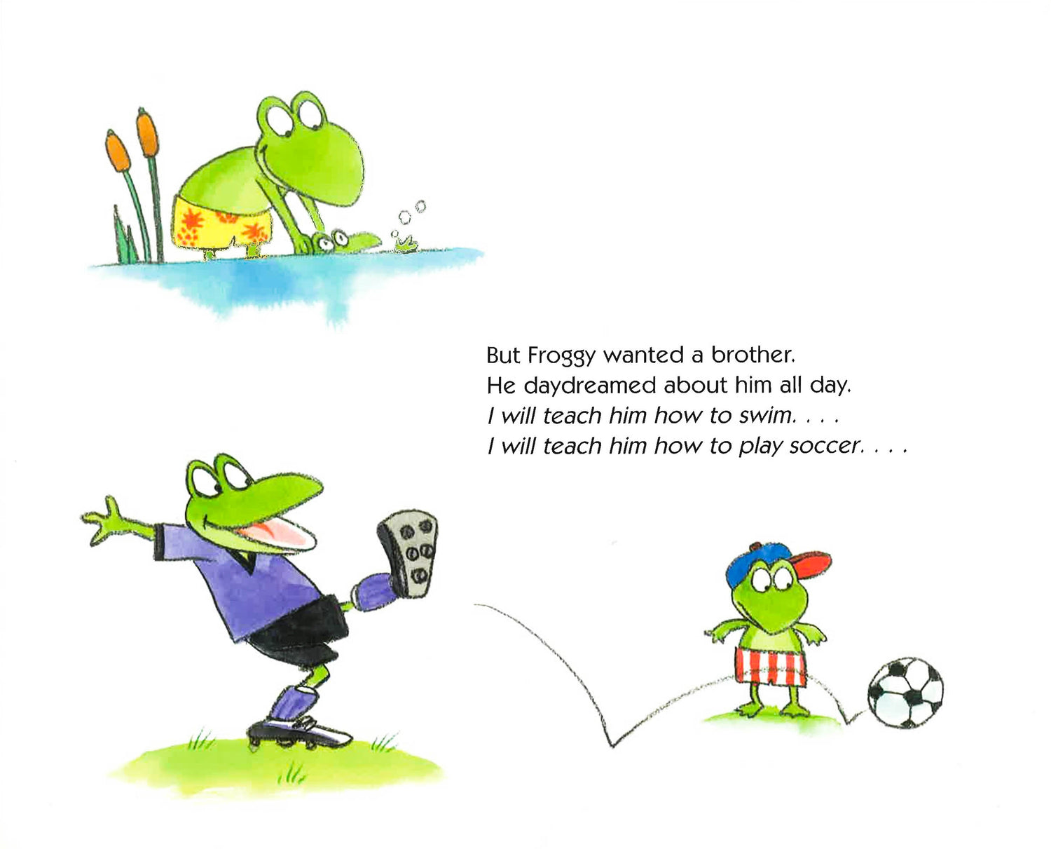 Froggy can't wait until his little brother is born. When he ends up with a sister instead, he is disappointed at first, especially since she's too little to play with. But as Pollywogilina gets older, Froggy begins to take care of her, and discovers that sisters can be fun too!