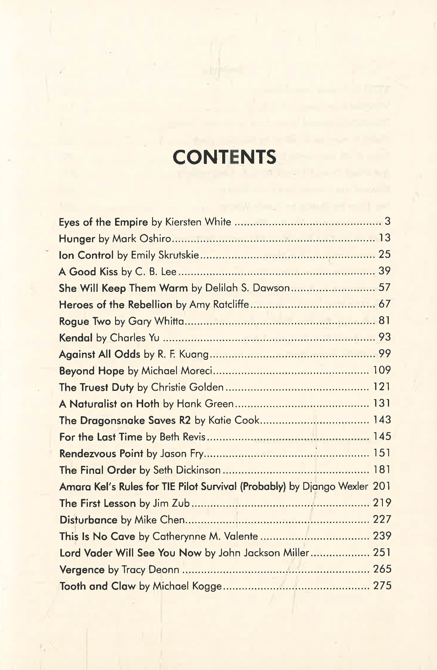 Tom Angleberger, Sarwat Chadda, S.A. Chakraborty, Mike Chen, Adam Christopher, Katie Cook, Zoraida Córdova, Delilah S. Dawson, Alexander Freed, Jason Fry, Christie Golden, Rob Hart, Lydia Kang, Michael Kogge, R. F. Kuang, C. B. Lee, Mackenzi Lee, John Jackson Miller, Michael Moreci, Daniel José Older, Amy Ratcliffe, Beth Revis, Lilliam Rivera, Cavan Scott, Emily Skrutskie, Karen Strong, Anne Toole, Catherynne M. Valente, Django Wexler, Kiersten White, Gary Whitta, Brittany N. Williams, Charles Yu, Jim Zub