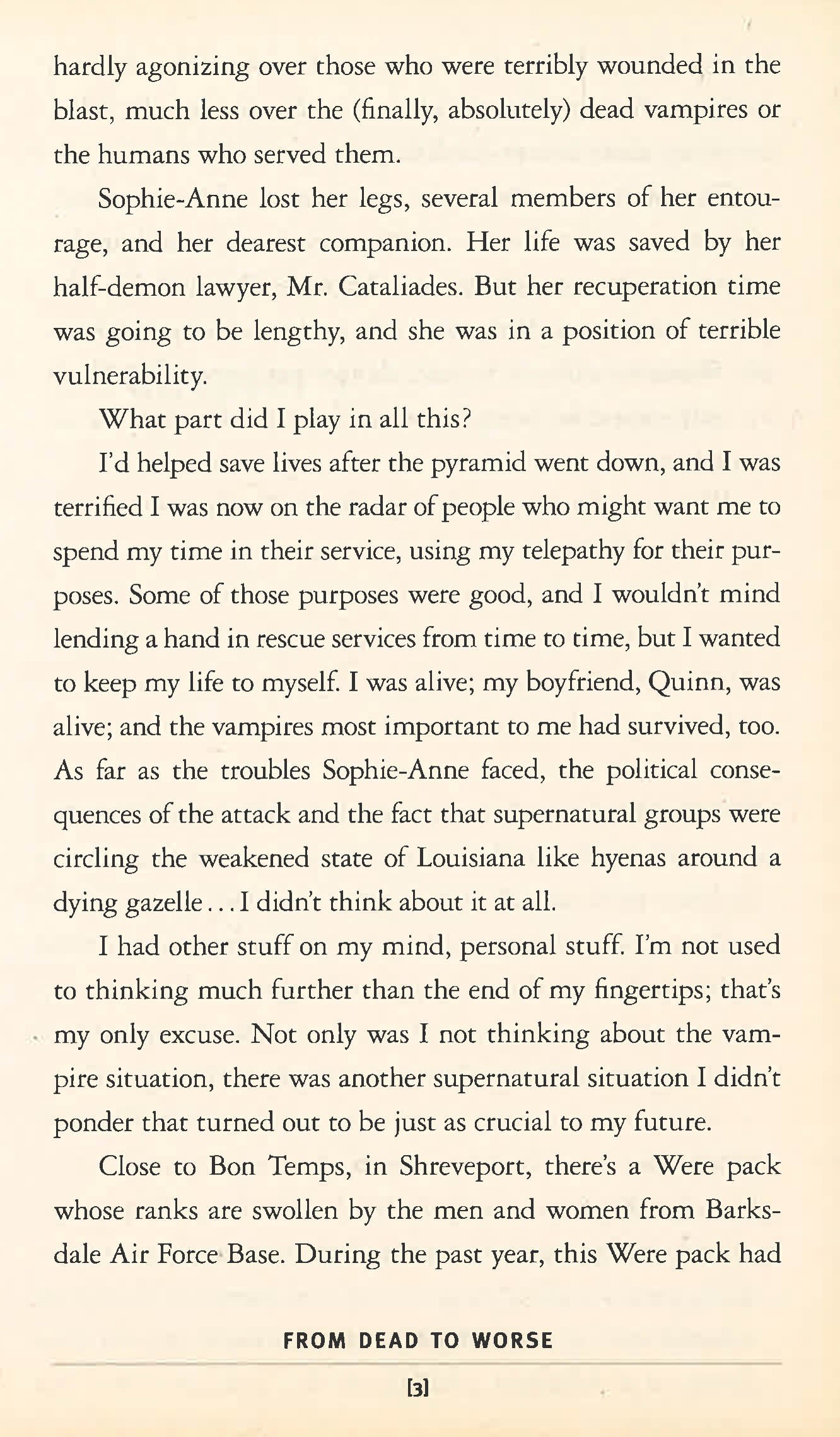 The supernatural community in Bon Temps, Louisiana is reeling from two hard blows: the natural disaster of Hurricane Katrina, and the manmade horror of the explosion at the vampire summit in the up-north city of Rhodes. Sookie Stackhouse is safe but dazed, and she's yearning for things to get back to normal. But that's just not happening. Too many vampires - some friends, some not - were killed or injured, and her were-tiger boyfriend Quinn is among the missing. It's clear that things are changing, whether the weres and vamps like it or not. And Sookie, Friend to the Pack, blood-bonded to the leader of the local vampire community, is caught up in those changes. She's about to find herself facing danger and death and, not for the first time, betrayal by someone she loves. And when the fur has finished flying and the cold blood has stopped flowing, Sookie's world will be forever altered ...