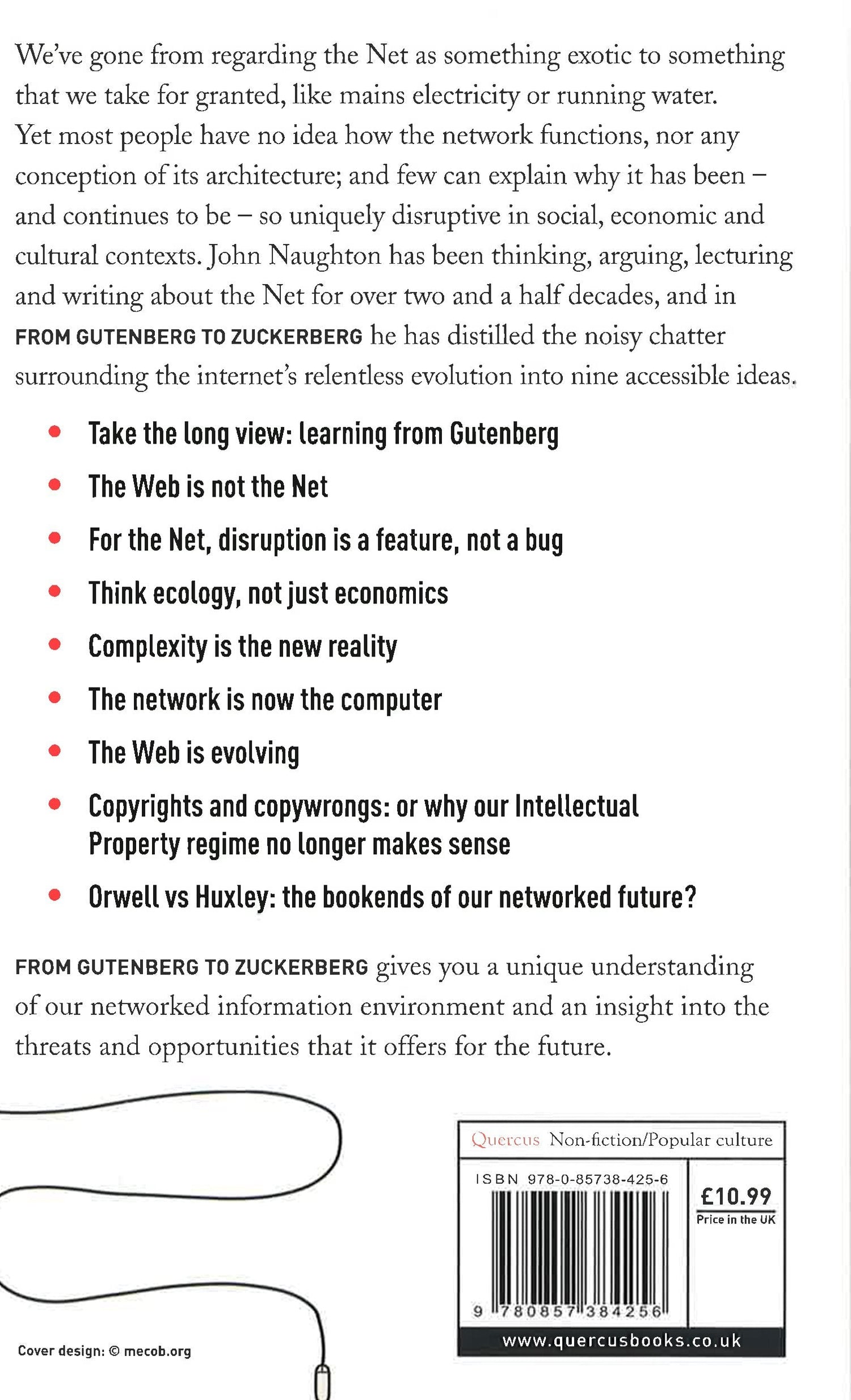 Our society has gone through a weird, unremarked transition: we've gone from regarding the Net as something exotic to something that we take for granted as a utilitarian necessity, like mains electricity or running water. In the process we've been remarkably incurious about its meaning, significance or cultural implications. Most people have no idea how the network works, nor any conception of its architecture; and few can explain why it has been - and continues to be - so uniquely disruptive in social, economic and cultural contexts. In other words, our society has become dependent on a utility that it doesn't really understand. John Naughton has distilled the noisy chatter surrounding the internet's relentless evolution into nine clear-sighted and accessible areas of understanding. In doing so he affords everyone the requisite knowledge to make better use of the technologies and networks around us, and see lucidly into their future implications. Along the way FROM GUTENBERG TO ZUCKERBERG covers areas as diverse as the science of complexity, the economics of abundance, the appeal of disruption and the problematic nature of intellectual property. FROM GUTENBERG TO ZUCKERBERG gives you all the basic, conceptual equipment you need to understand the Internet phenomenon.