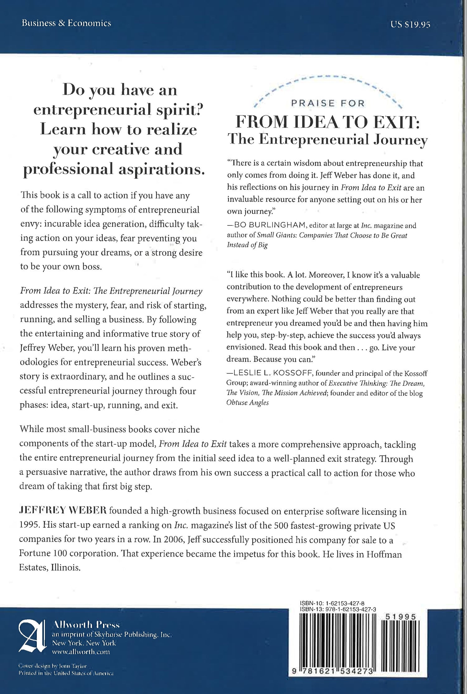 This book is a call to action if you have any of the following Symptoms of Entrepreneurial Envy: incurable idea generation; difficulty taking action on your ideas; fear, preventing you from pursuing your dreams; a strong desire to be your own boss. From Idea to Exit: The Entrepreneurial Journey addresses the mystery, fear, and risk of starting, running, and selling a business. By following the entertaining and informative true story of Jeffrey Weber, you'll learn his proven methodologies for entrepreneurial success. Jeffrey Weber's story is extraordinary and he outlines a successful entrepreneurial journey through four phases: idea, startup, running, and exit. While most small business books cover niche components of the start-up model, From Idea to Exit takes a more comprehensive approach, tackling the entire entrepreneurial journey from the initial seed idea through a well-planned exit strategy. Through a persuasive narrative, the author draws from his own success a practical call to action for those who dream of taking that first big step. Allworth Press, an imprint of Skyhorse Publishing, publishes a broad range of books on the visual and performing arts, with emphasis on the business of art. Our titles cover subjects such as graphic design, theater, branding, fine art, photography, interior design, writing, acting, film, how to start careers, business and legal forms, business practices, and more. While we don't aspire to publish a New York Times bestseller or a national bestseller, we are deeply committed to quality books that help creative professionals succeed and thrive. We often publish in areas overlooked by other publishers and welcome the author whose expertise can help our audience of readers.