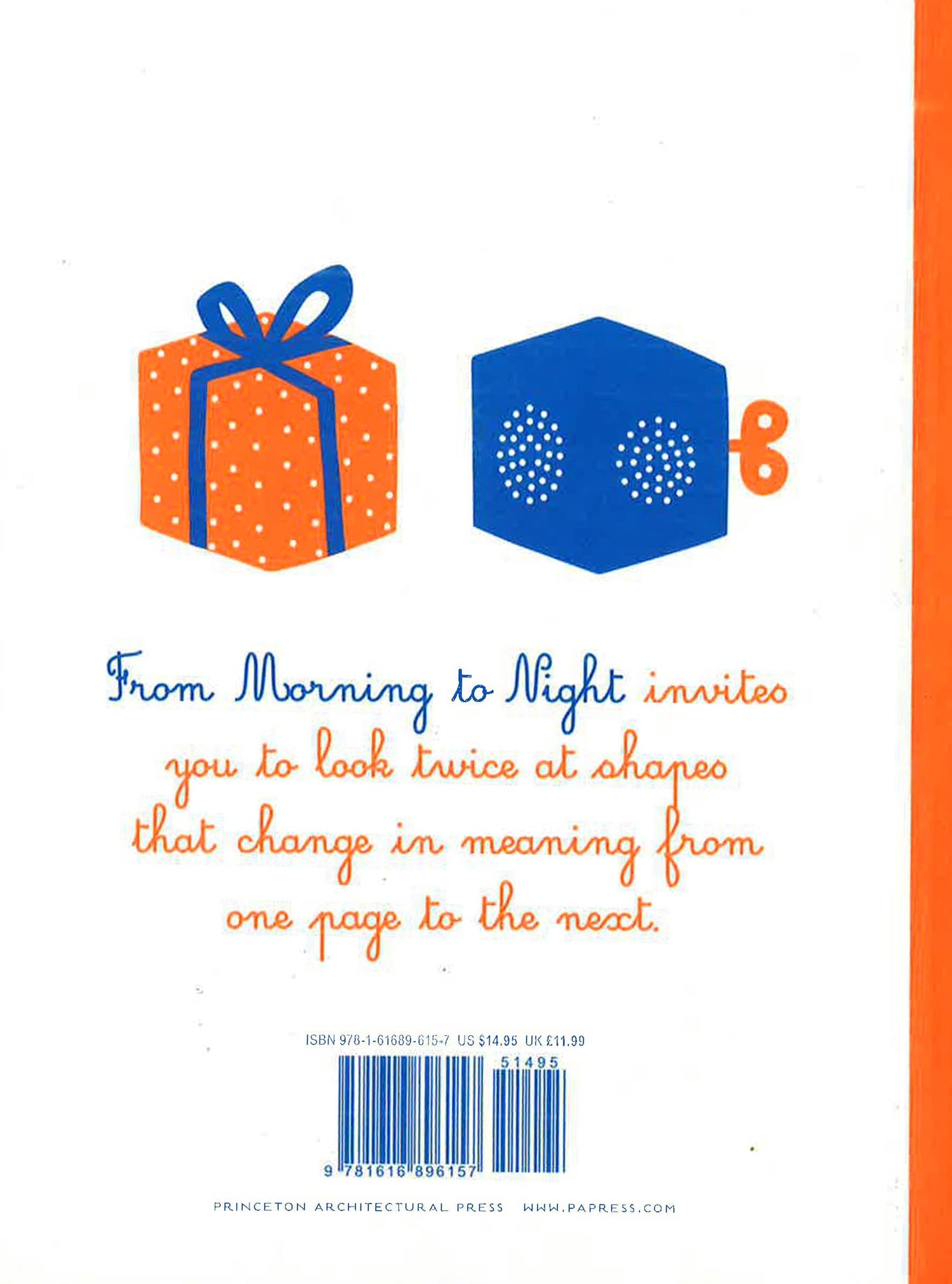 Things are rarely as they first seem, particularly when seen from a different angle, or in a different context. From Morning to Night asks children to look at familiar and simple shapes and notice how they change, one minute a mushroom, the next a cereal bowl, a planet becomes an orange,, a traffic cone, turned on its side, a wind sock. The result is an unusually handsome and clever book that reminds children and parents to look at things carefully and never to judge something (or someone) by its first appearance-wait a moment, look harder, or turn your head and it might be something completely different and unexpected.