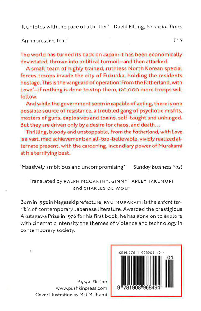 An ambitious, epic dystopian novel - part political thriller and part satire. From the Fatherland, with Love is set in an alternative, dystopian present in which the dollar has collapsed and Japan's economy has fallen along with it. The North Korean government, sensing an opportunity, sends a fleet of rebels in the first land invasion that Japan has ever faced. Japan can't cope with the surprise onslaught of Operation From the Fatherland, with Love . But the terrorist Ishihara and his band of renegade youths - once dedicated to upsetting the Japanese government - turn their deadly attention to the North Korean threat. They will not allow Fukuoka to fall without a fight. Epic in scale, From the Fatherland, with Love is laced throughout with Murakami's characteristically savage violence. It's both a satisfying thriller and a completely mad, over-the-top novel like few others. Translated by Ralph McCarthy, Charles De Wolf and Ginny Tapley Takemori, and published by Pushkin Press 'A troubled meditation on the soul of modern Japan... Alarmingly pertinent in light of current British politics... A morbidly funny comedy... Above all, it is a phenomenal feat of storytelling 700 pages, dozens of characters and scores of ideas woven into one gripping whole.' Andrzej Lukowski, Metro 'This is a novel by the other Murakami. Not Haruki... If Haruki is The Beatles of Japanese literature, Ryu is its Rolling Stones... [From the Fatherland, with Love] has a Tolstoyan cast of characters, from crack North Korean commandos and hapless Japanese bureaucrats to a gang of hoodlums who eventually decide to save Japan. It unfolds with the pace of a thriller...' David Pilling, Financial TImes 'Massively ambitious and uncompromising... prescient in unexpected ways' Joanne Hayden, Sunday Business Post ''[Mixes] the thrills of a spy novel with some national soul-searching' Lionel Barber, Financial Times, Summer Books 'Definitely edgier and darker than Haruki [Ryu Murakami] has a worldwide following and is regarded by many as one of the most thrilling writers of contemporary Japanese fiction... [He] offers a thrilling insight - with a geopolitical panoramic view - into national character, human relationships, chaos and disorder' - Tatevik Sargsyan, Hunger Magazine 'Like nothing else out there... a Japanese Tarantino... Highly addictive' Morpheus Tales Born in 1952 in Nagasaki prefecture, Ryu Murakami is the enfant terrible of contemporary Japanese literature. Awarded the prestigious Akutagawa Prize in 1976 for his first book, a novel about a group of young people drowned in sex and drugs, he has gone on to explore with cinematic intensity the themes of violence and technology in contemporary Japanese society. His novels include Coin Locker Babies, Sixty-Nine, Popular Hits of the Showa Era, Audition and In the Miso Soup. Murakami is also a screenwriter and a director; his films include Tokyo Decadence, Audition and Because of You.