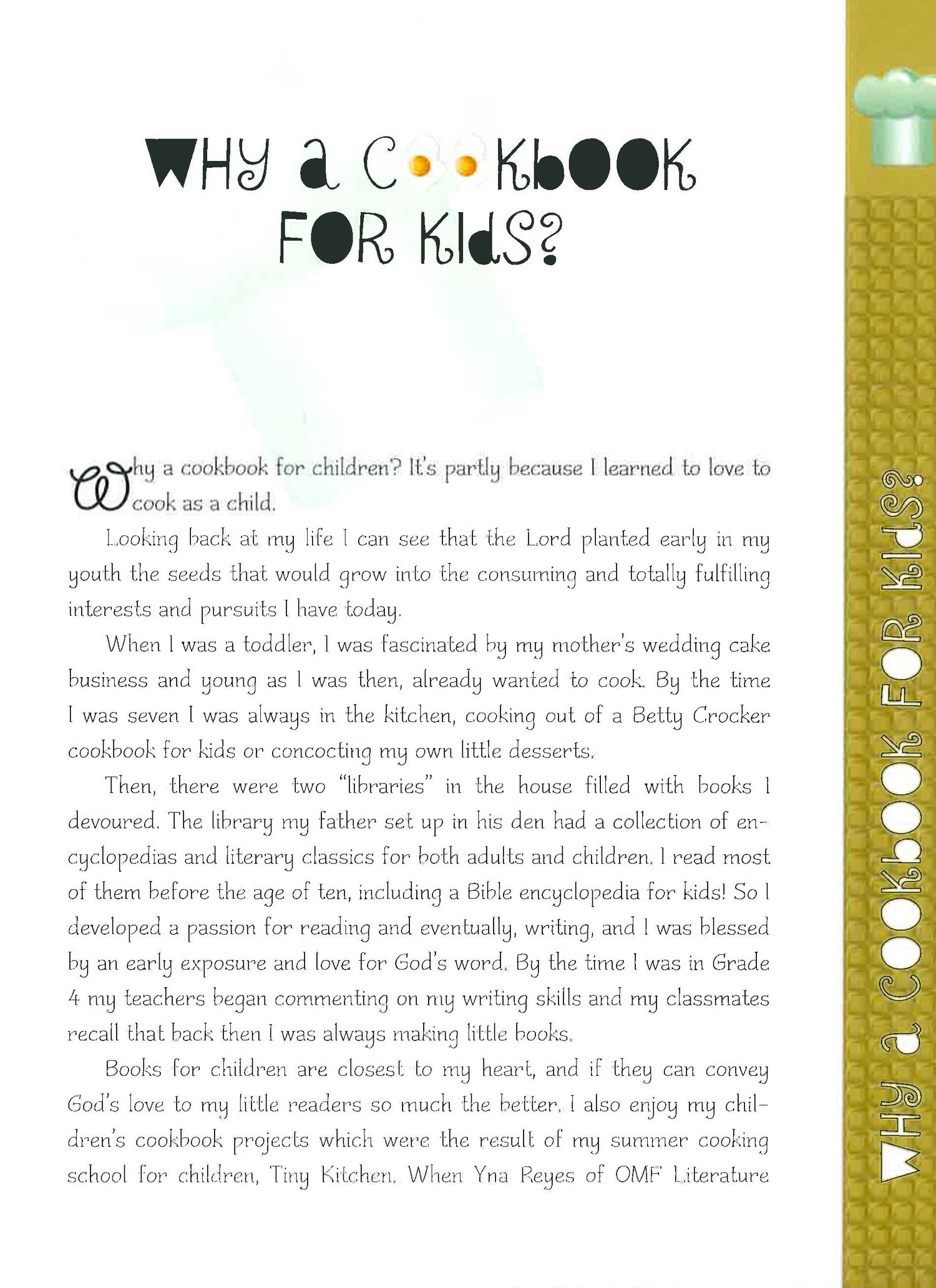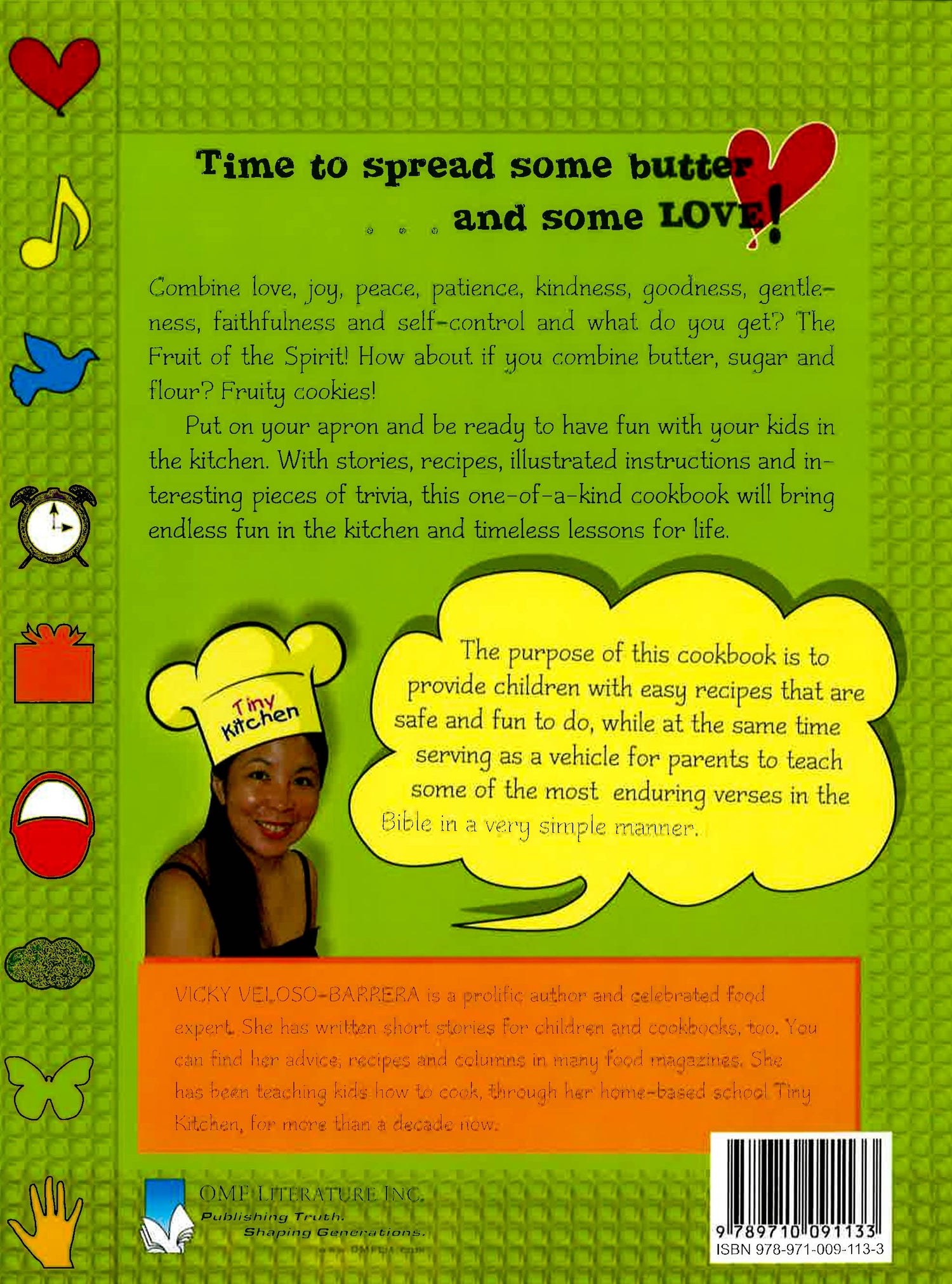 Combine love, joy, peace, patience, kindness, goodness, gentleness, faithfulness and self-control and what do you get? The Fruit of the Spirit! How about if you combine butter, sugar and flour? Fruity cookies! Put on your apron and be ready to have fun with your kids in the kitchen. With stories, recipes, illustrated instructions and interesting pieces of trivia, this one-of-a-kind cookbook will bring endless fun in the kitchen and timeless lessons for life. Features: - Contains easy to follow recipes (with illustrated instructions) that kids will definitely enjoy doing. - Informative; contains interesting trivia on well-loved foods - A great tool for parents to bond with their kids and at the same time, teach them about biblical truths - Book is spring bound for easy use/display while cooking.
